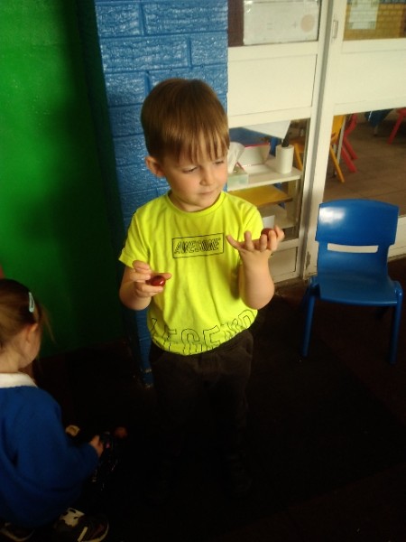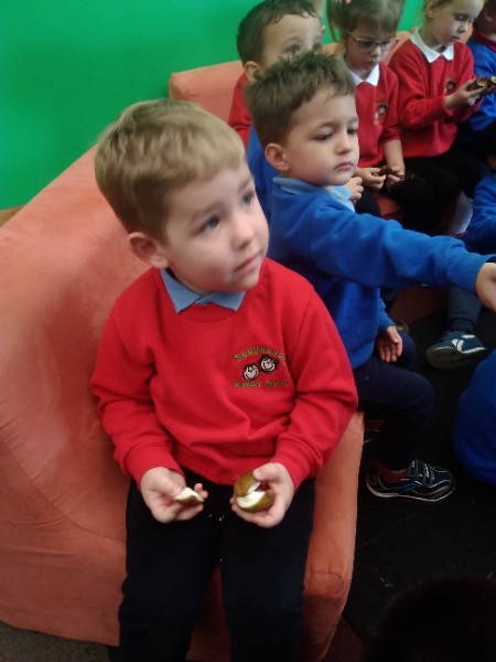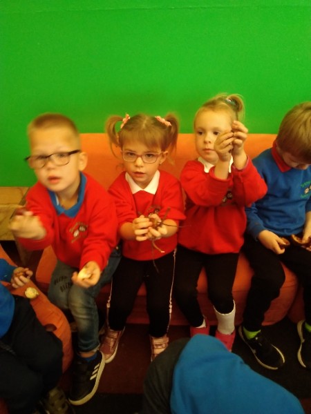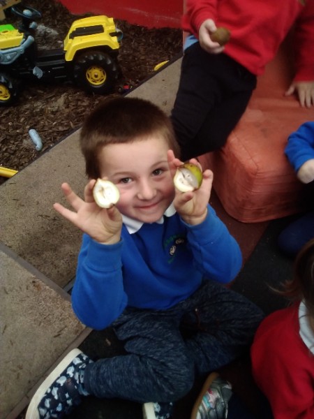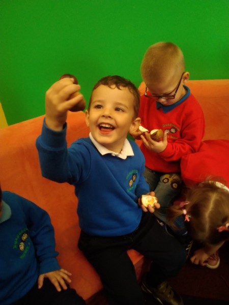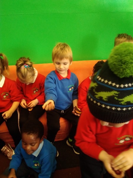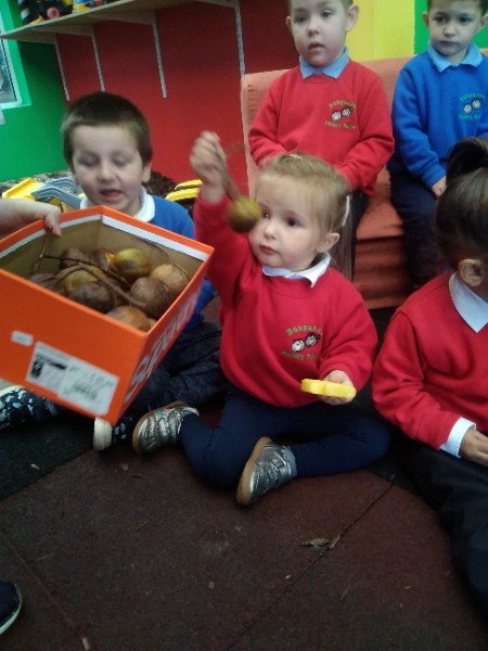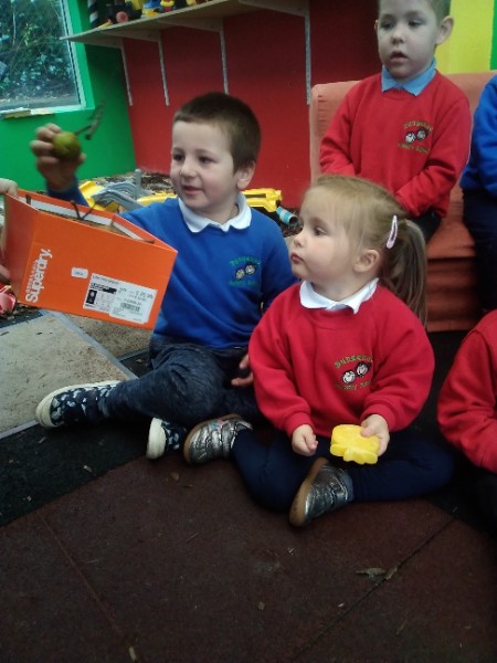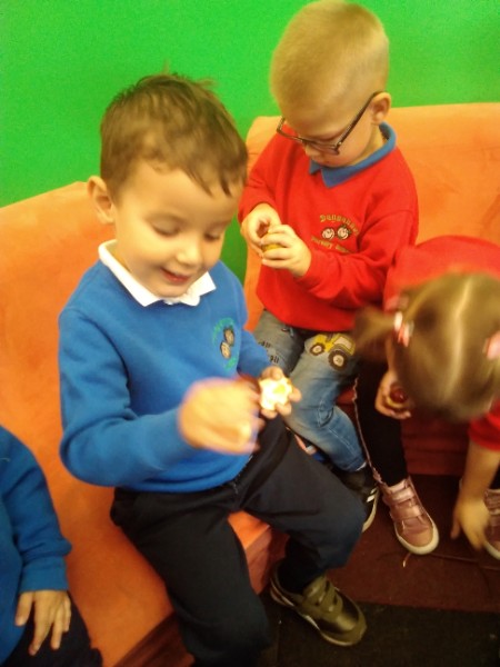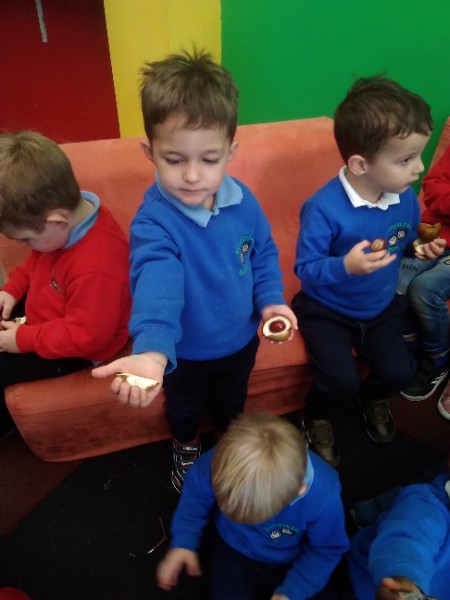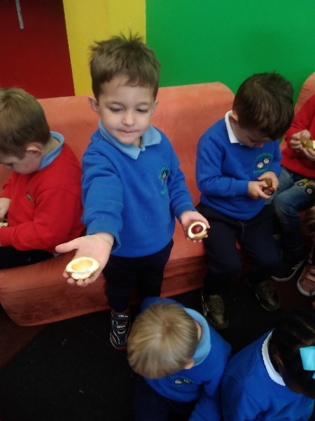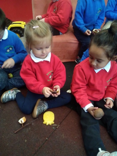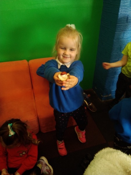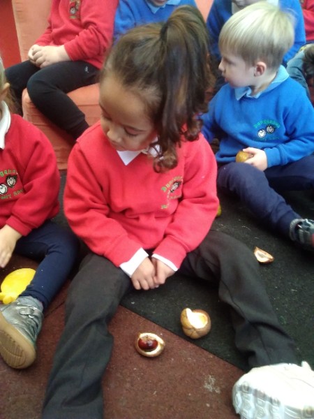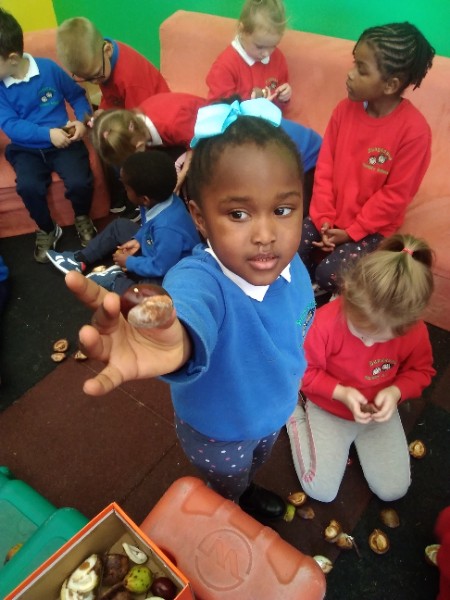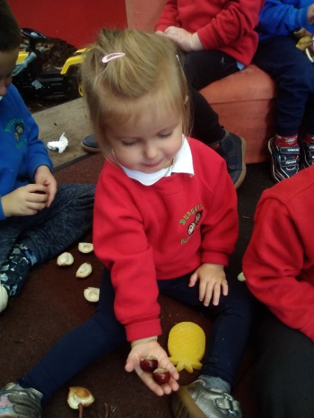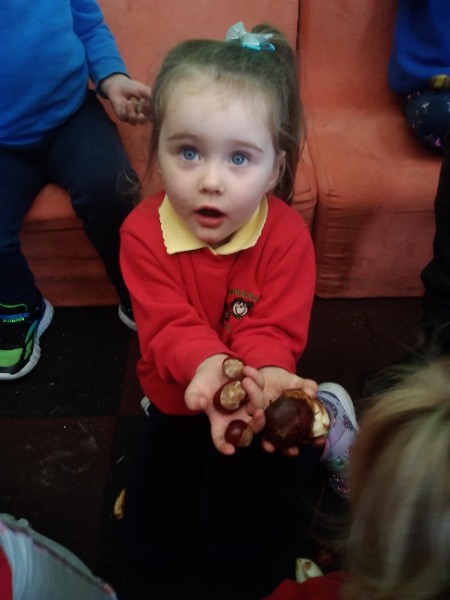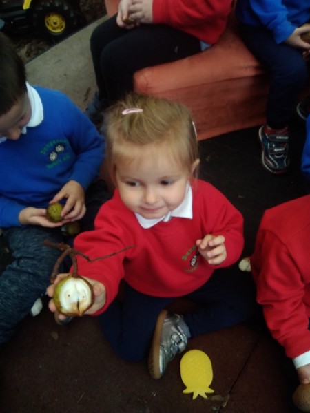Miss Park brought in some conkers for the children. We had great funny guessing what they could be. Maybe a coconut, maybe an apple maybe a potato. We used our strong finger muscles to open them up. What a surprise we found conkers. The children enjoyed rolling them down the ramp, counting them and exploring them. If you are in Dungannon Park you might find some more.
