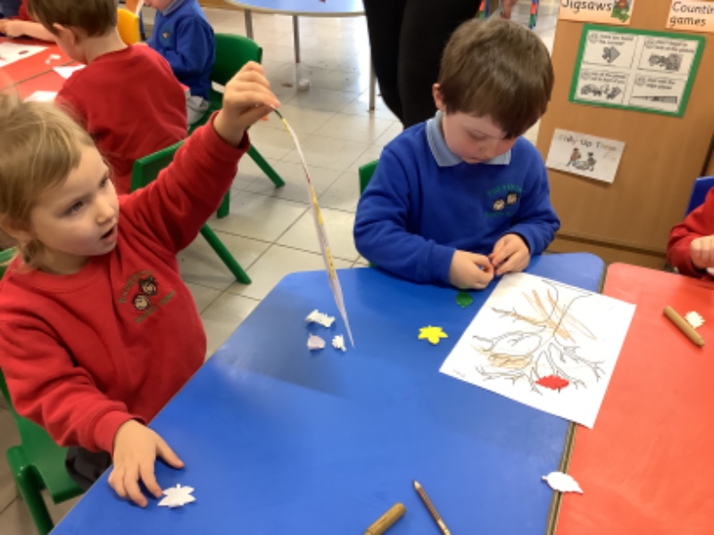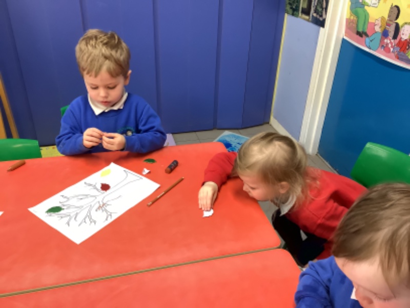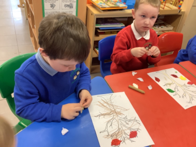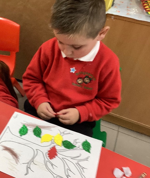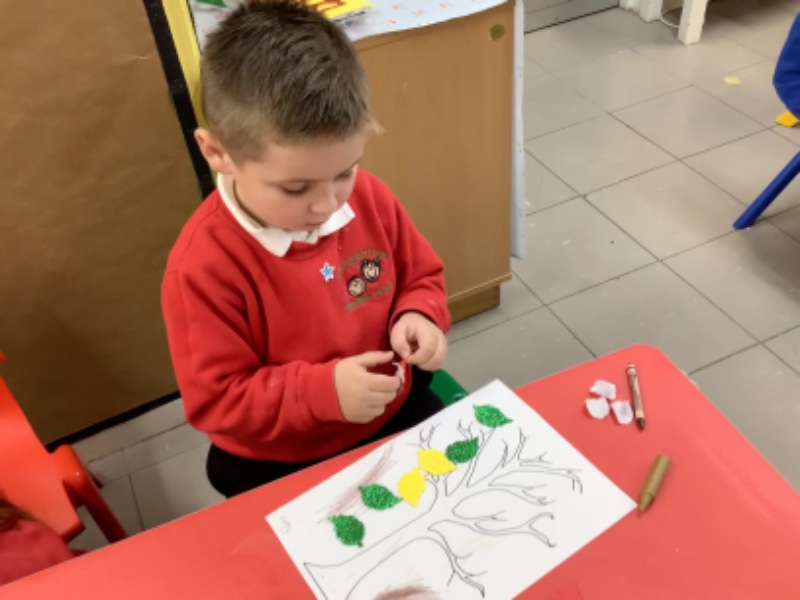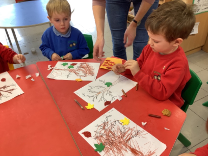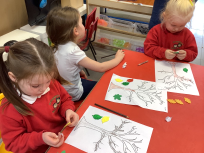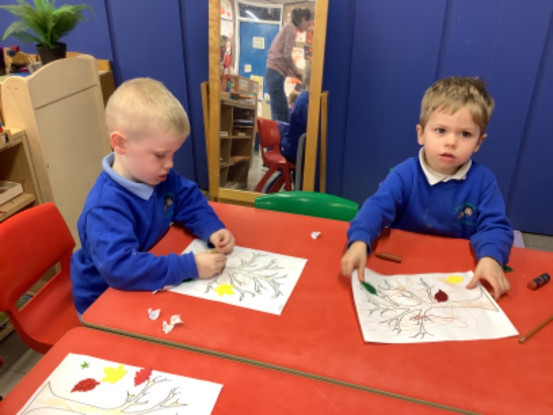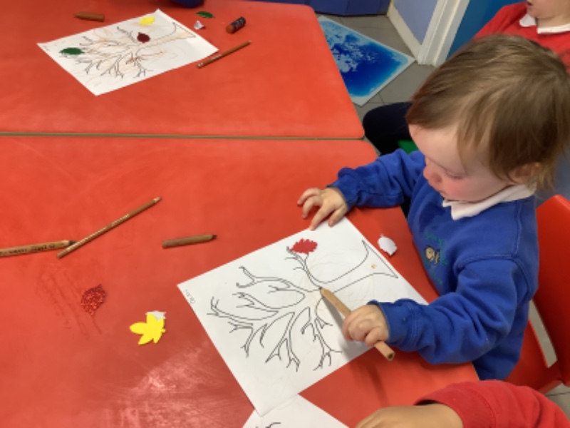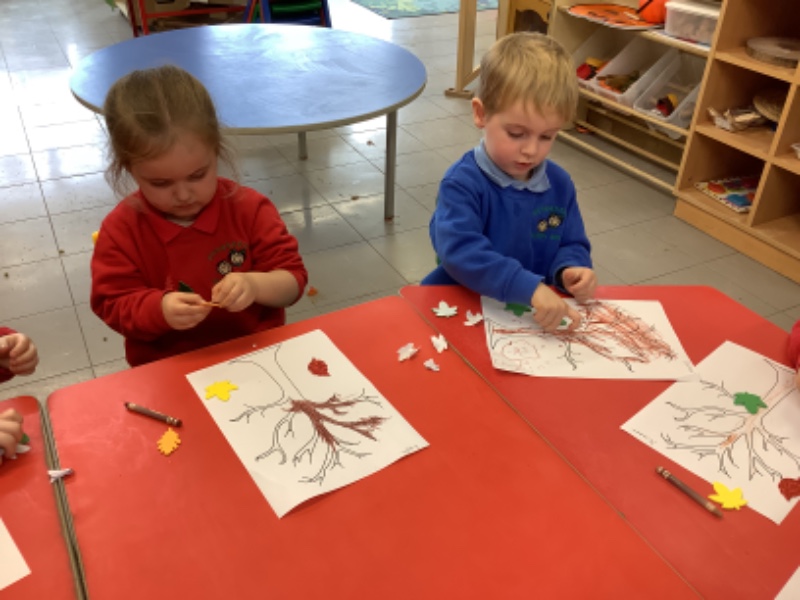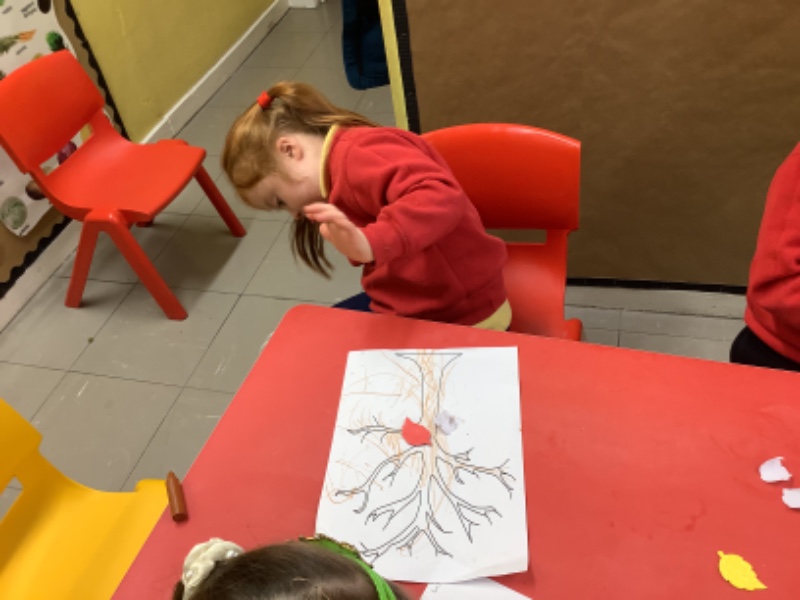 On Friday after we have eaten our dinner we are developing our fine motor skills. Today we were making autumn trees. We developed our pencil holding skills as we coloured in the tree. We strengthened our finger muscles as we peeled leaf stickers and stuck them on the tree.