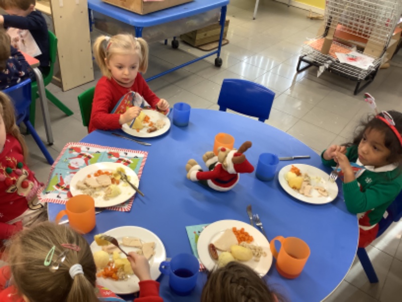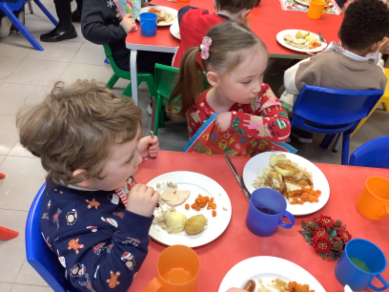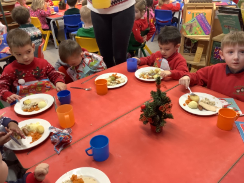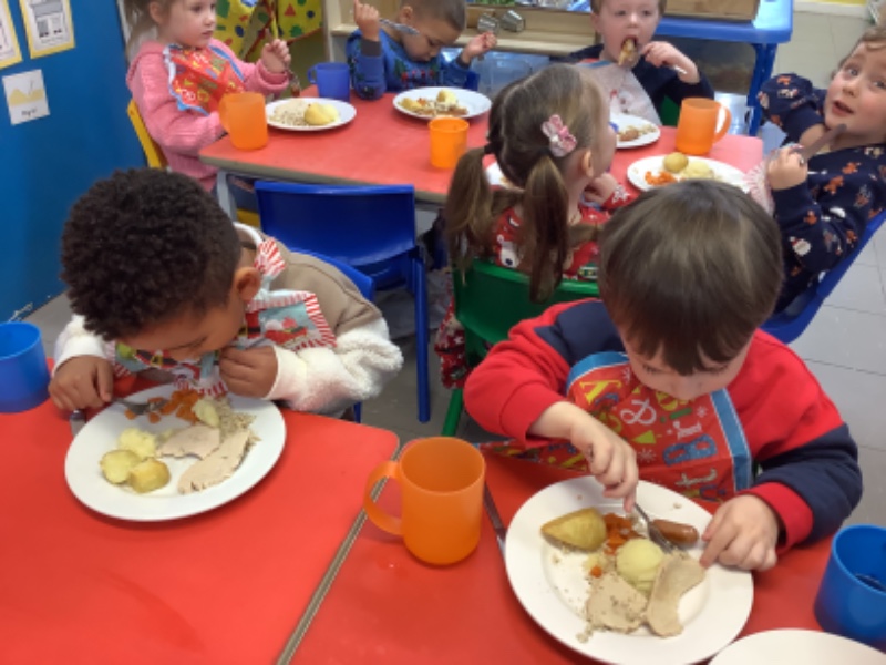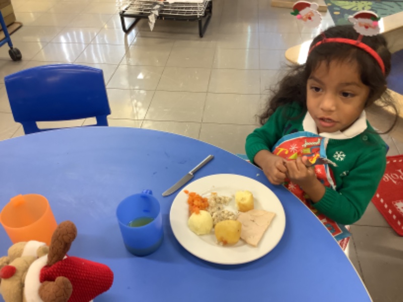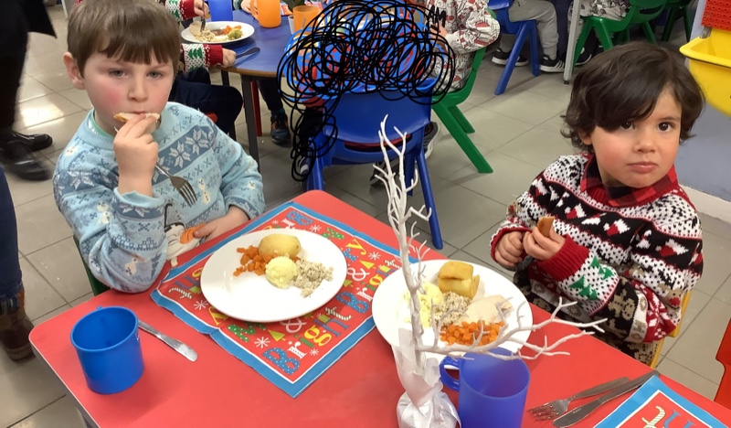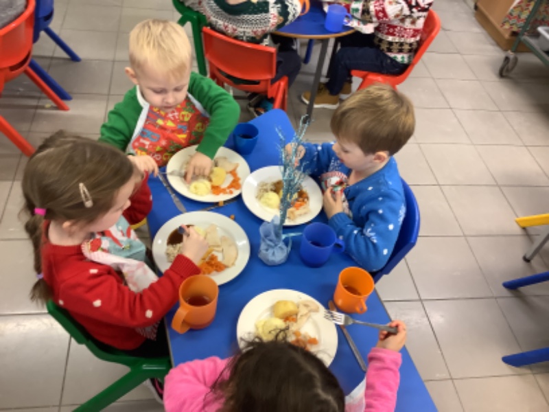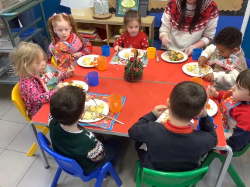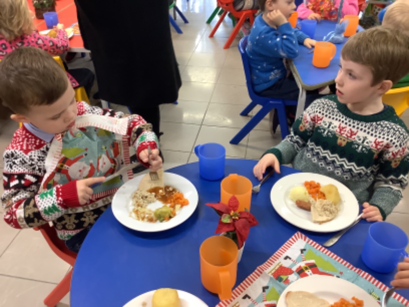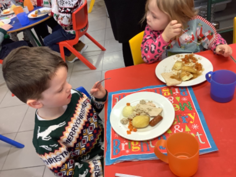 Both nursery classes enjoyed their delicious Christmas Dinner altogether in Mrs. Hudson's room today. We had turkey, potatoes, carrots, sprouts, stuffing, cocktail sausage and gravy then a chocolate ice cream. And guess what? There was even a flurry of snow outside!
