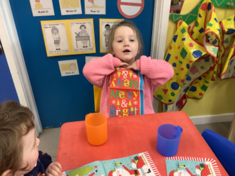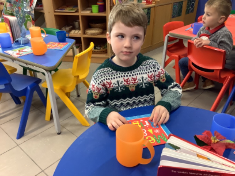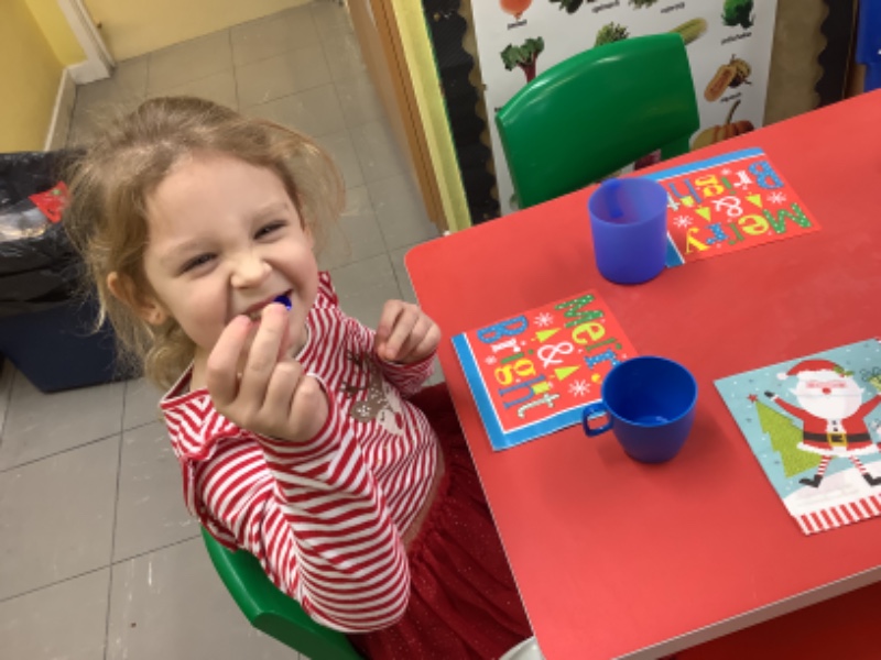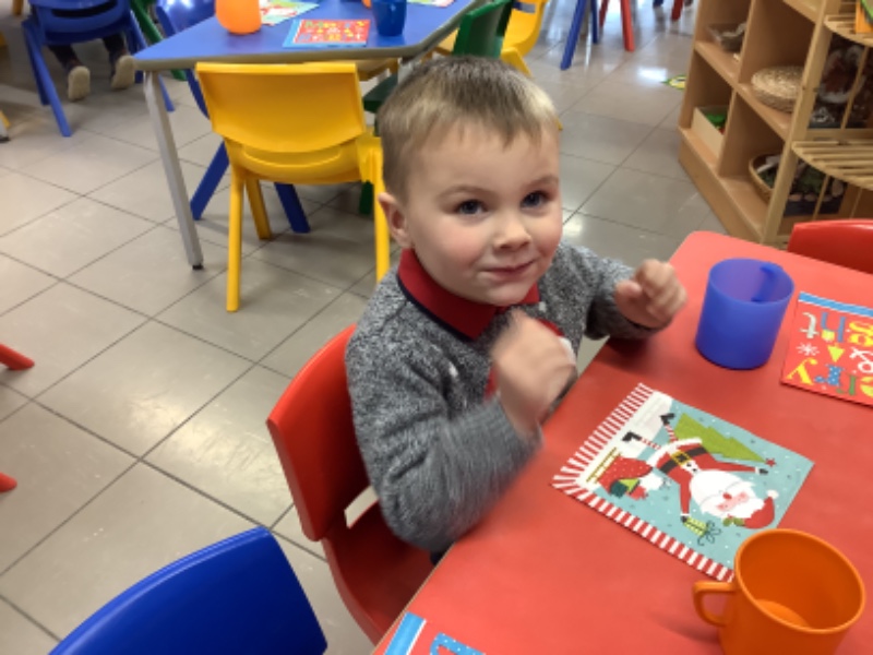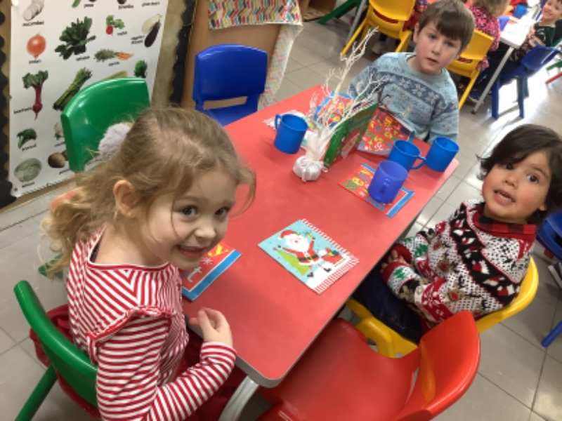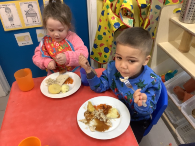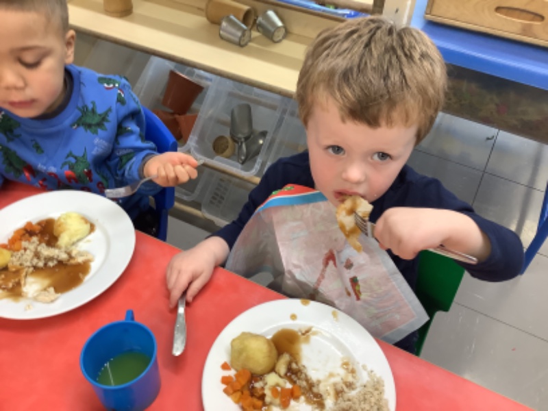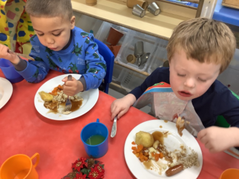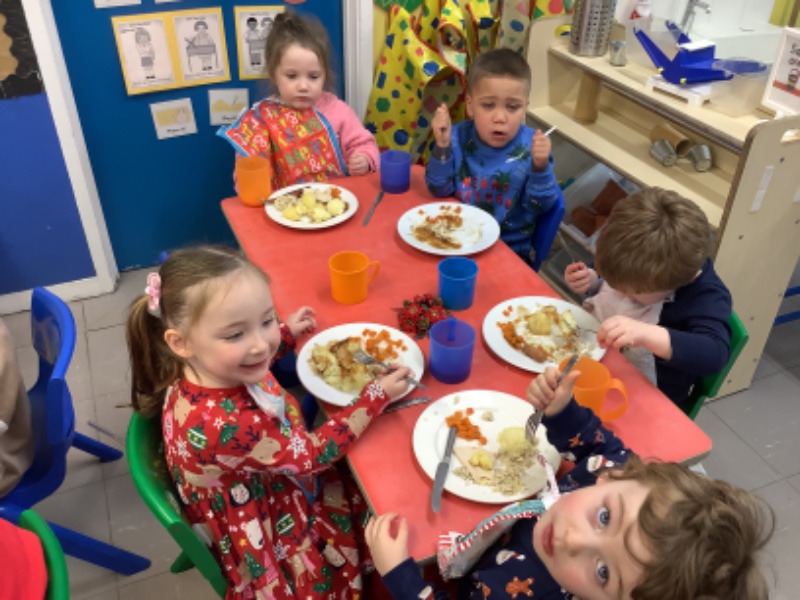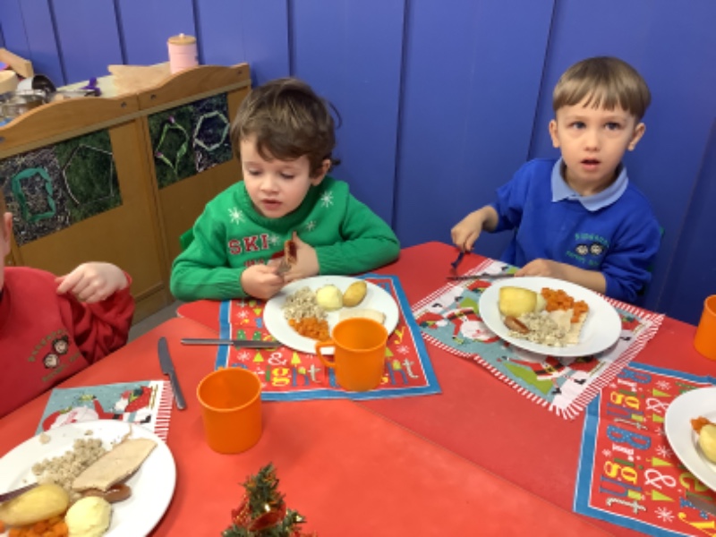 Both nursery classes enjoyed their delicious Christmas Dinner altogether in Mrs. Hudson's room today. We had turkey, potatoes, carrots, sprouts, stuffing, cocktail sausage and gravy then a chocolate ice cream. And guess what? There was even a flurry of snow outside!