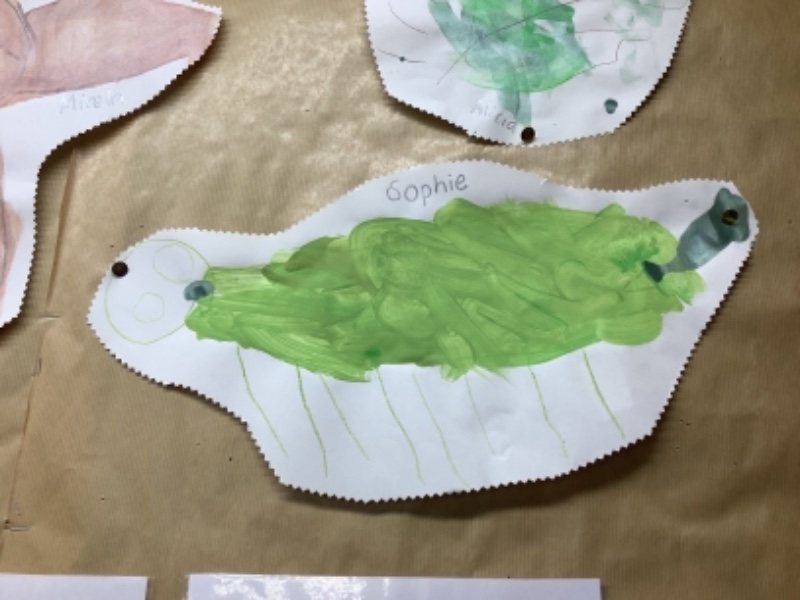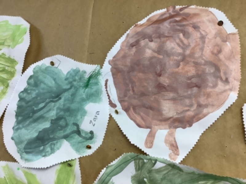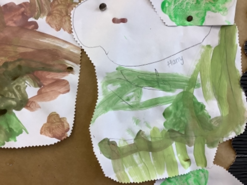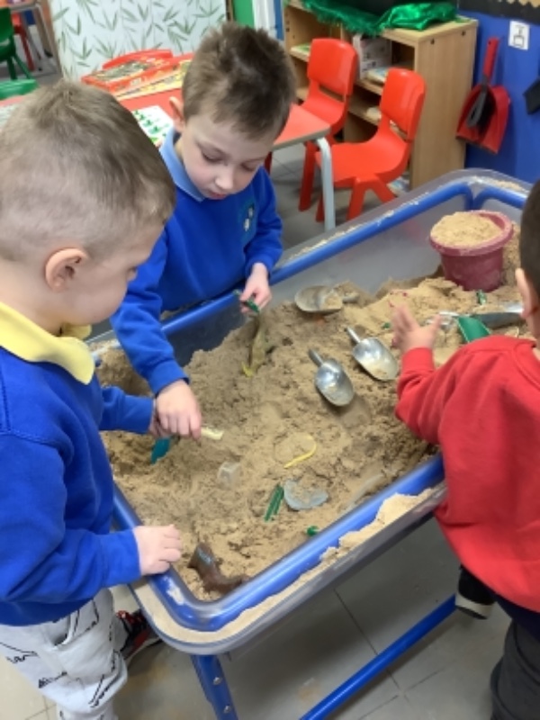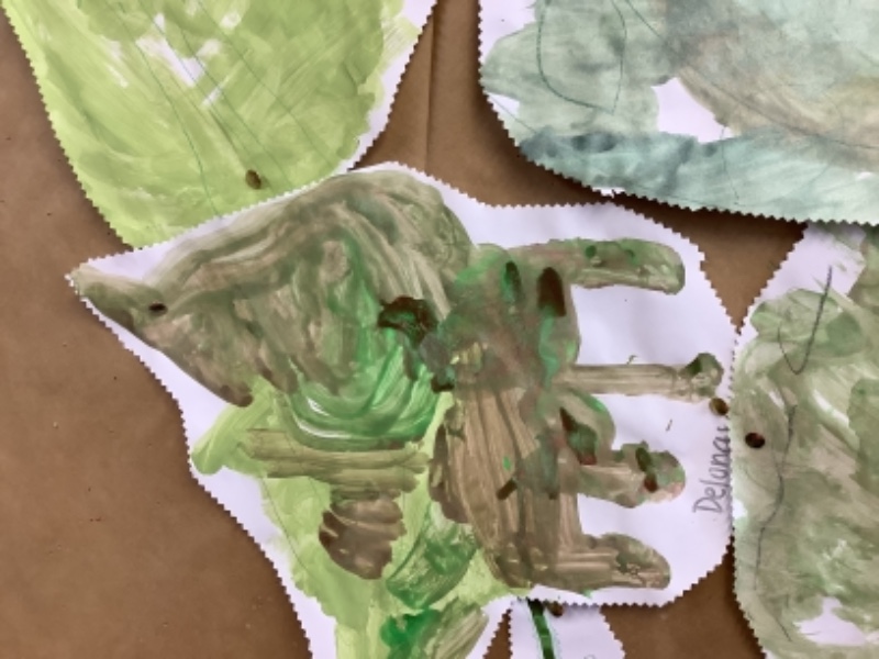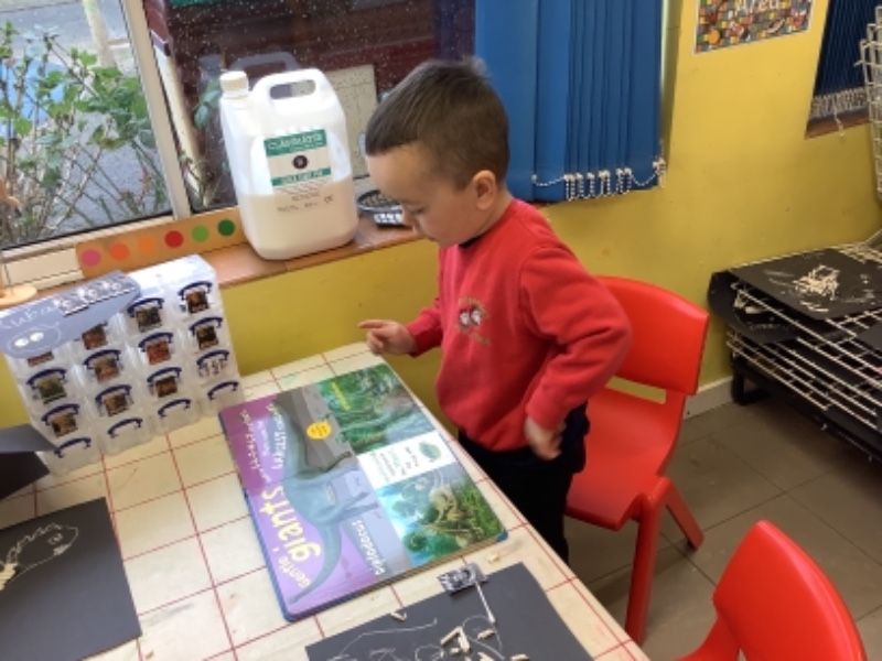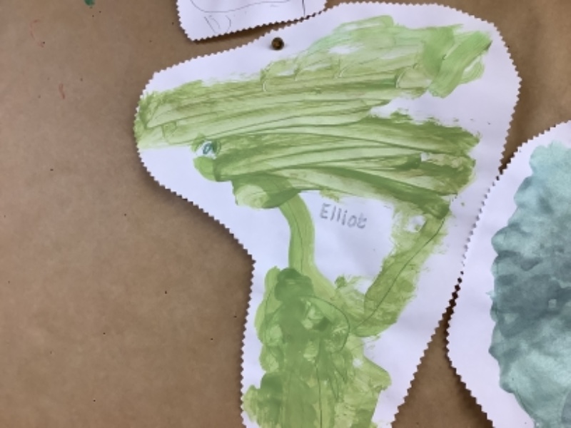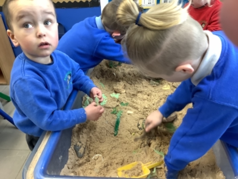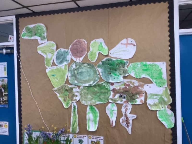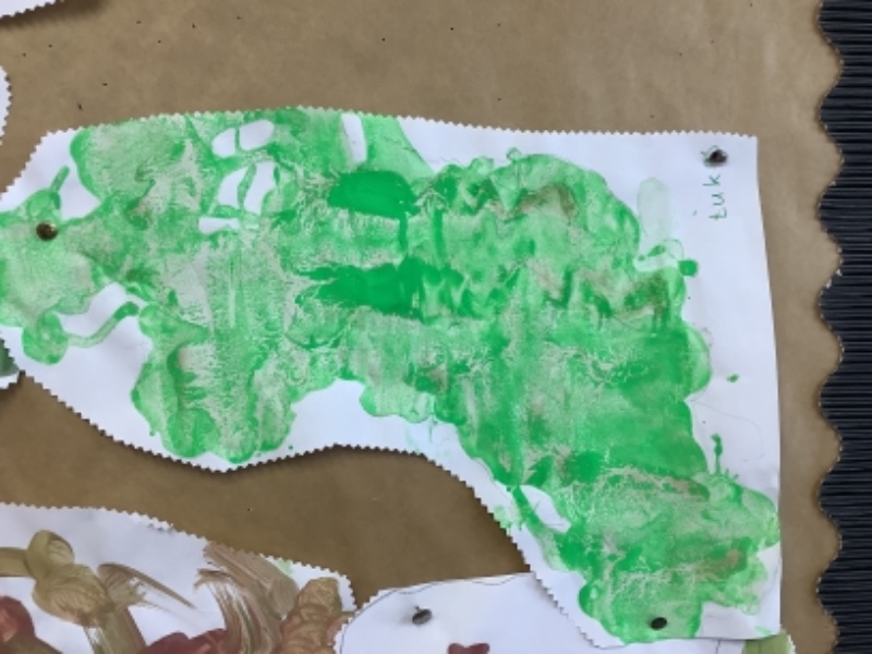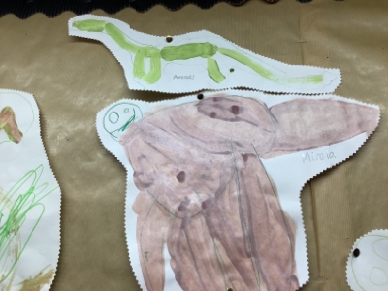 The children mixed paints and painted dinosaur paintings. We joined them altogether and made a giant dinosaur. The children have been digging for dinosaur fossils in the sand. They created dinosaur fossil pictures too.