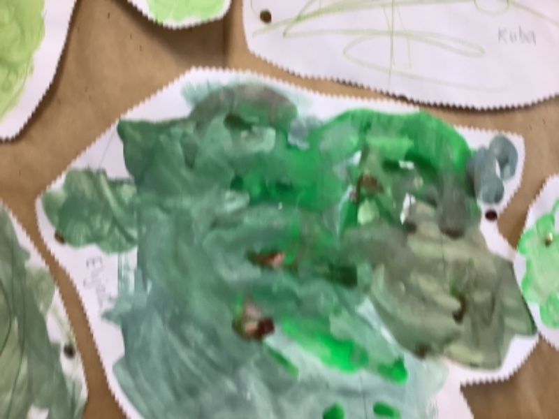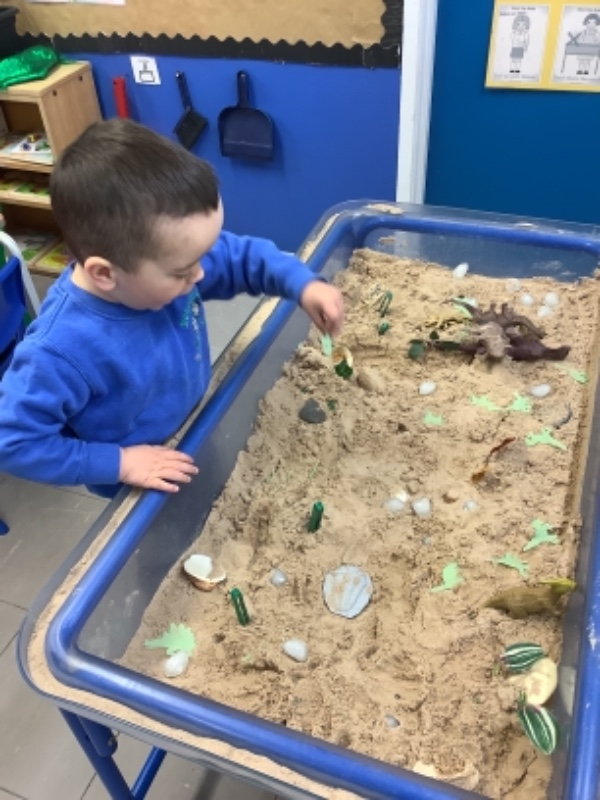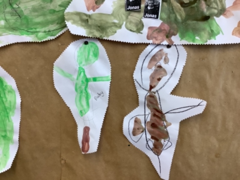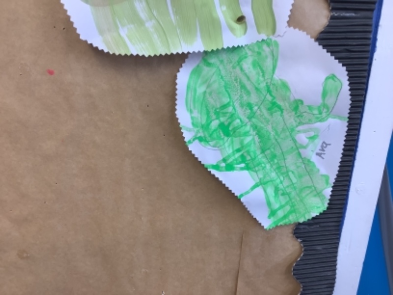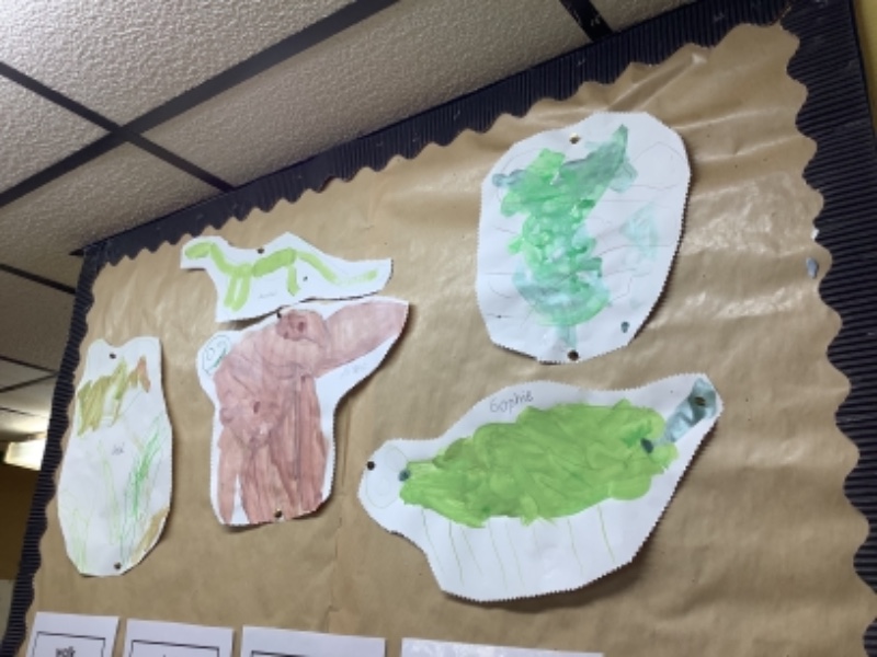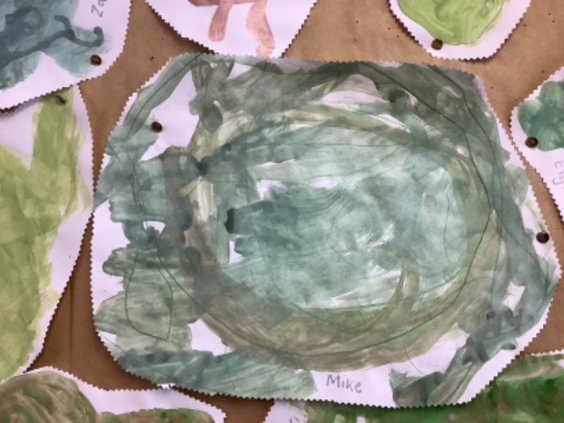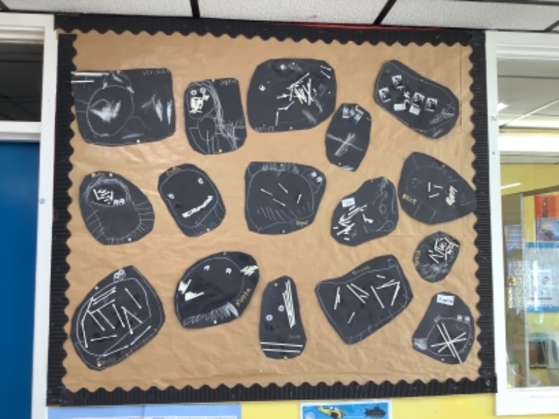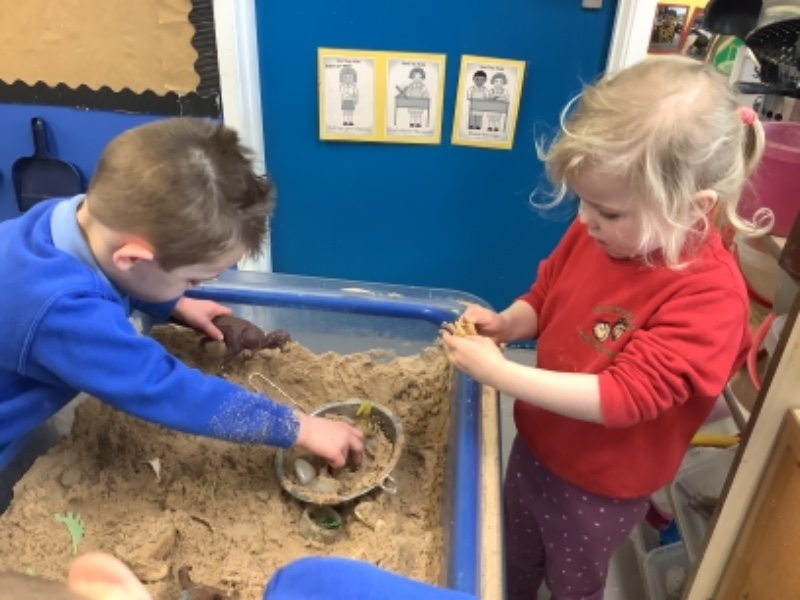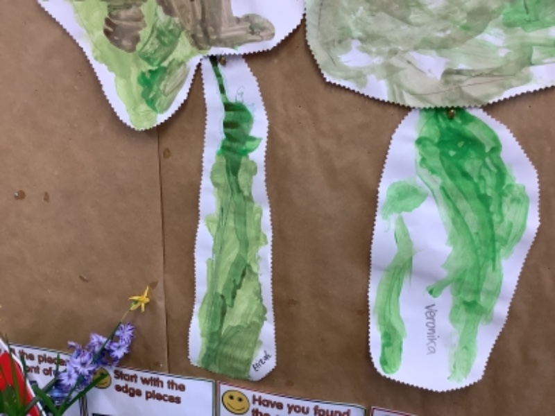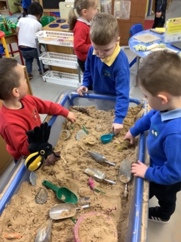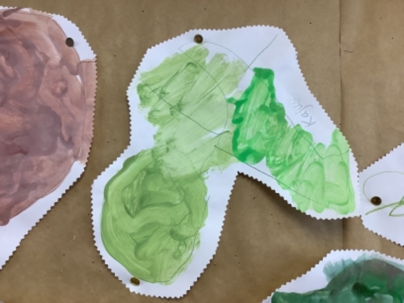 The children mixed paints and painted dinosaur paintings. We joined them altogether and made a giant dinosaur. The children have been digging for dinosaur fossils in the sand. They created dinosaur fossil pictures too.