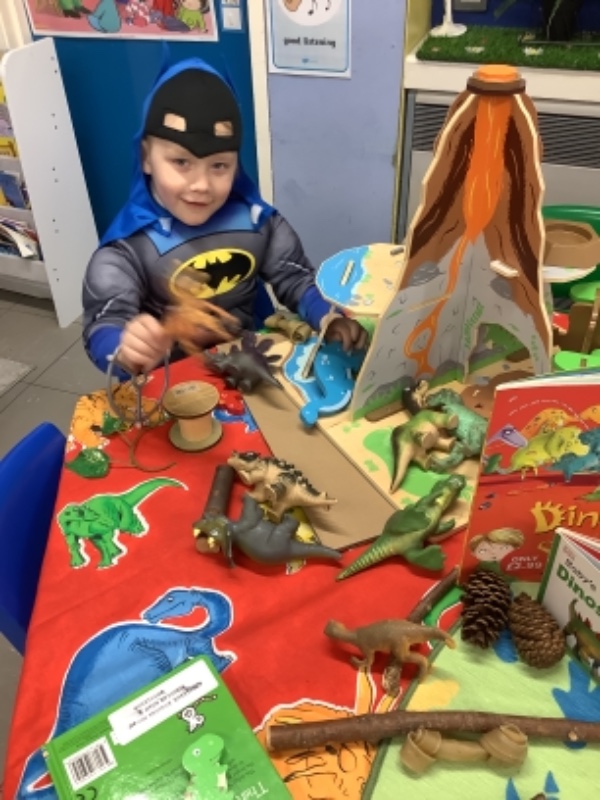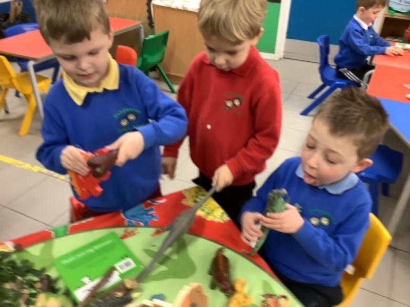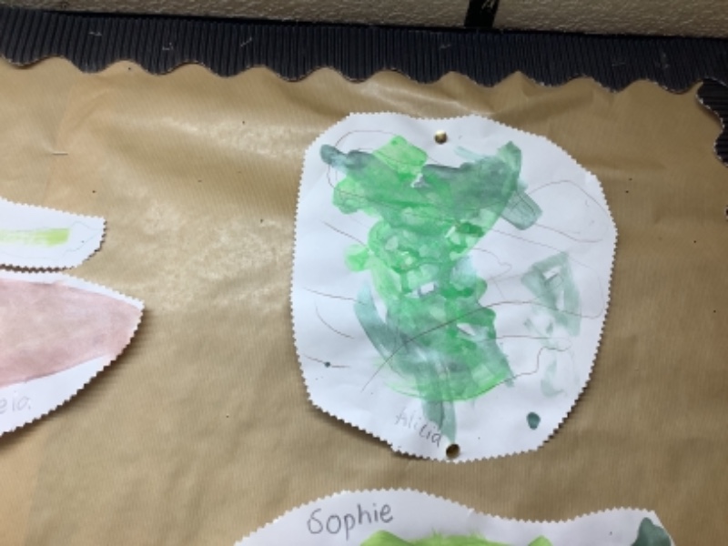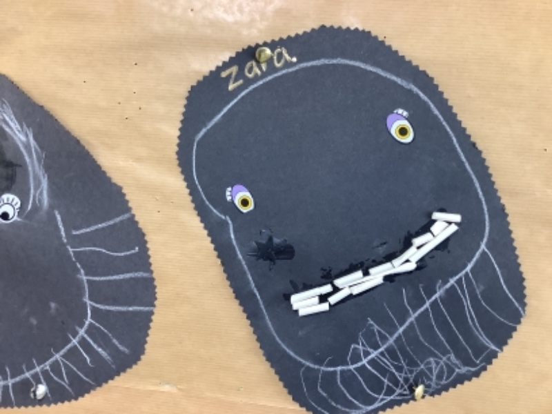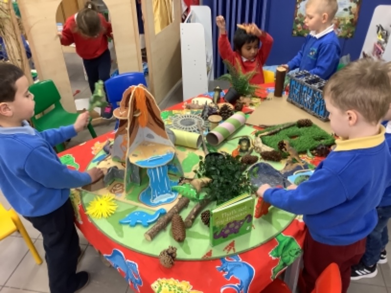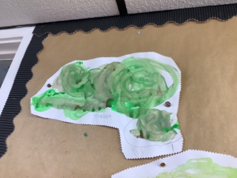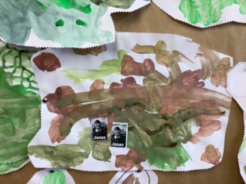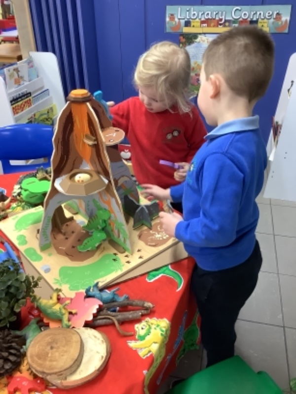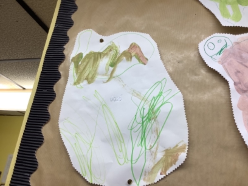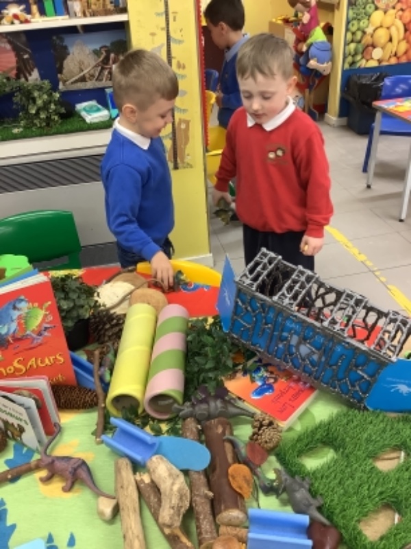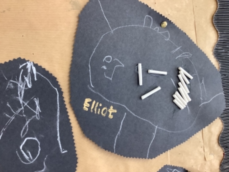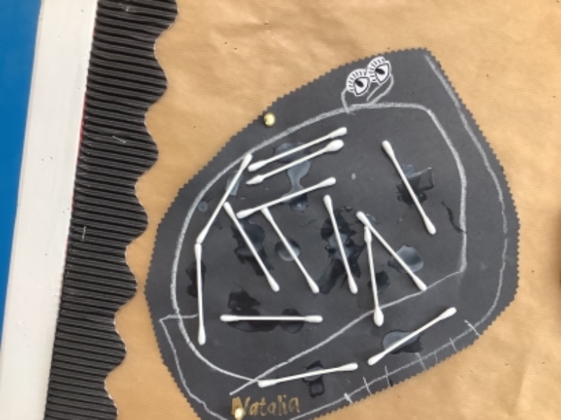 The children mixed paints and painted dinosaur paintings. We joined them altogether and made a giant dinosaur. The children have been digging for dinosaur fossils in the sand. They created dinosaur fossil pictures too.