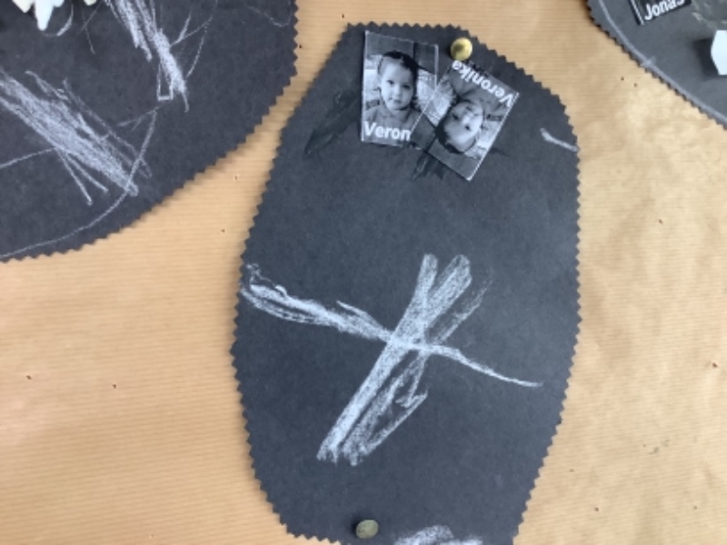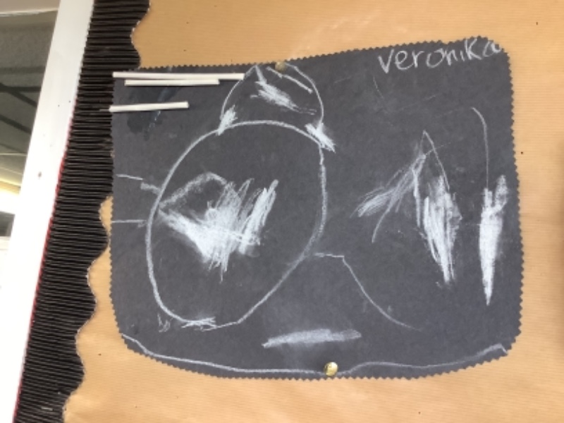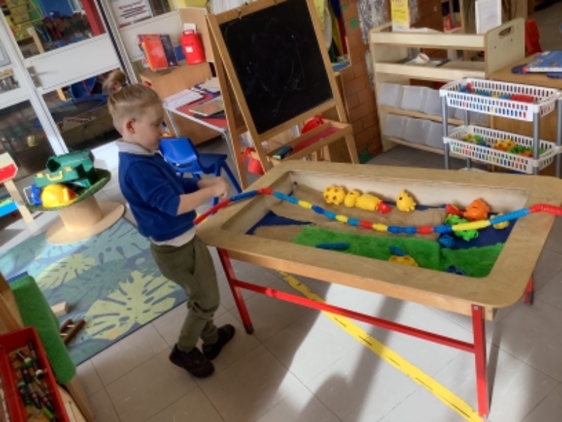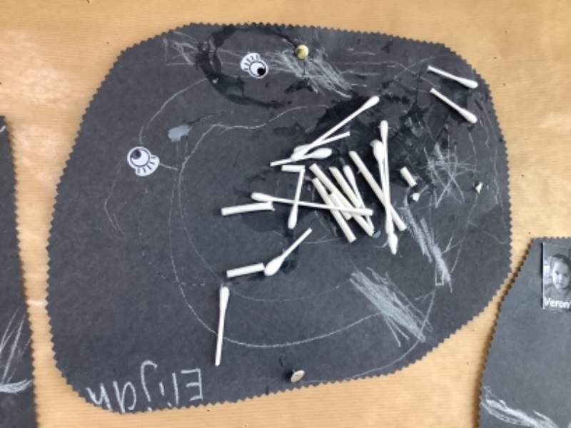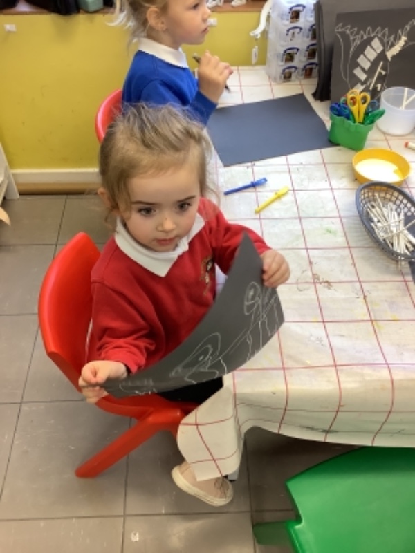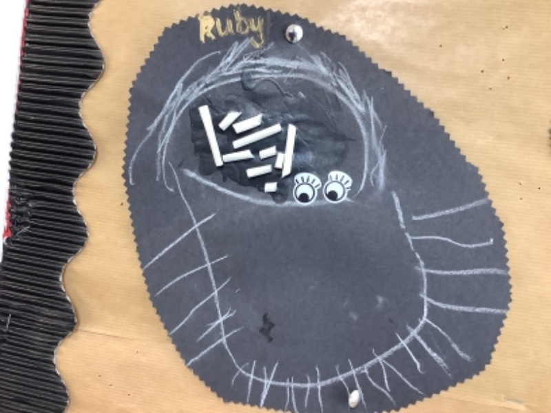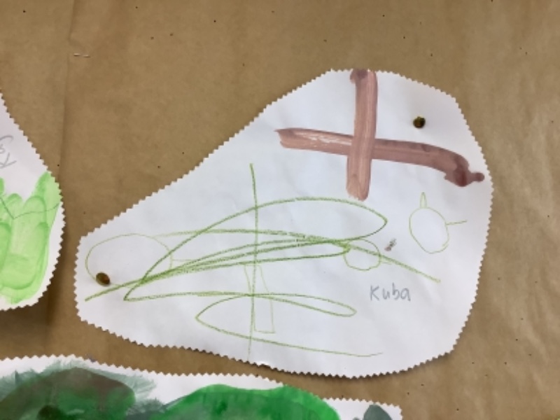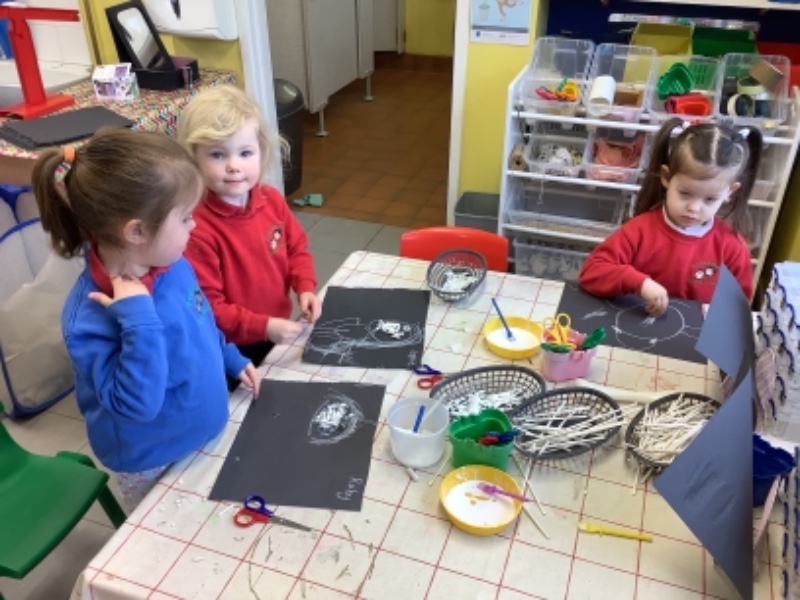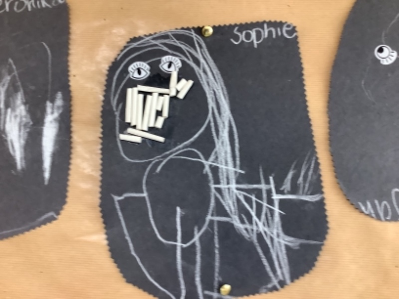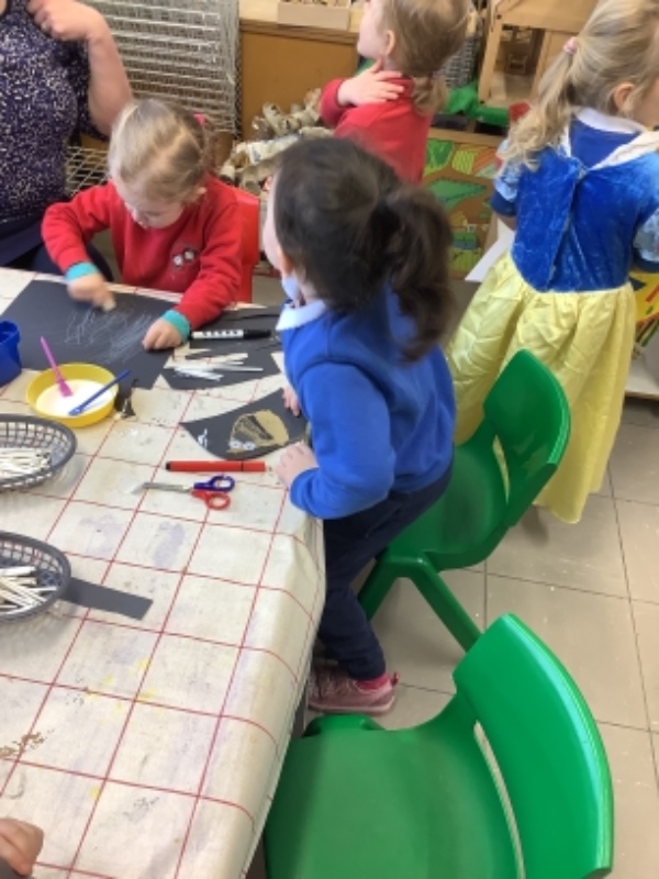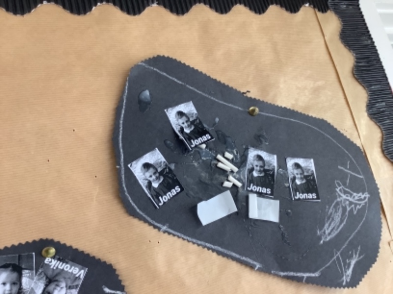 The children mixed paints and painted dinosaur paintings. We joined them altogether and made a giant dinosaur. The children have been digging for dinosaur fossils in the sand. They created dinosaur fossil pictures too.
