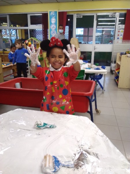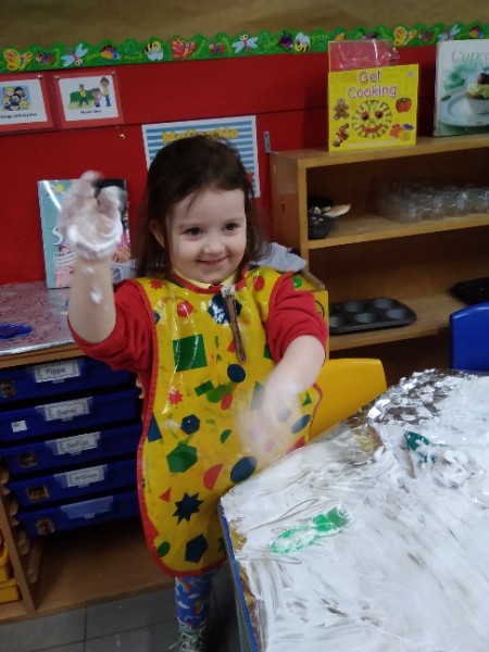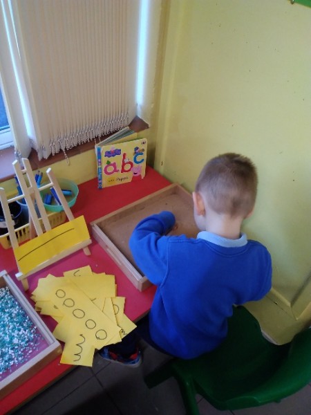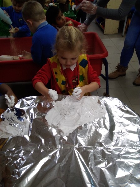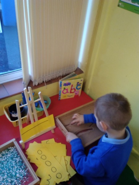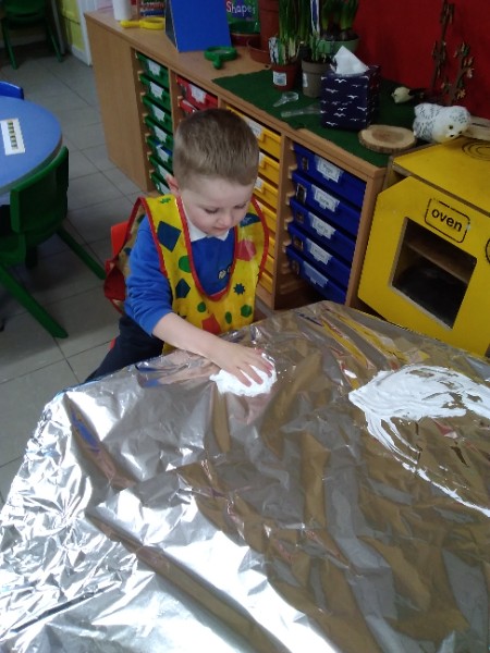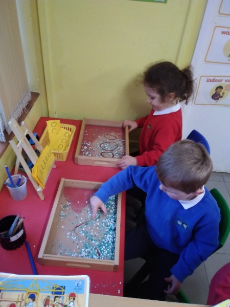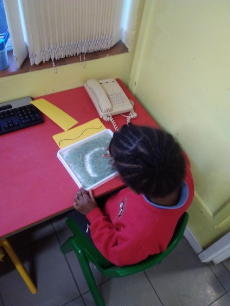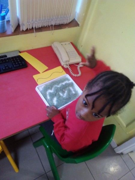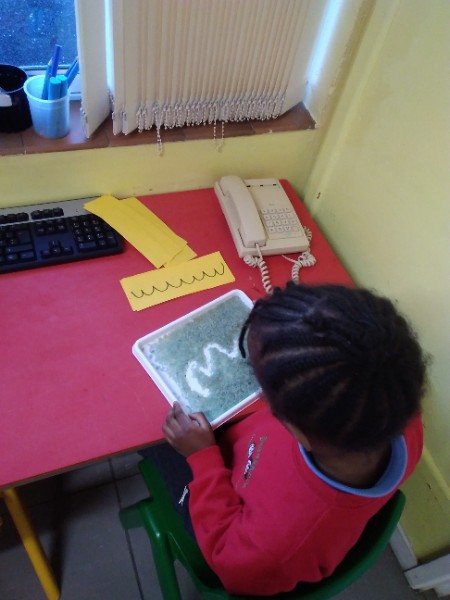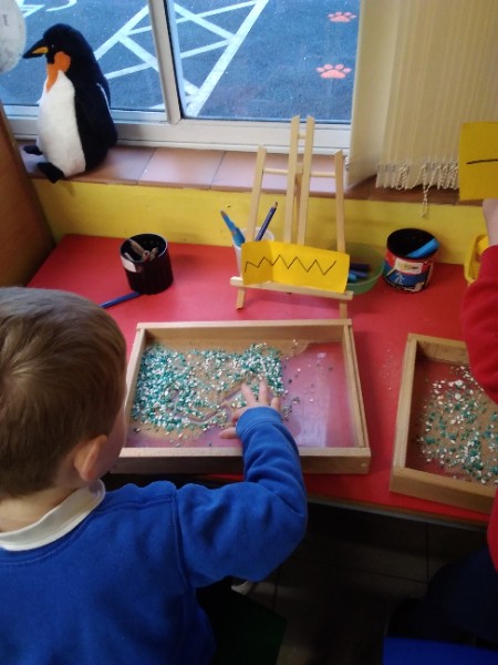 We are getting ready to learn how to write. We make marks in sand and shaving foam.