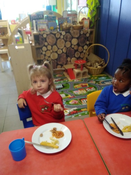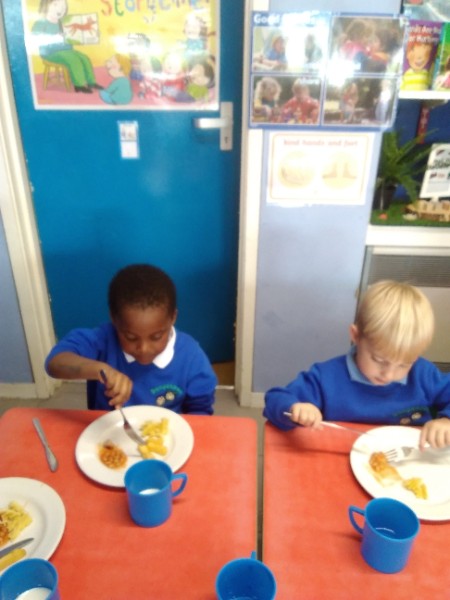 The Nursery children have enjoyed having their dinner in school. We are sitting with our friends and using our knife and fork. We'll done everyone!