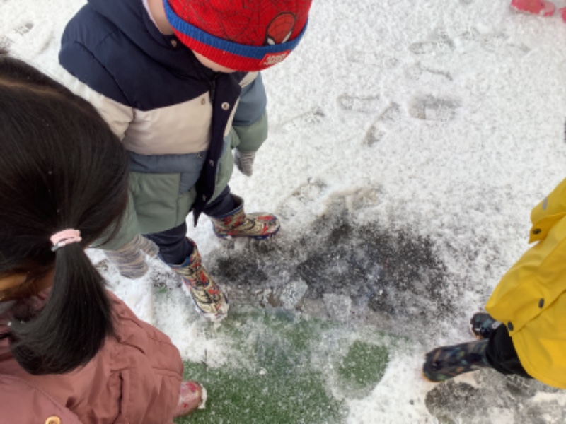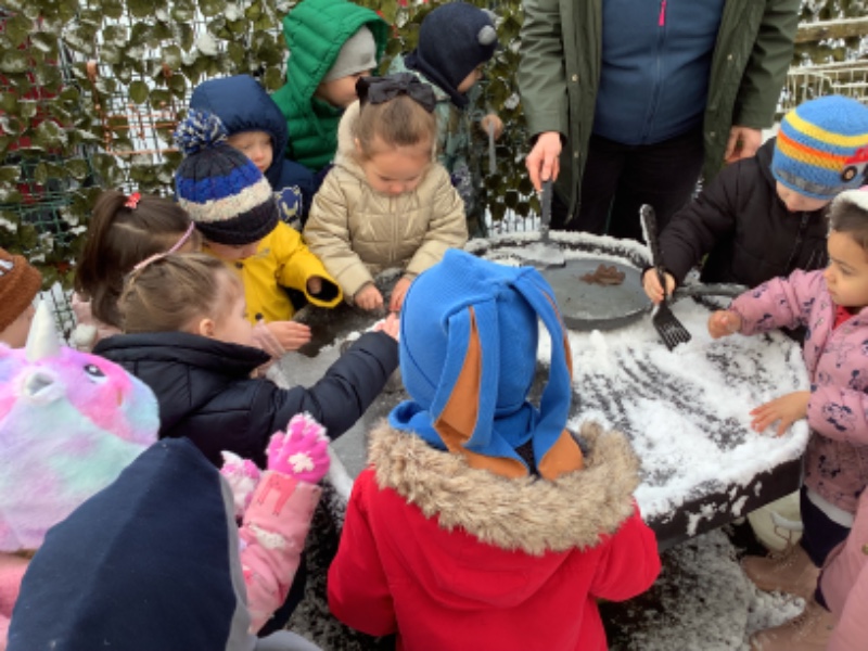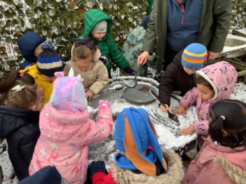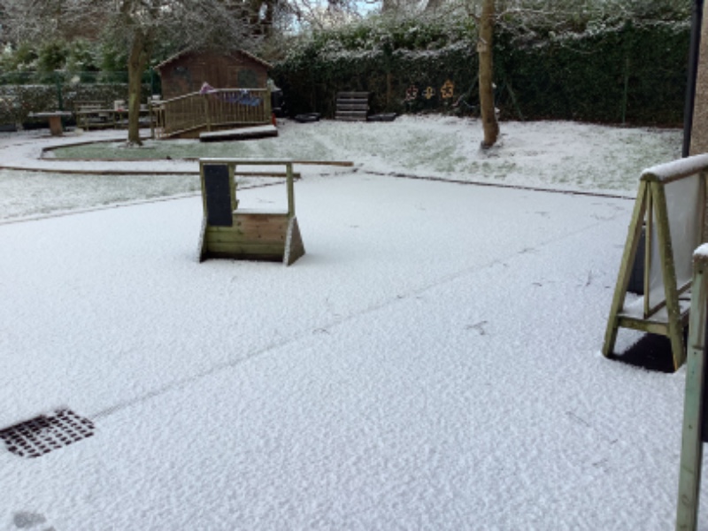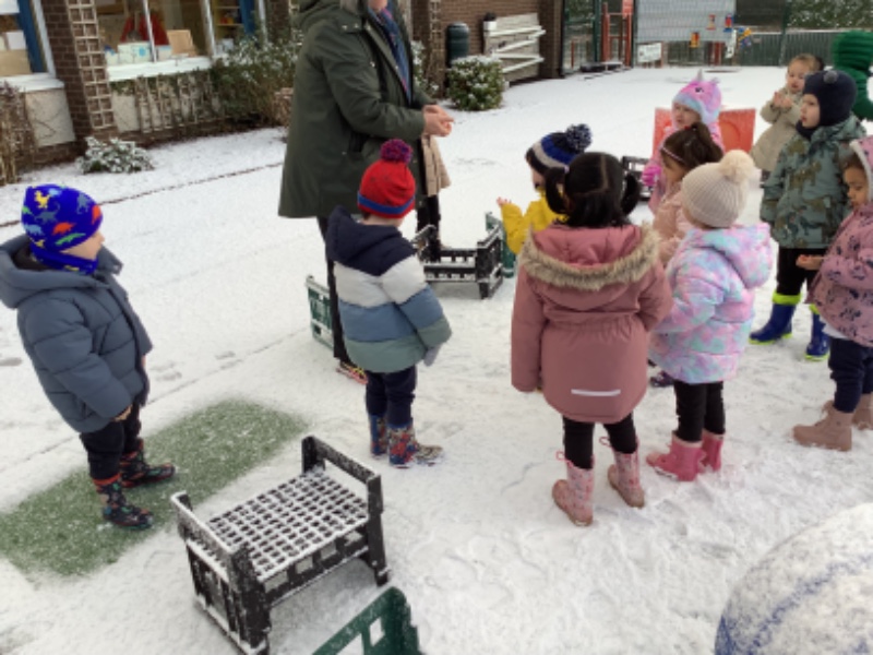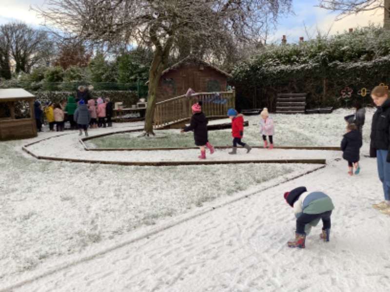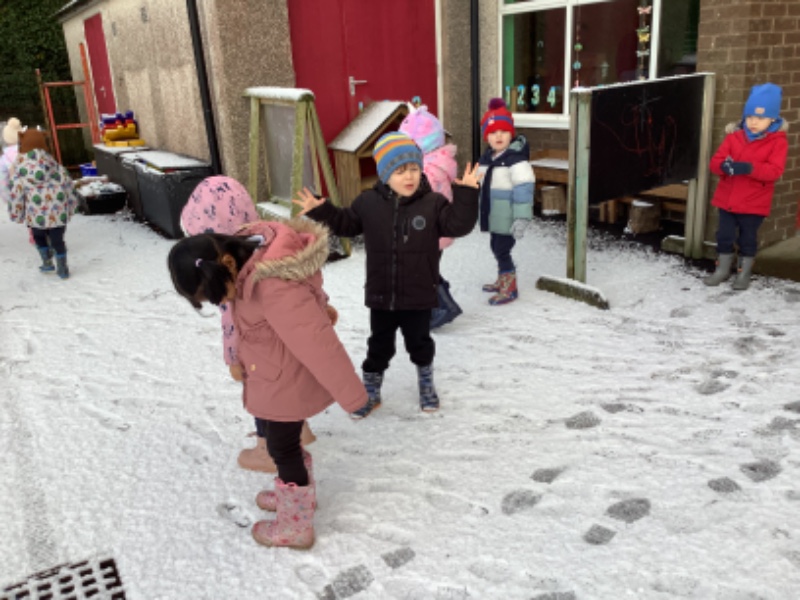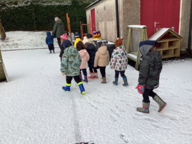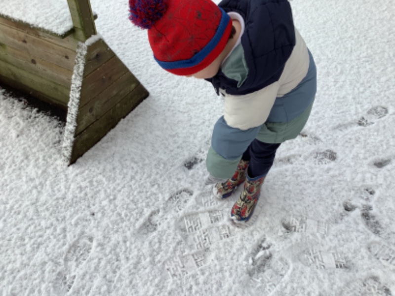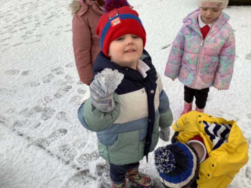Today we were lucky enough to enjoy a short walk in the snow in our playground. We explored the sound our feet made in the snow, the prints we left and how the snow felt to touch. We had lots of lovely chat about snow men, snow angels and Jack Frost.