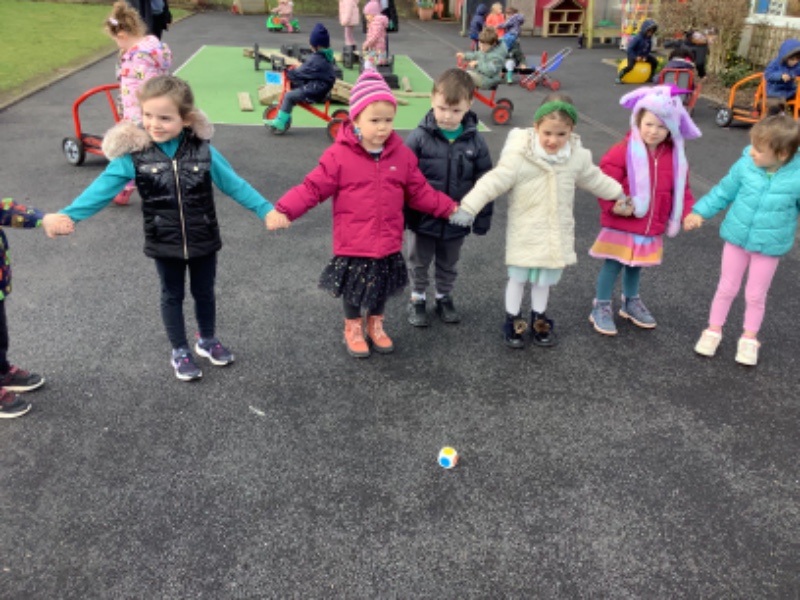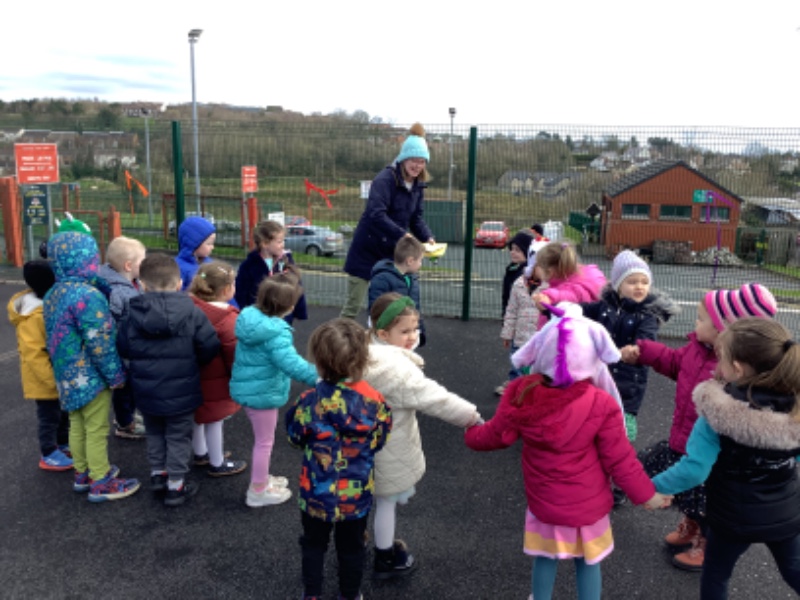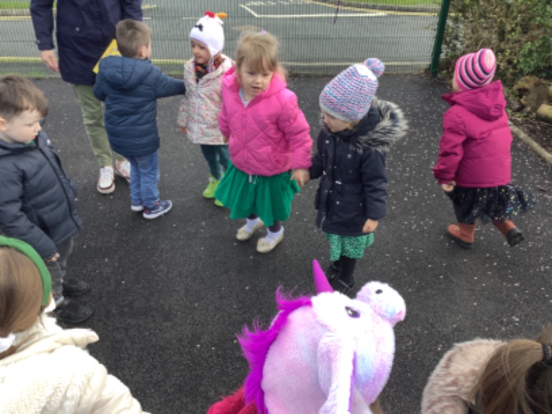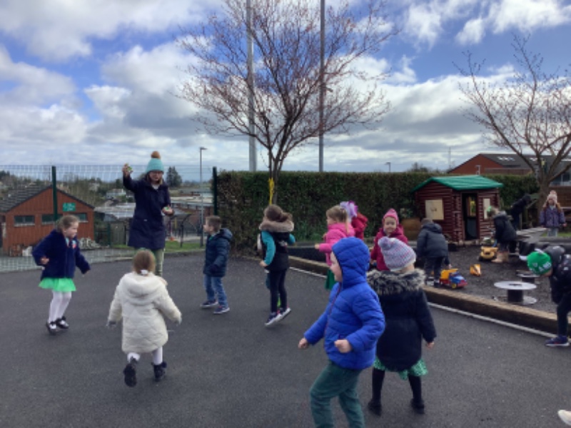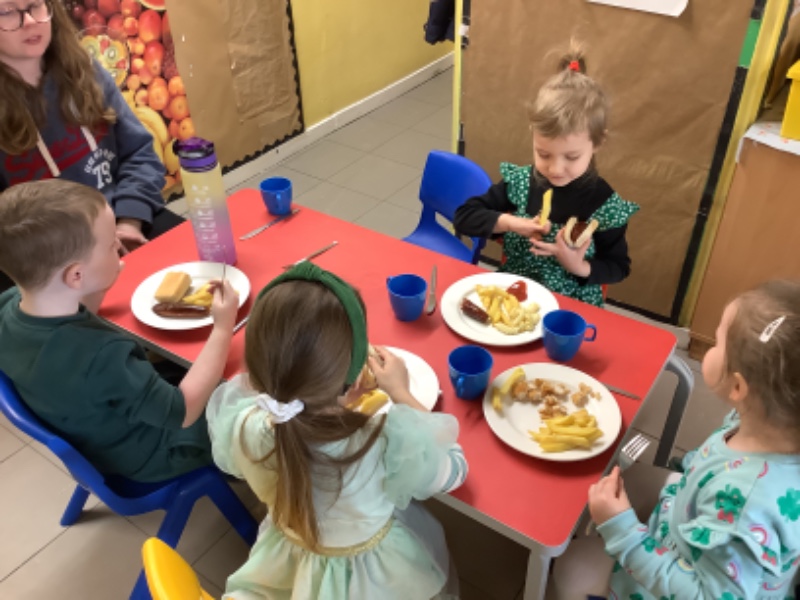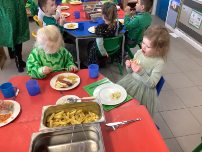 We all enjoyed dressing up in green and rainbows to celebrate St. Patrick's Day. We made shamrocks, had a green snack of grapes, cucumbers, apples and golden Milky Bar mousse. We had a rainbow treasure hunt with Miss Park and Mrs. Lagan. We made rainbow biscuits too!