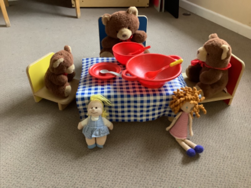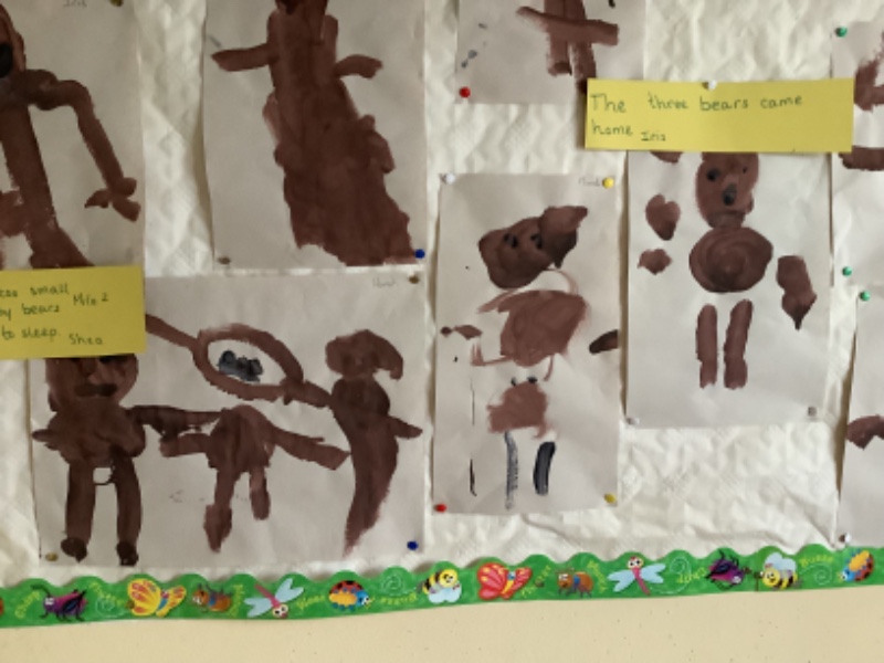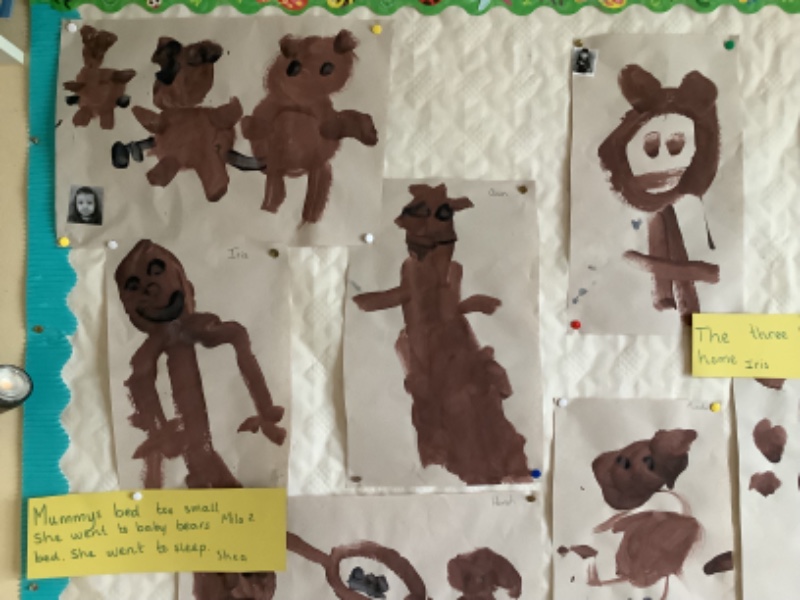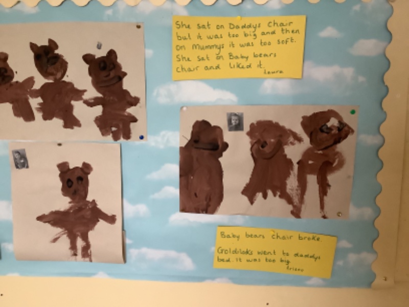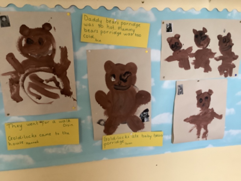Mrs Lagans class created some fantastic bears and a giant Goldilocks for our wall display. They all followed direction at the easel to ensure our bears had 4 paws, a head, tummy,ears/eyes/nose and mouth. The children enjoyed re-telling the story to us.