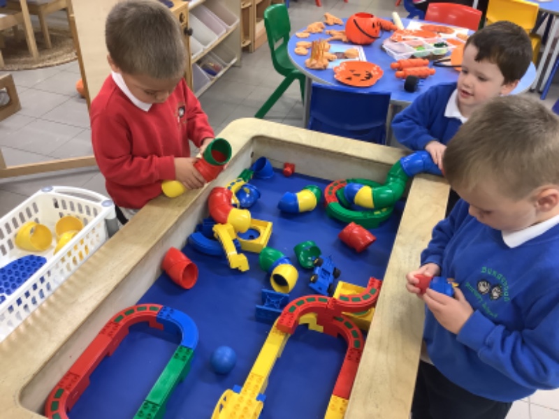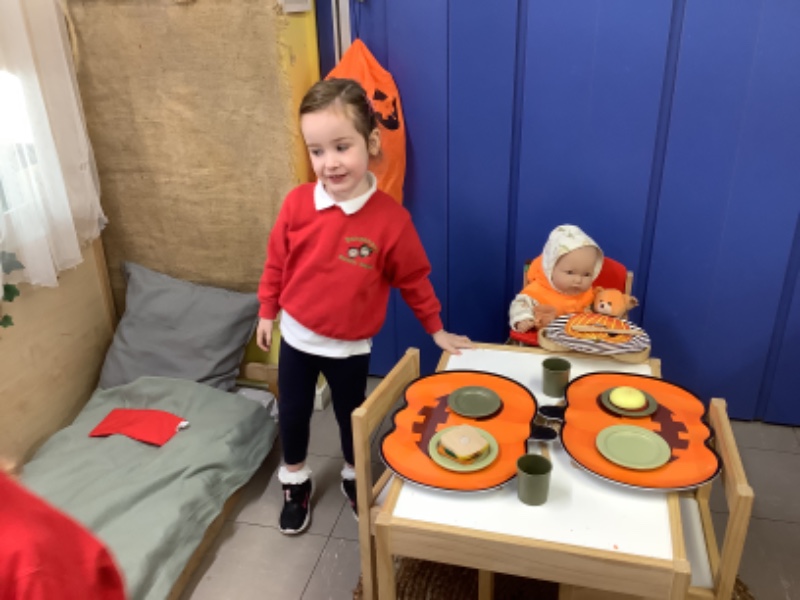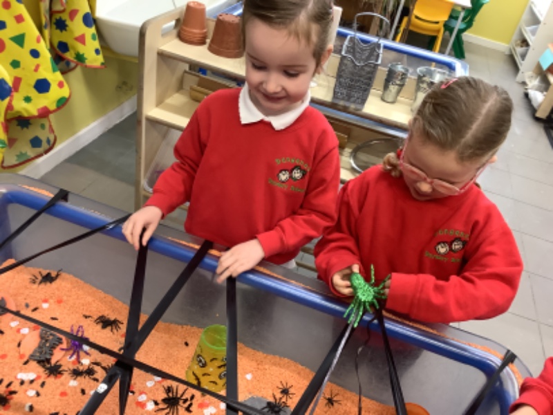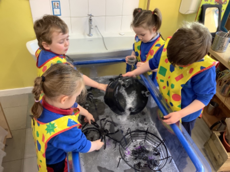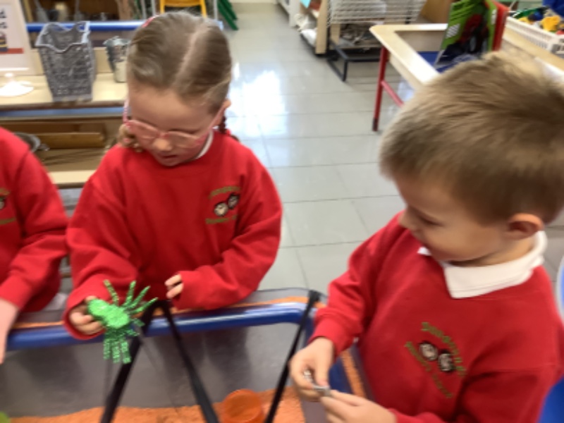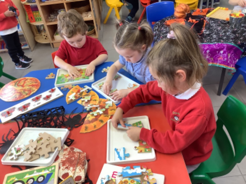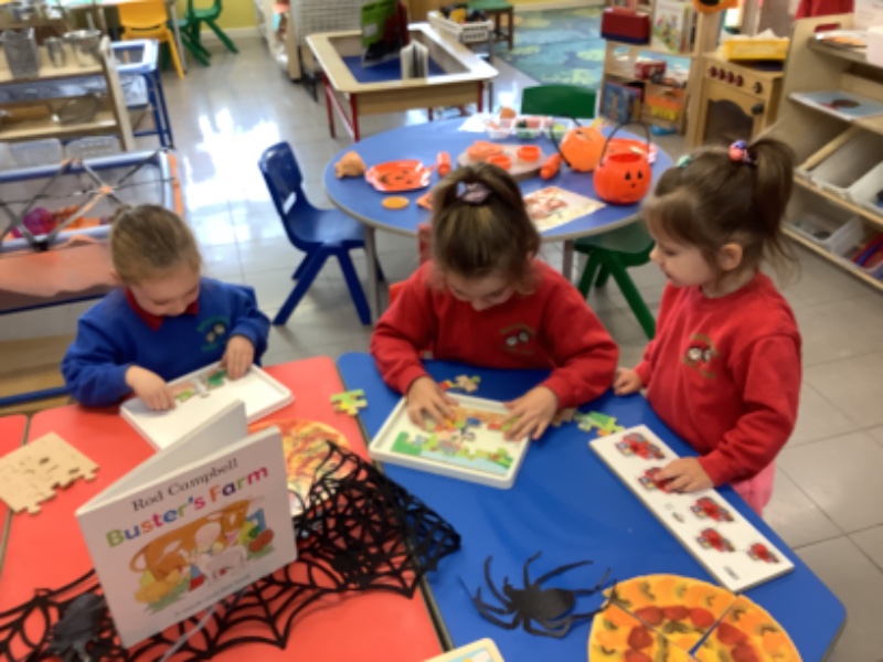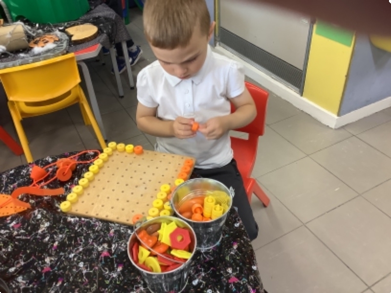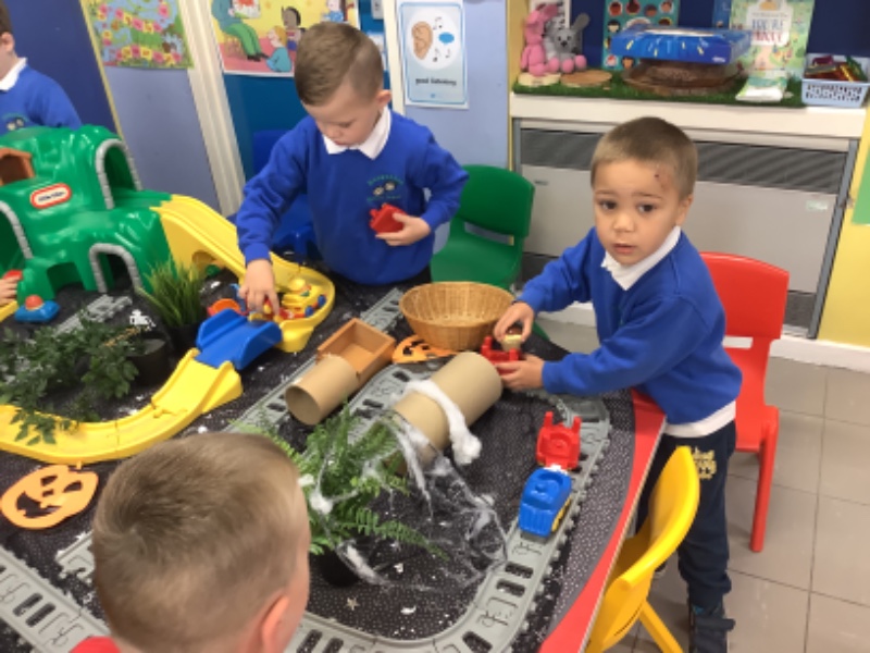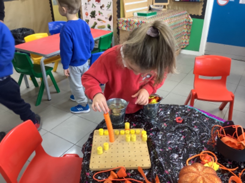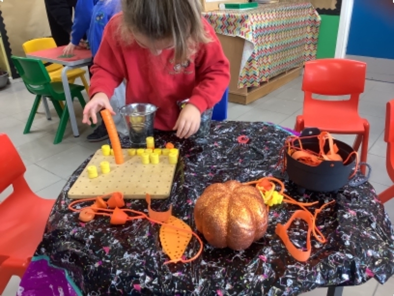The children have been learning lots in Nursery using the theme of Autumn and Hallowe'en. They have been building a ghost train. Making autumn tree pictures. Exploring pattern in maths with autumn colours. Being brave as they play with toy spiders in the water. Using orange lentils to pour and scoop. Doing lots of great jigsaw work. Working together to make buildings, tractors and funfair rides.