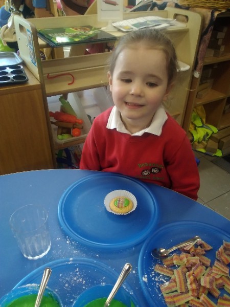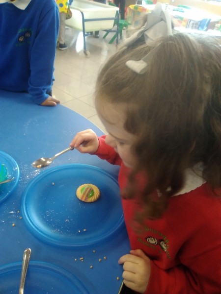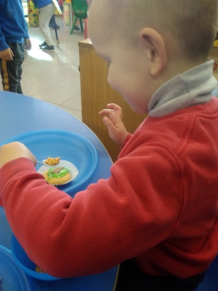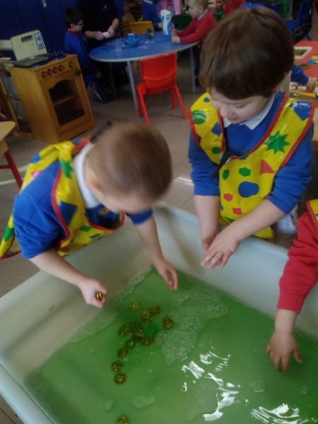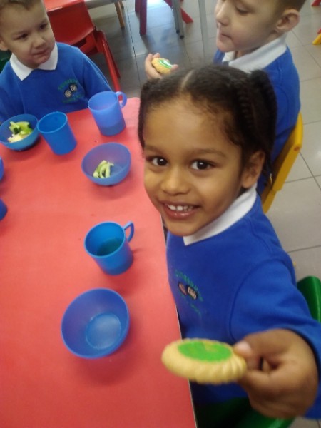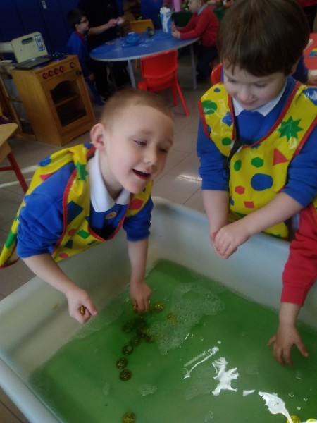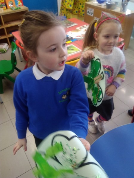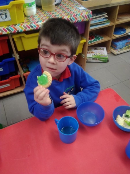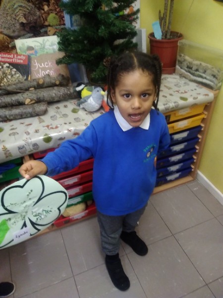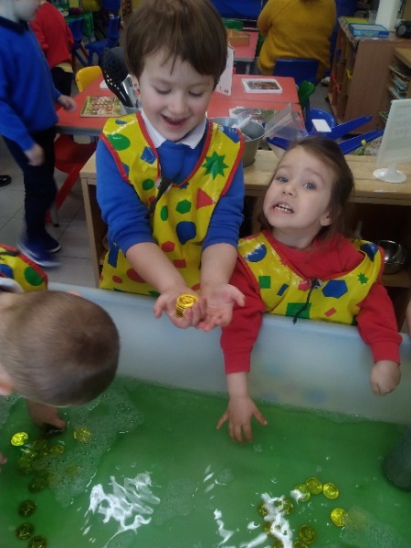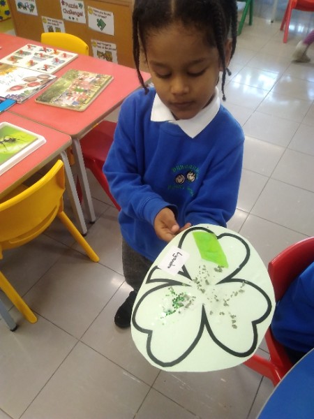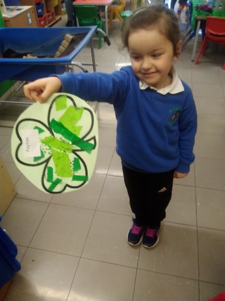 The Nursery children celebrated St. Patrick's Day on Friday. We looked for the Leprechaun's gold at the end of the rainbow. We made rainbow biscuits with sugar gold. We also made some green shamrock pictures too. We enjoyed a Green Snack of apple, pear, cucumber, green biscuits and apple juice.