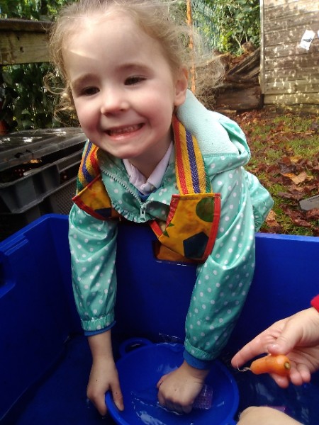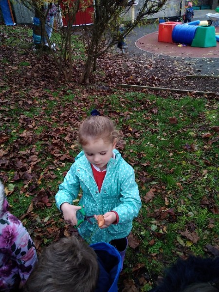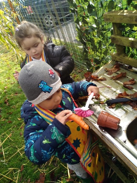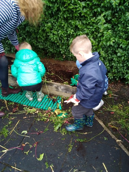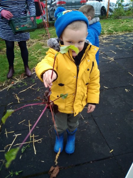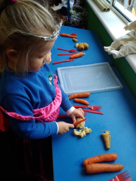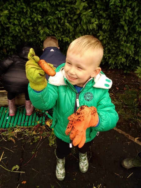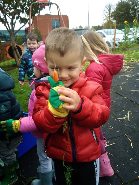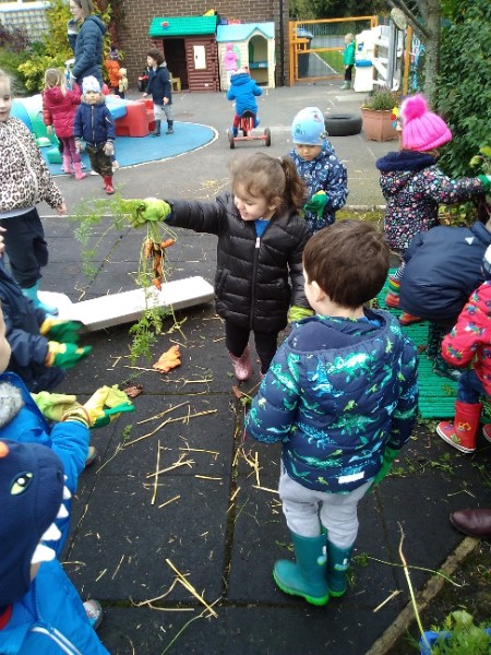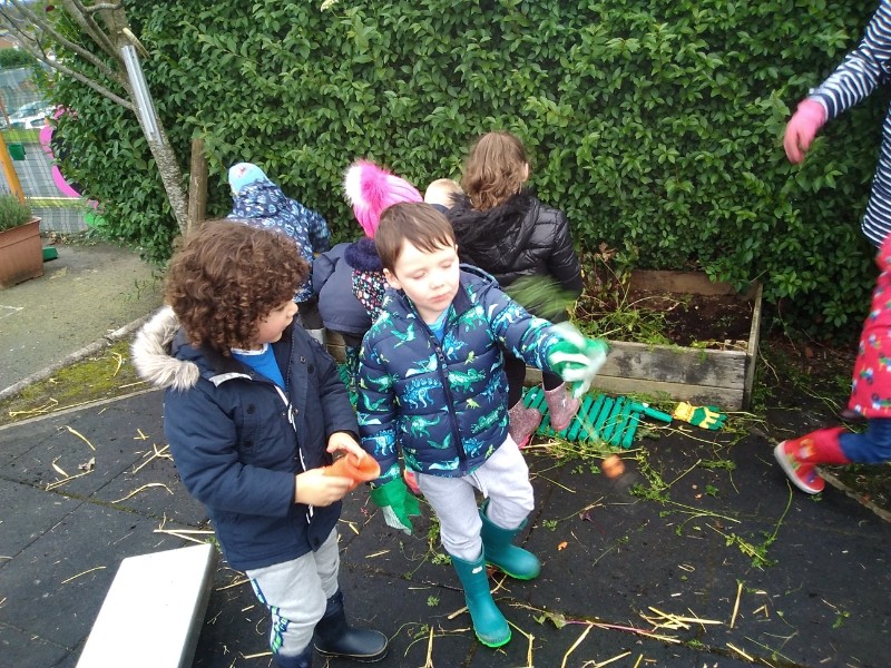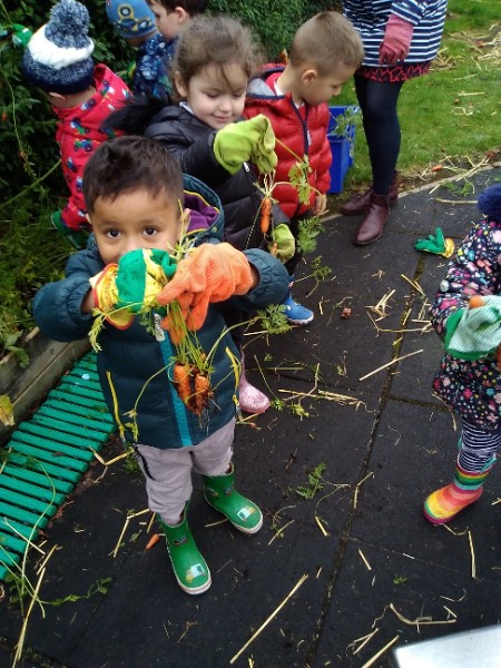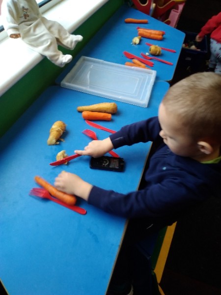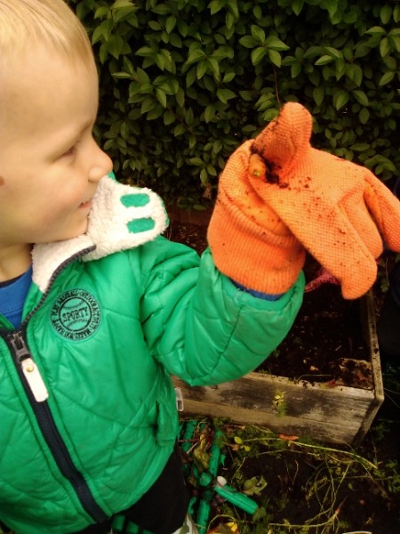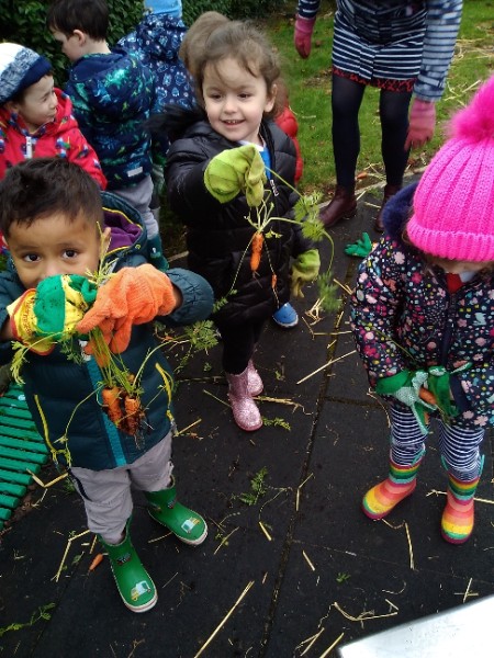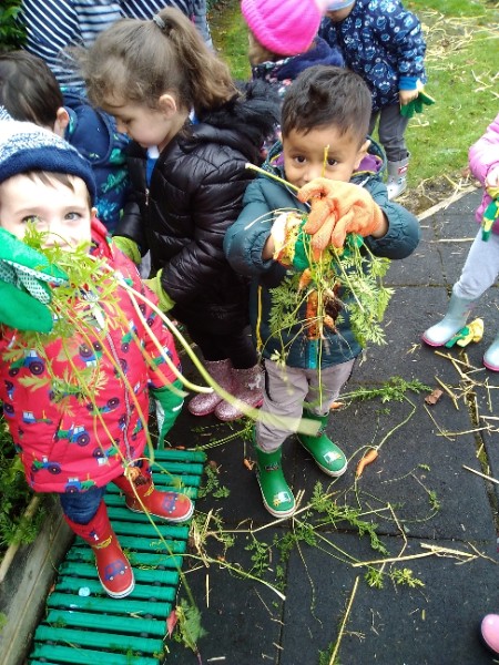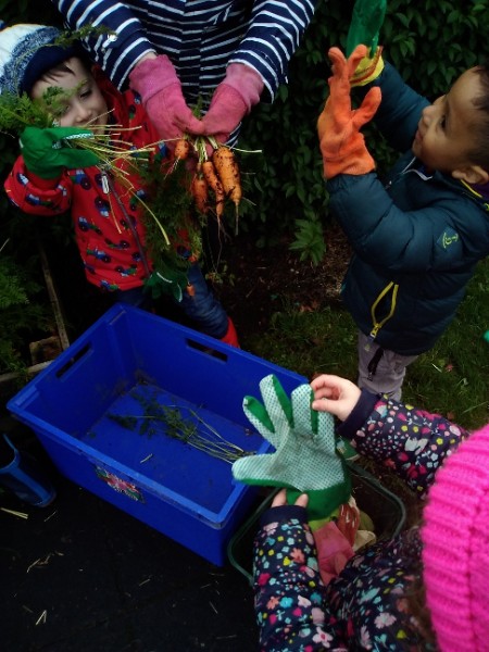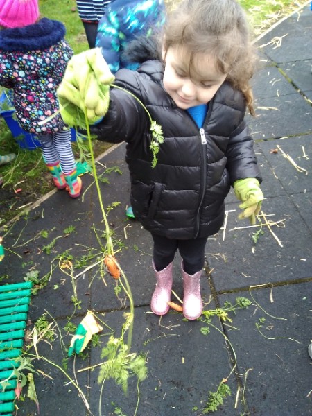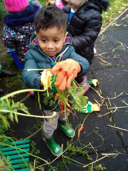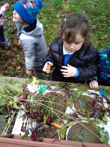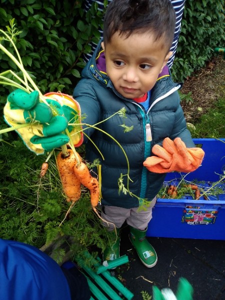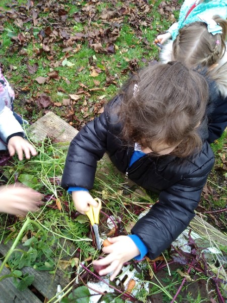 The Nursery children put on their gardening gloves and harvested the vegetables that last year's children planted and grew. We then used scissors to trim their green tops off. We washed and scrubbed them clean. Next we used knifes and forks to slice them up. Next we will be making some soup.