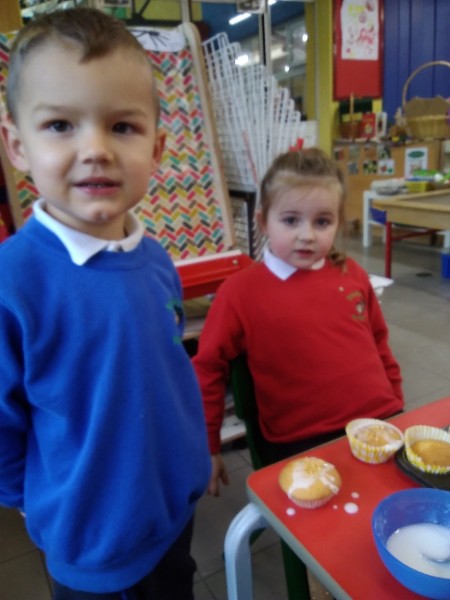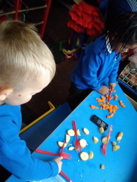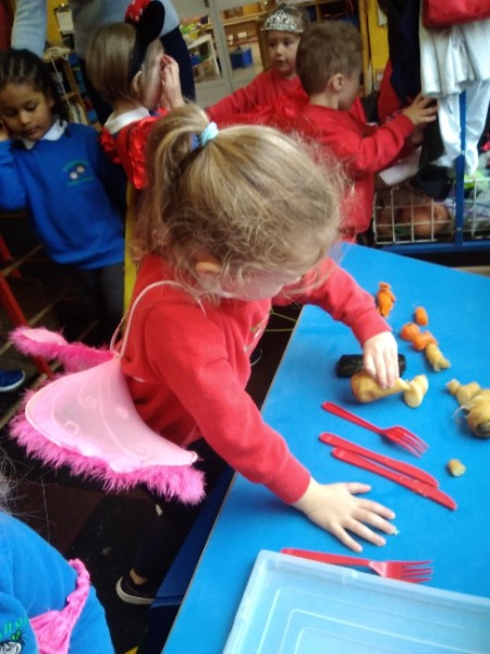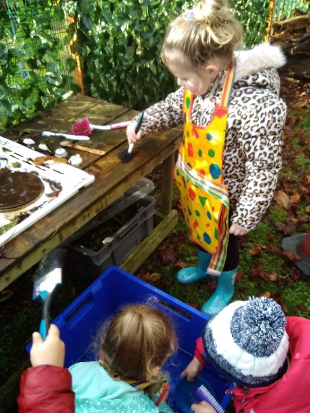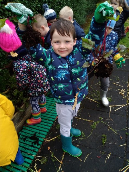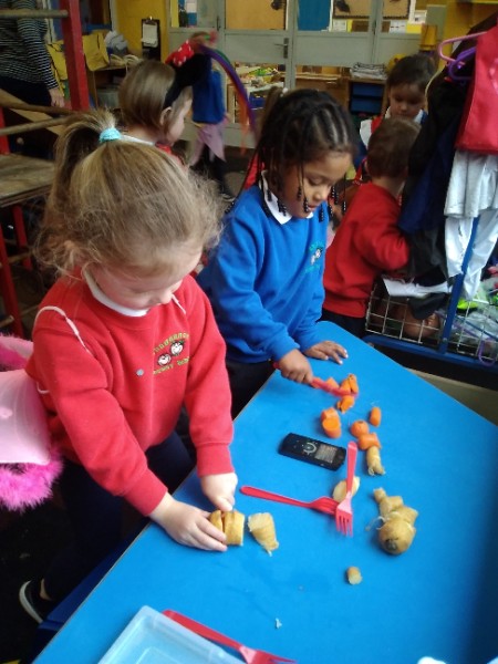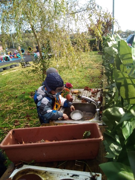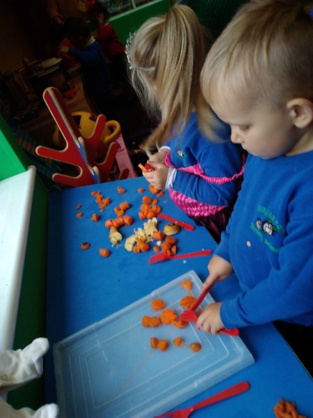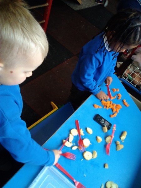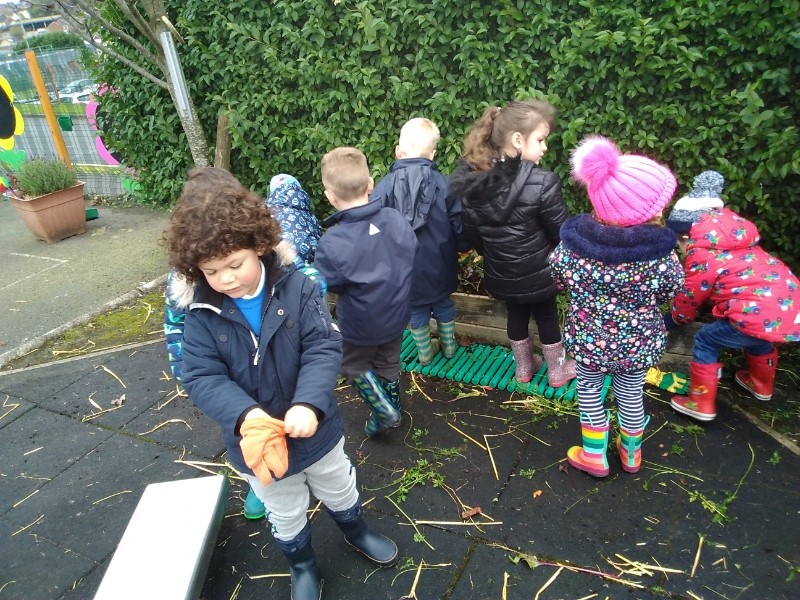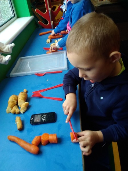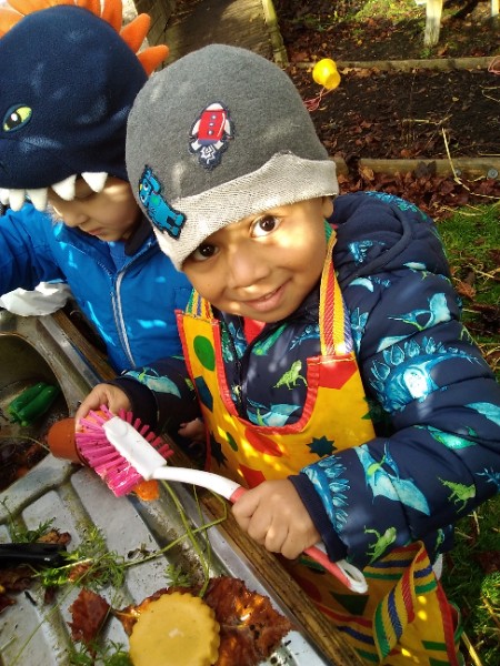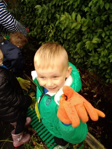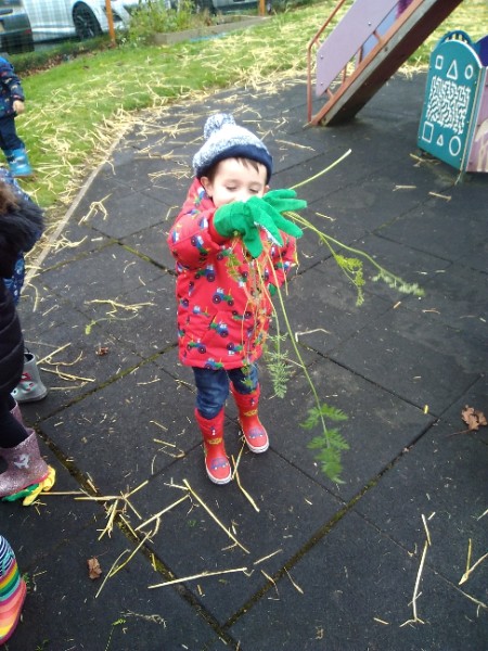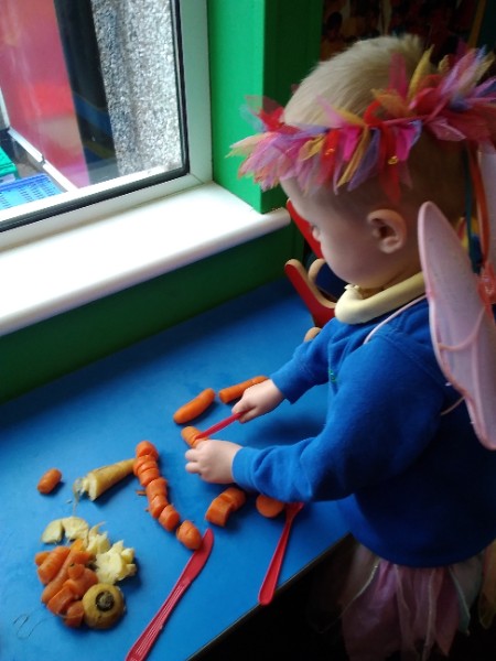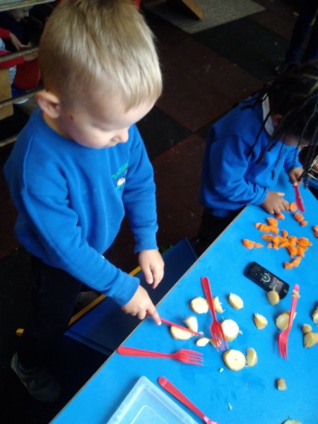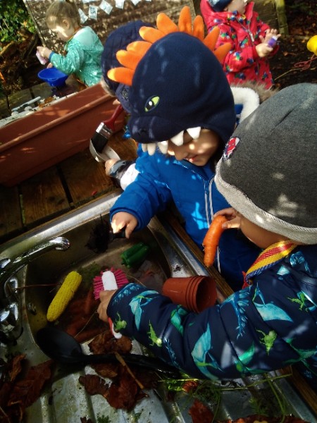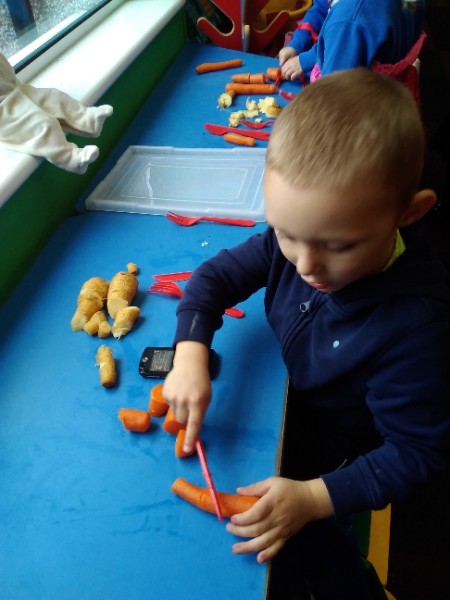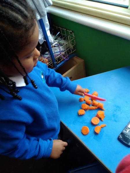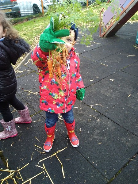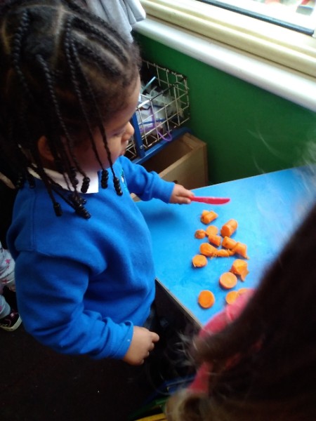 The Nursery children put on their gardening gloves and harvested the vegetables that last year's children planted and grew. We then used scissors to trim their green tops off. We washed and scrubbed them clean. Next we used knifes and forks to slice them up. Next we will be making some soup.