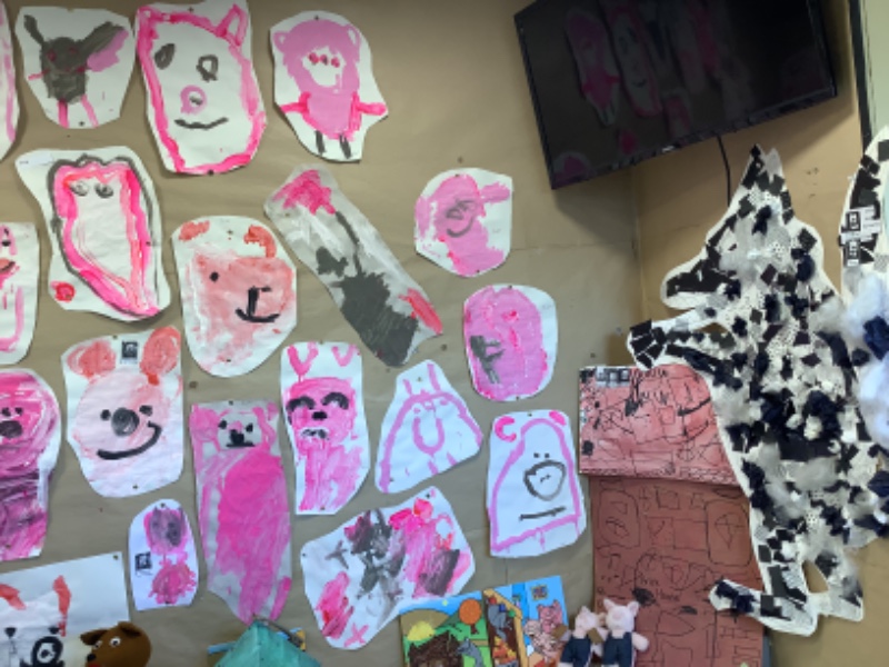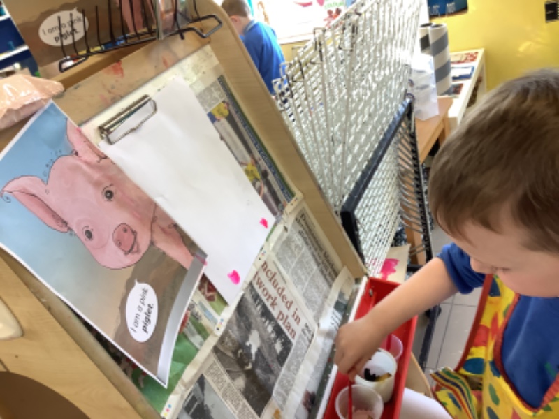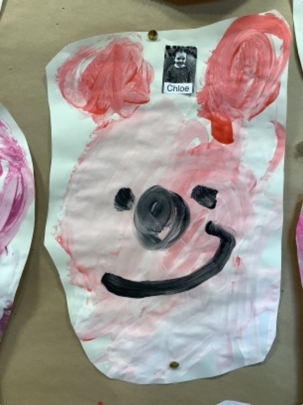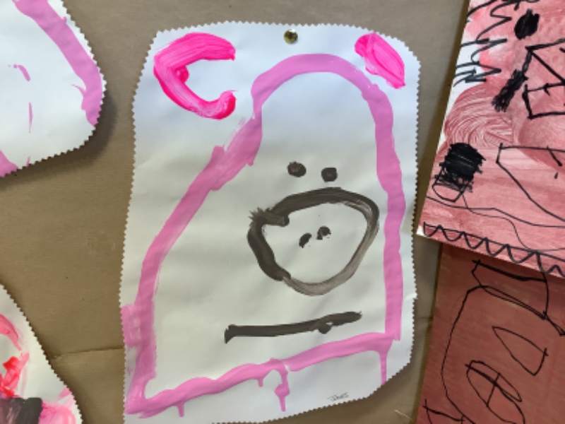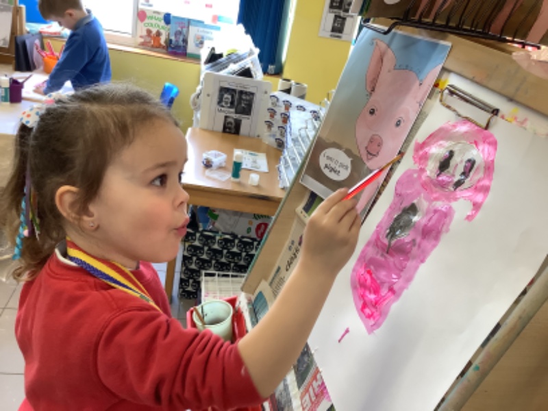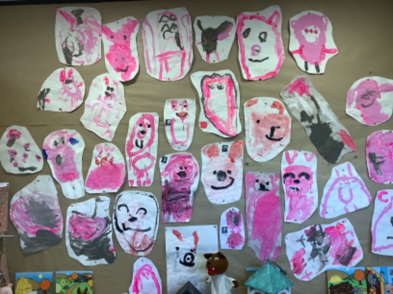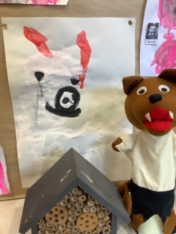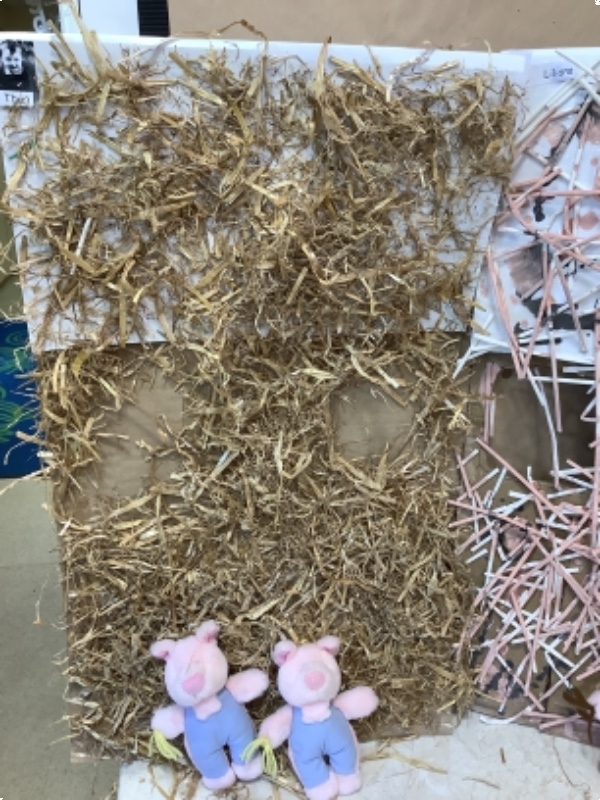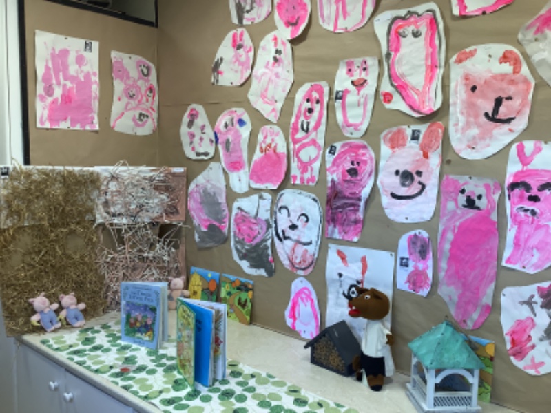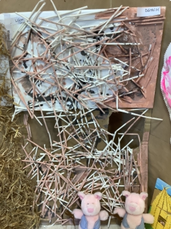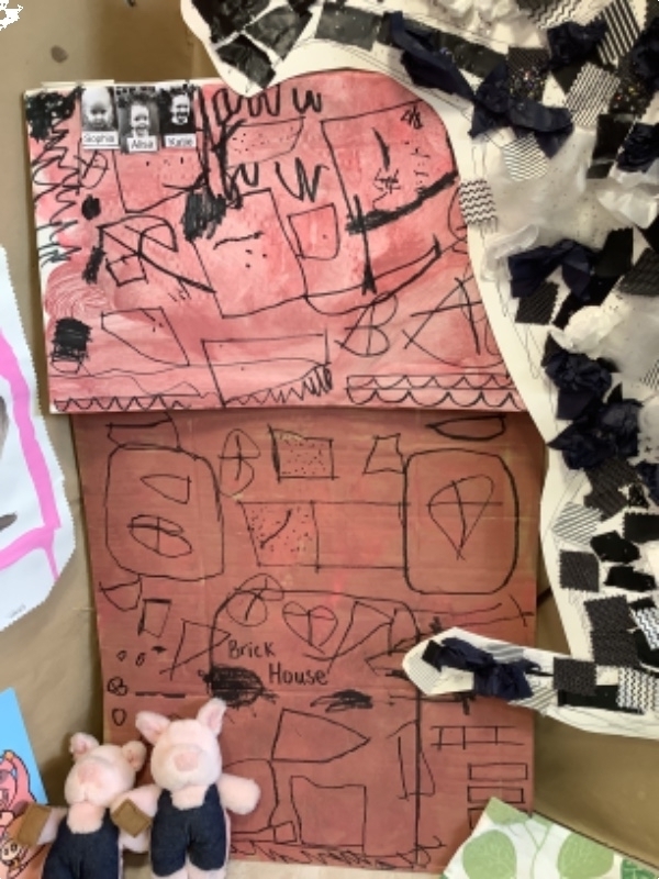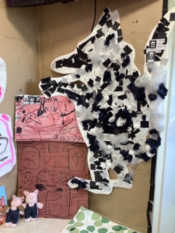Look at our painting of the three little pigs and their houses and the big bad wolf.