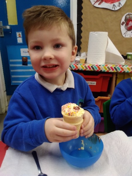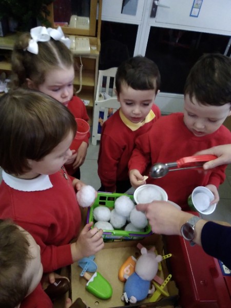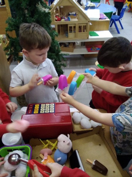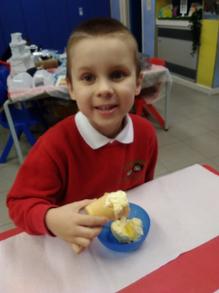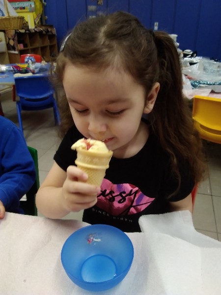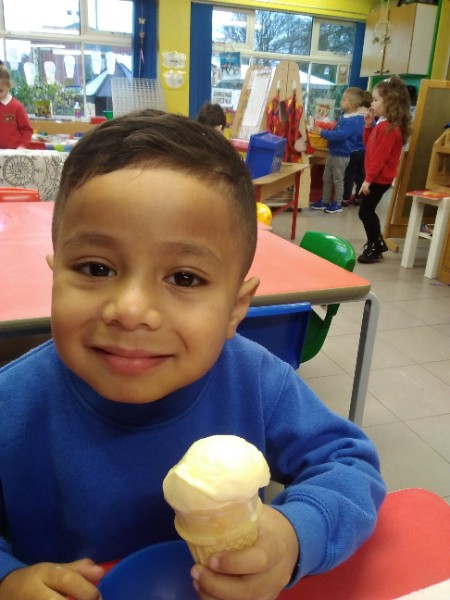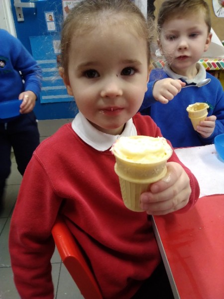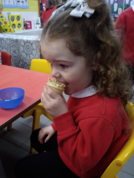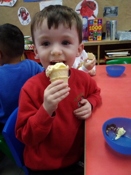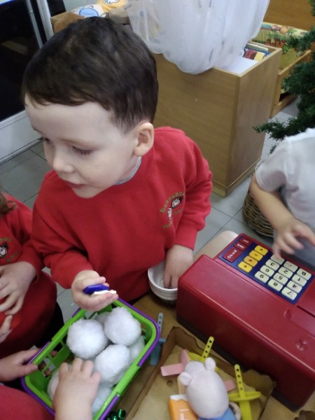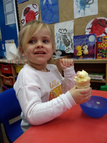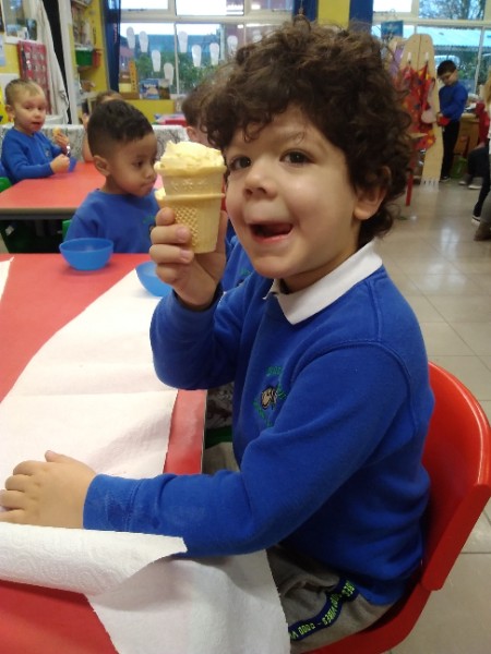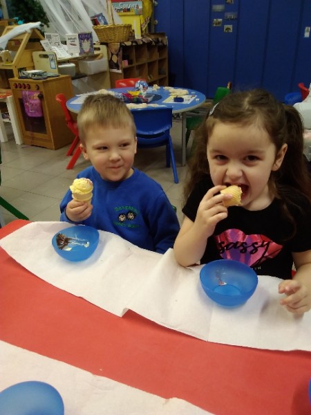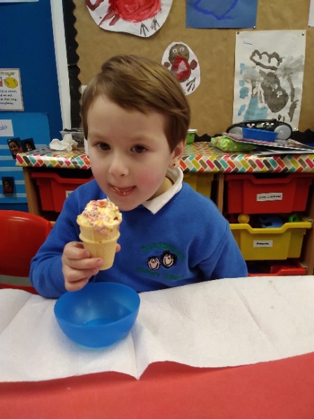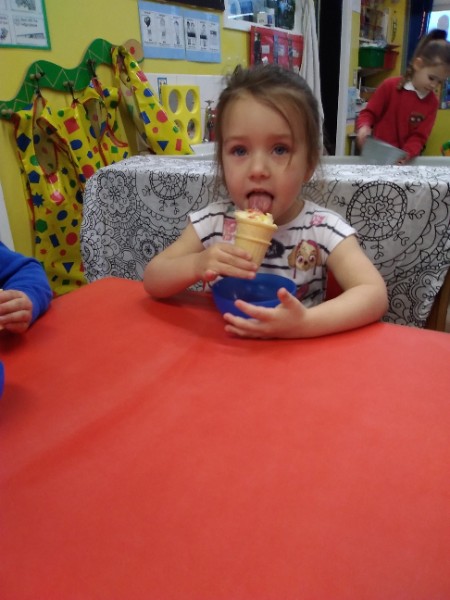 Whilst playing in the home corner some of the children added some fluffy snowballs to pretend they were ice creams. As the staff engage with the children they respond to the direction they take their own play. So Miss Park quickly magiced a cash register, shopping baskets, ice cream cones and an ice cream scoop from Allison our cook to enhance and extend the children's play and Learning. There was a bit of long queue all of sudden. Of course we had to have the real thing - an ice cream snack complete with sprinkles and strawberry sauce.