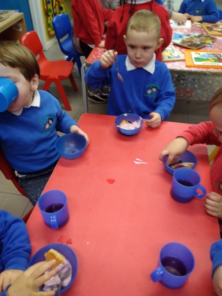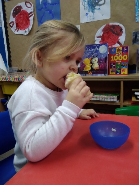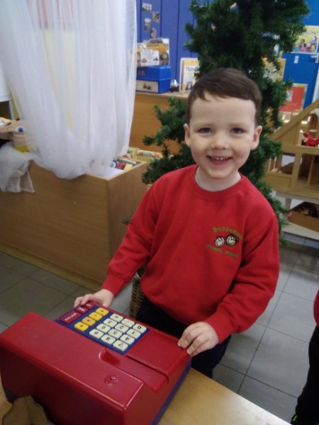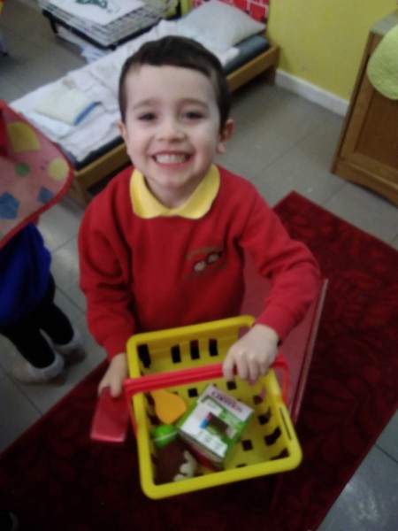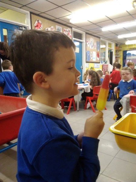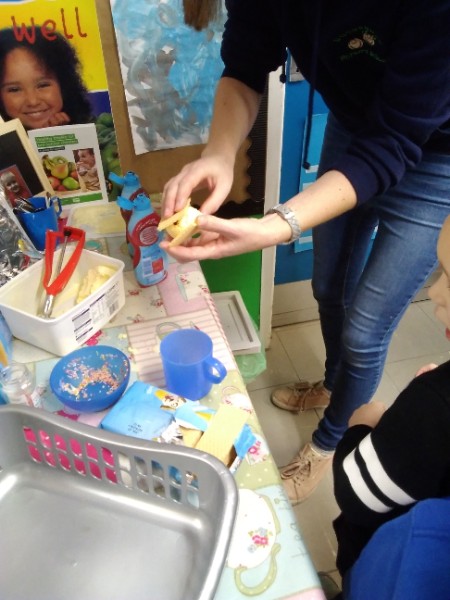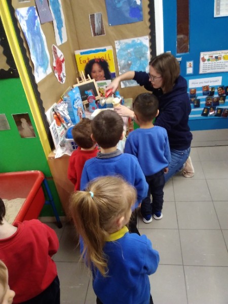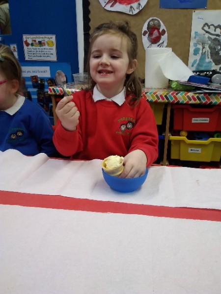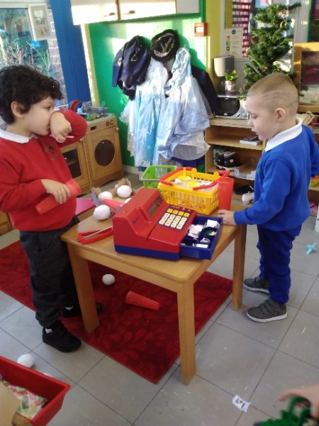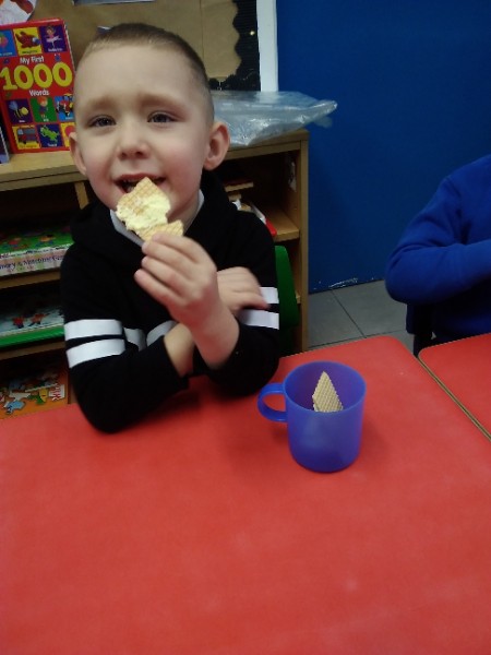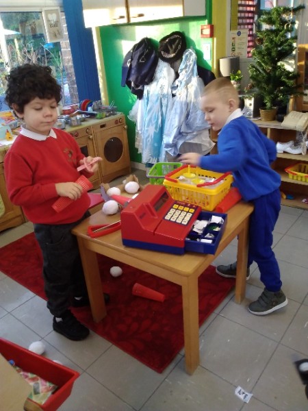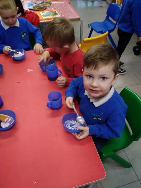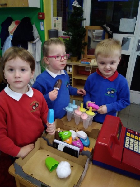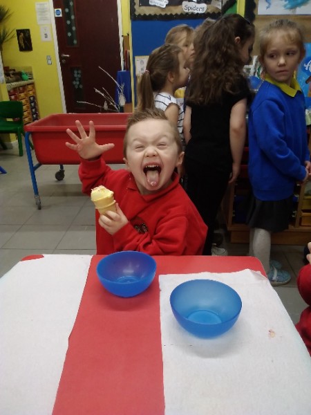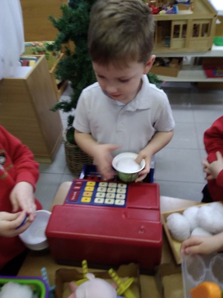 Whilst playing in the home corner some of the children added some fluffy snowballs to pretend they were ice creams. As the staff engage with the children they respond to the direction they take their own play. So Miss Park quickly magiced a cash register, shopping baskets, ice cream cones and an ice cream scoop from Allison our cook to enhance and extend the children's play and Learning. There was a bit of long queue all of sudden. Of course we had to have the real thing - an ice cream snack complete with sprinkles and strawberry sauce.