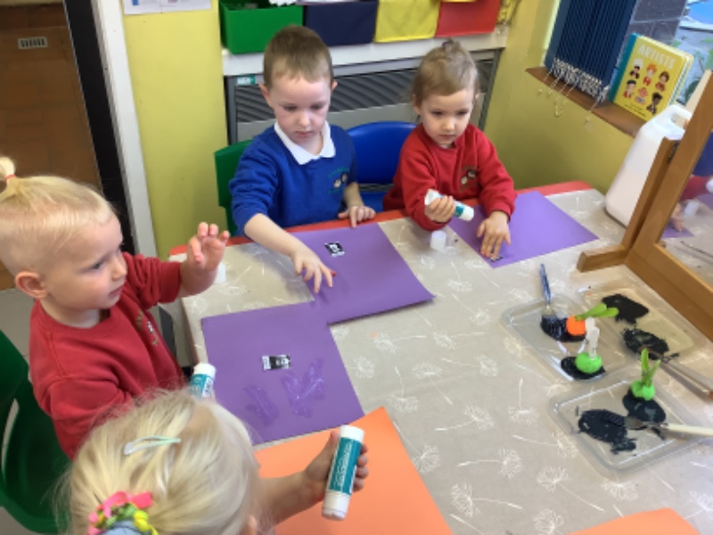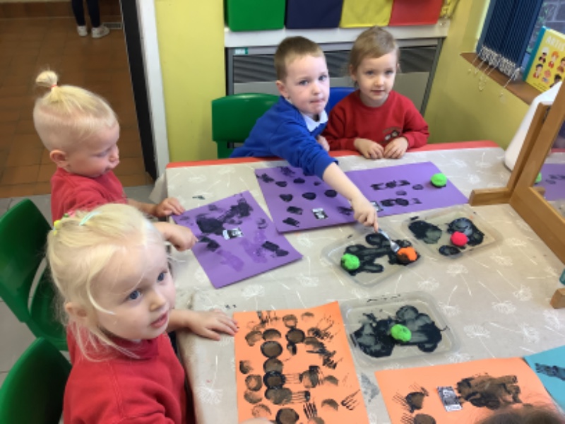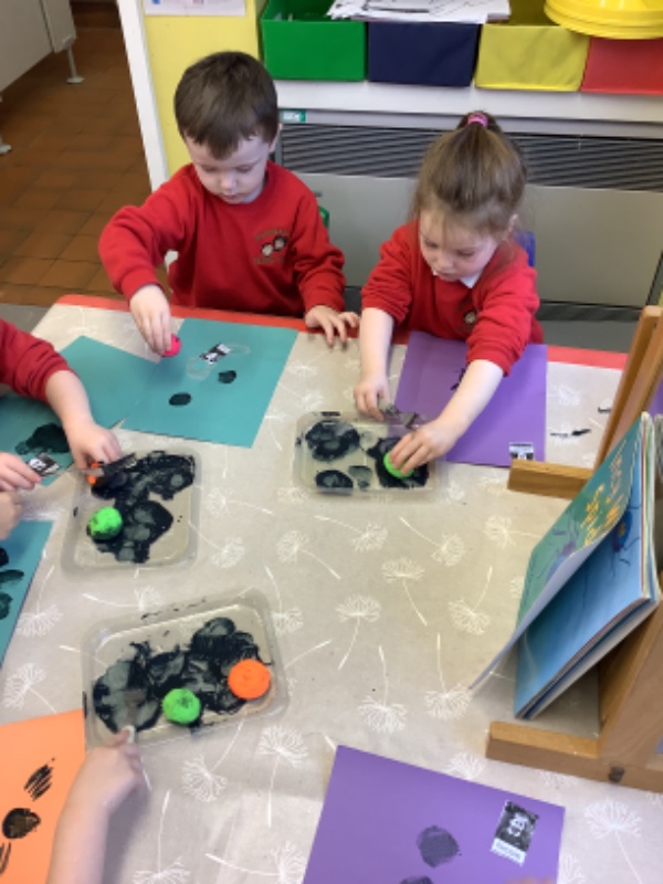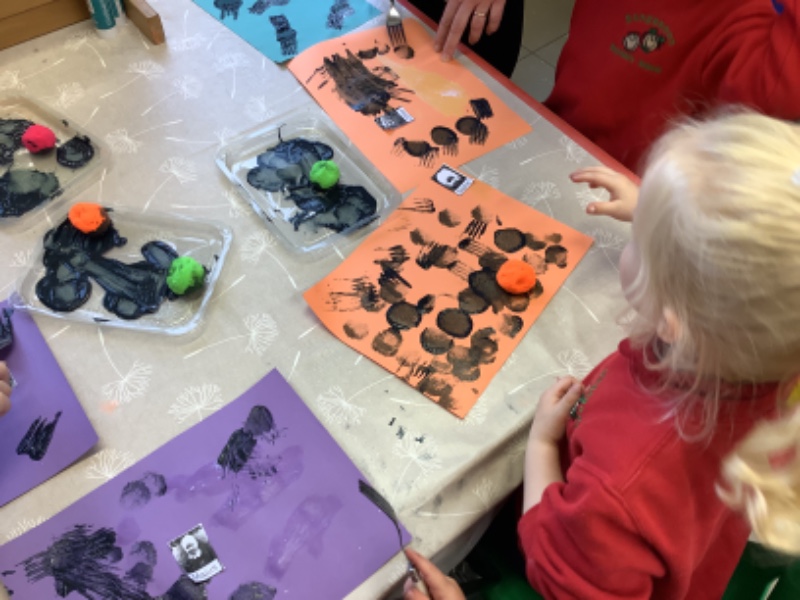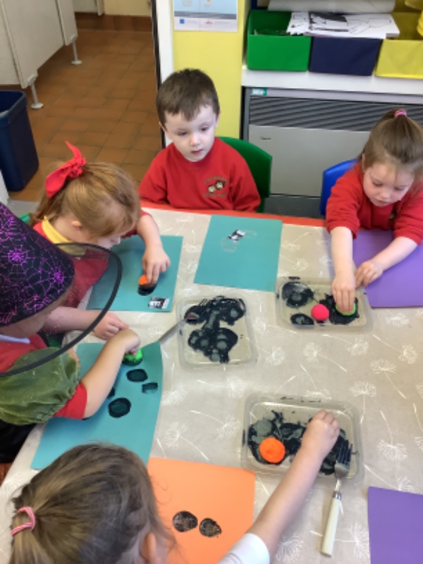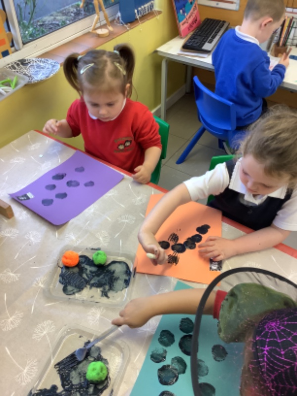 We printed spider pictures with pom poms and forks.