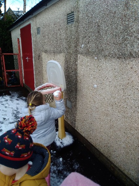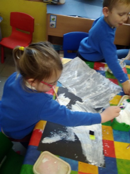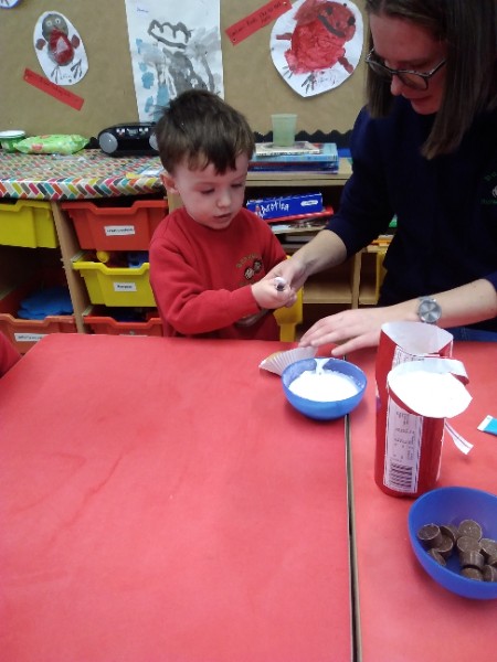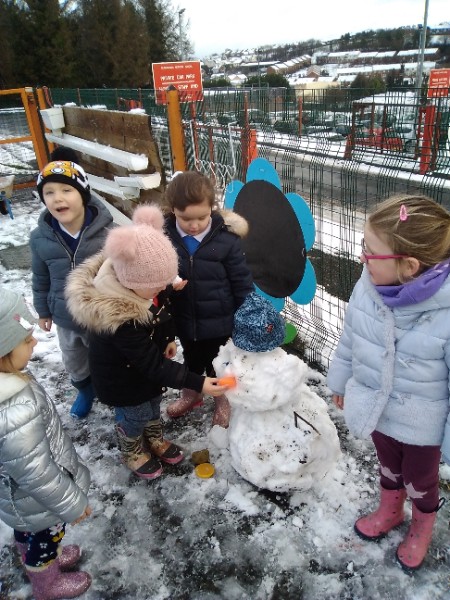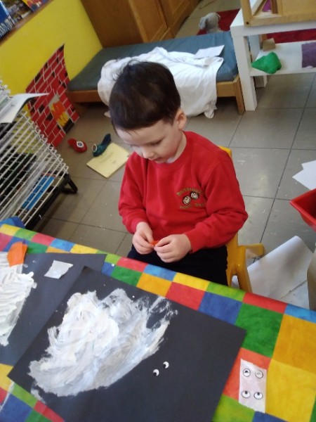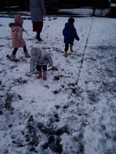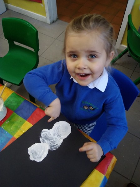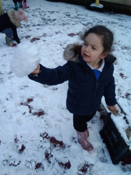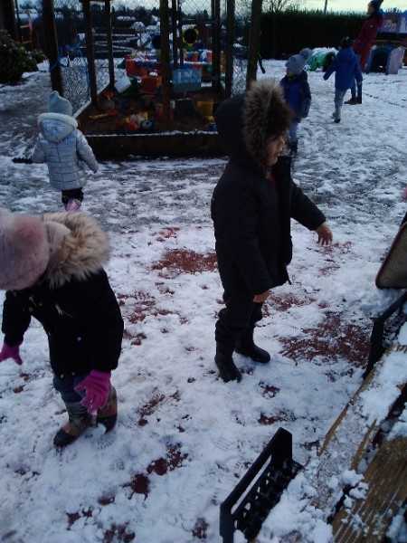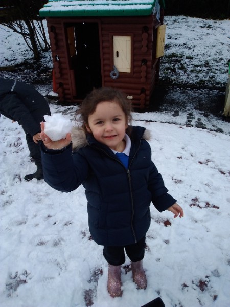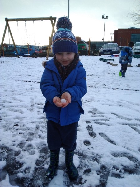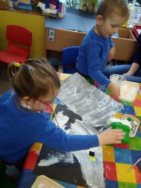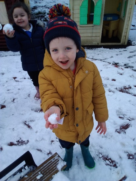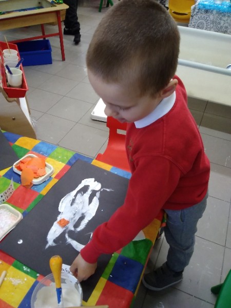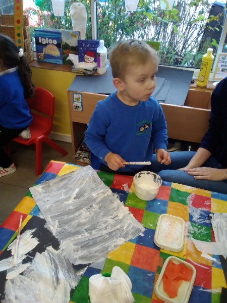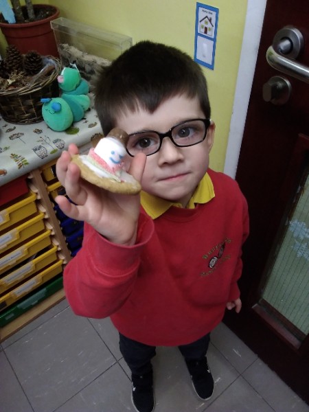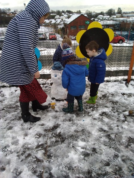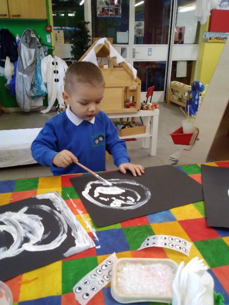 It Snowed on Tuesday! Mrs Hudson's boys and girls were very excited. Being led by the children's environment and the children's interest staff provided opportunities for the children to explore and investigate snow. There was lots of language development as we described the snow as we played outside. We developed our physical skills as we moved, pushed and lifted snow. We developed our maths skills as we compared snowball size and shape. We developed our painting skills as painted snowy pictures and even snowmen. Best of all we designed and made our own melting snowmen biscuits.