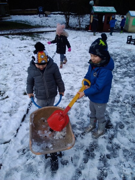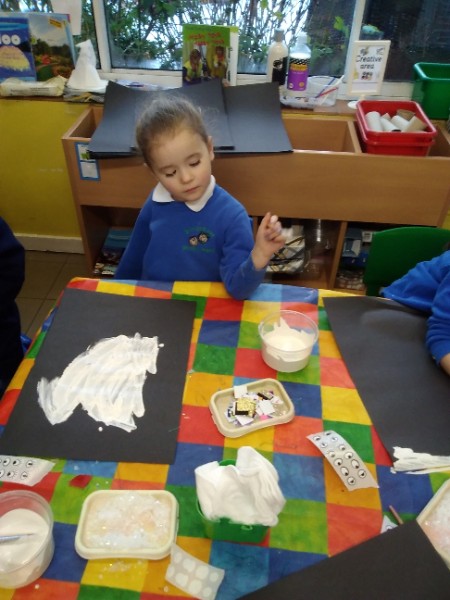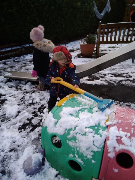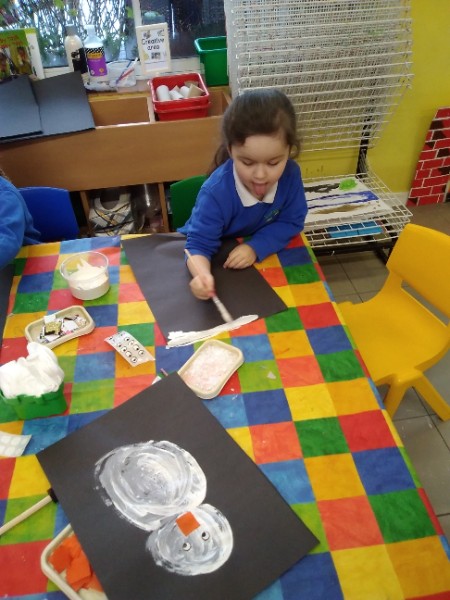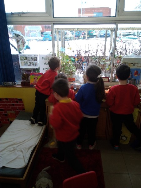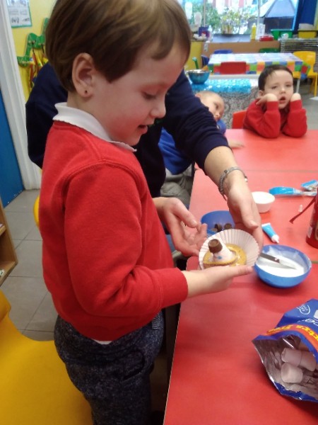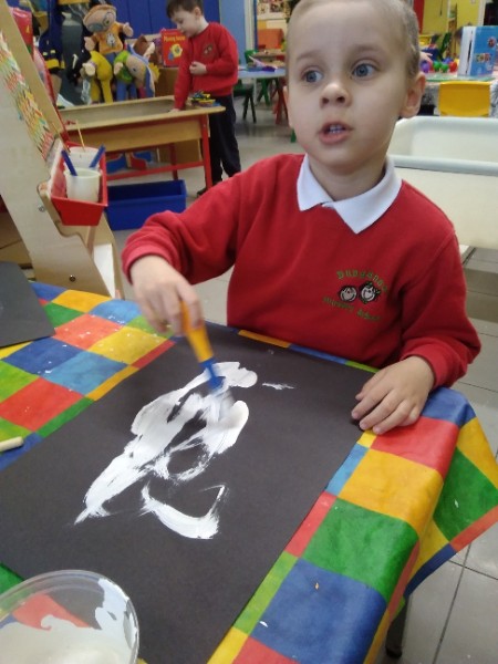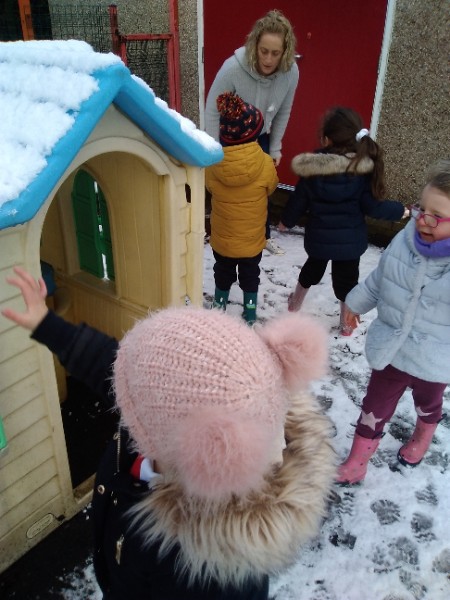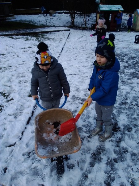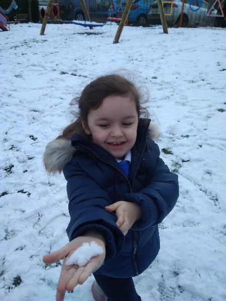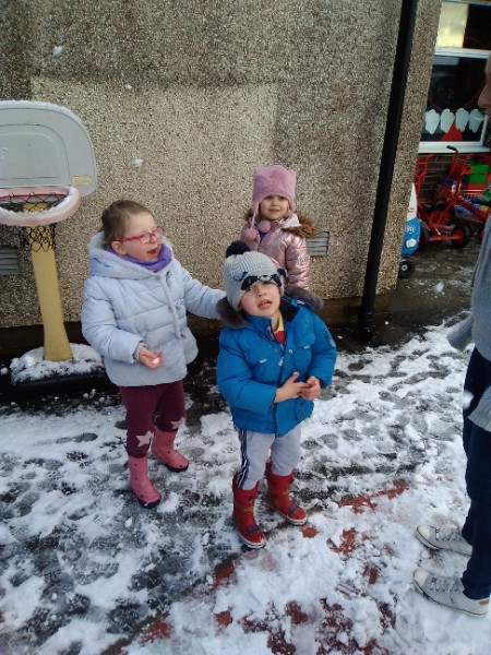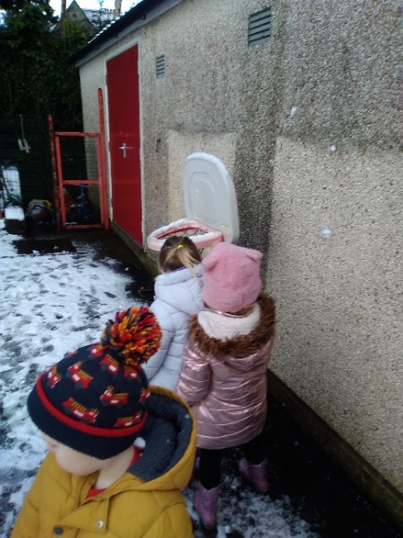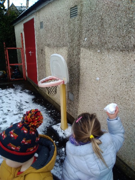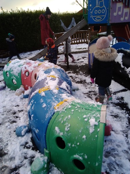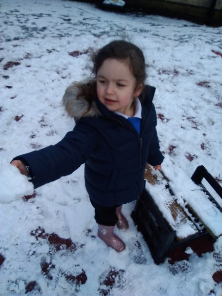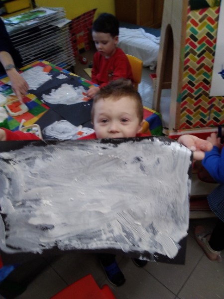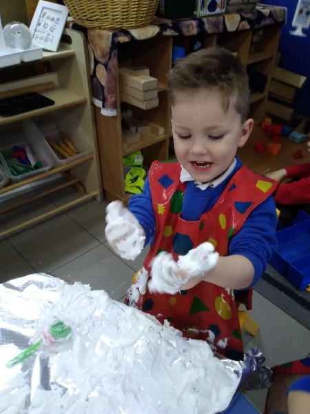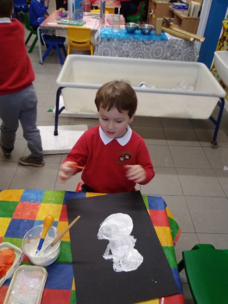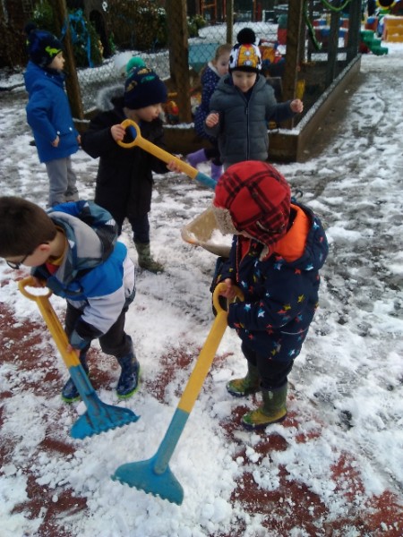 It Snowed on Tuesday! Mrs Hudson's boys and girls were very excited. Being led by the children's environment and the children's interest staff provided opportunities for the children to explore and investigate snow. There was lots of language development as we described the snow as we played outside. We developed our physical skills as we moved, pushed and lifted snow. We developed our maths skills as we compared snowball size and shape. We developed our painting skills as painted snowy pictures and even snowmen. Best of all we designed and made our own melting snowmen biscuits.