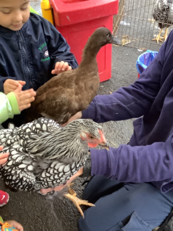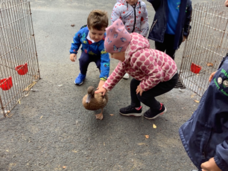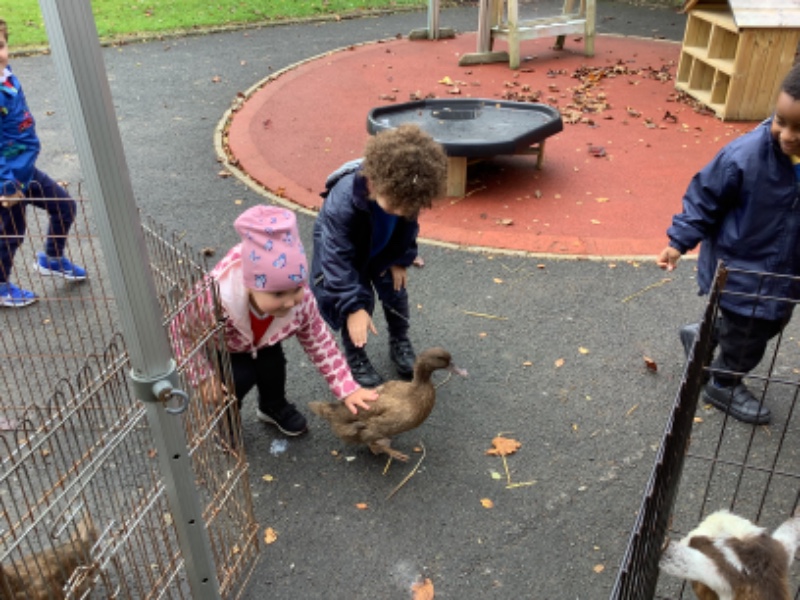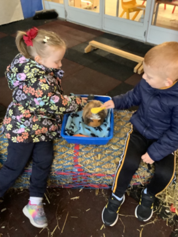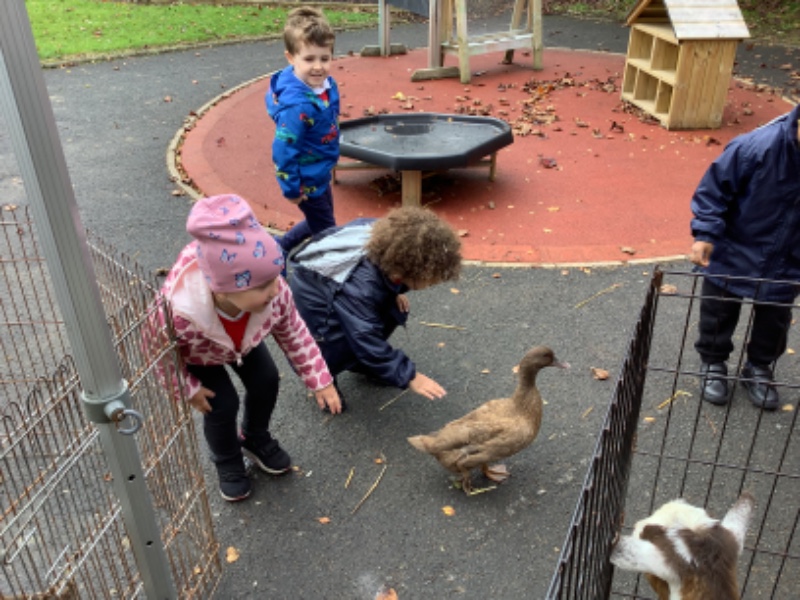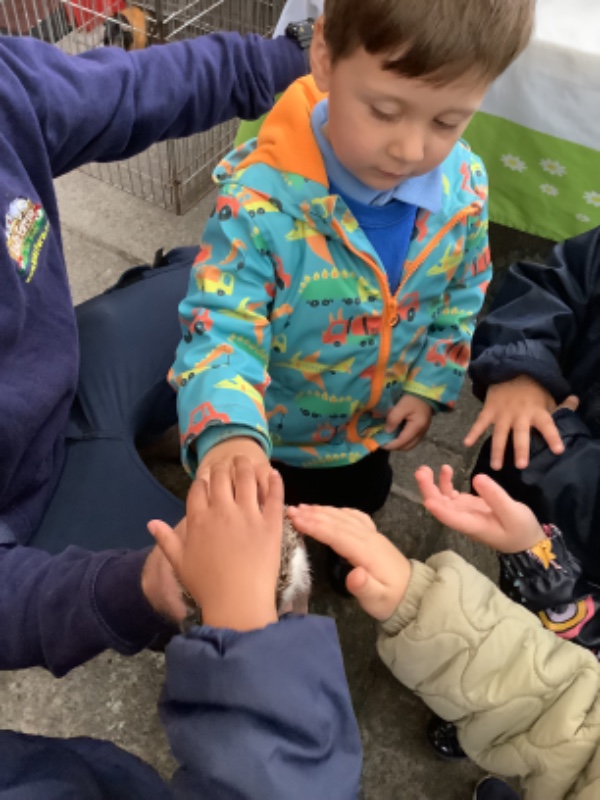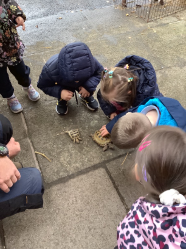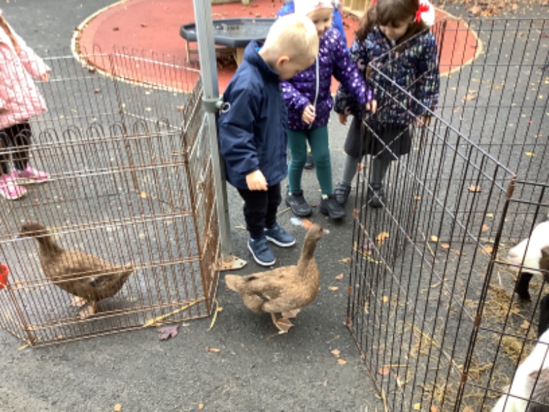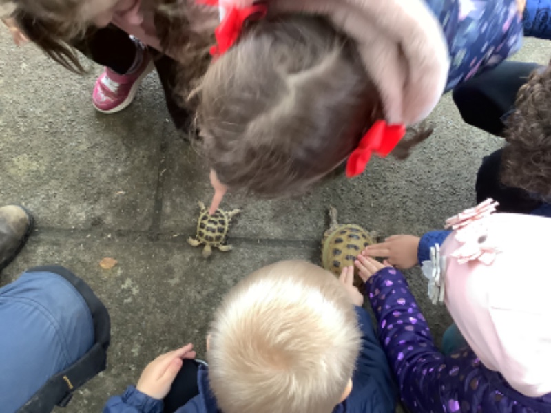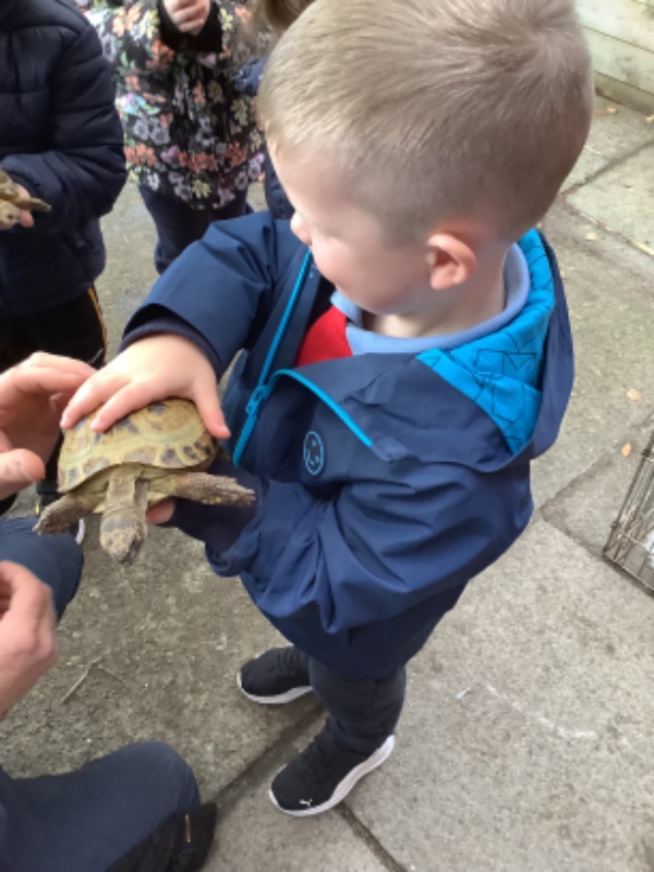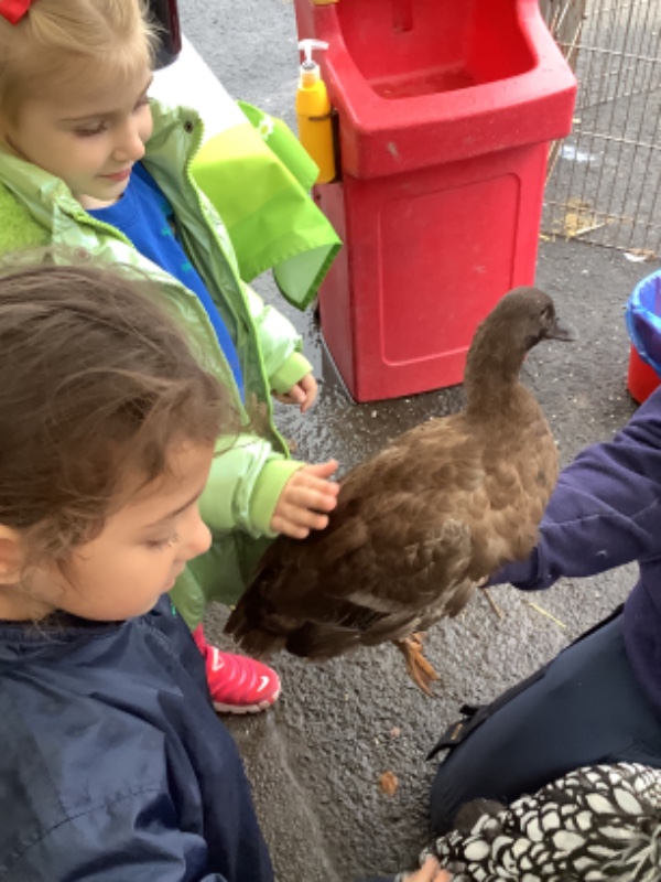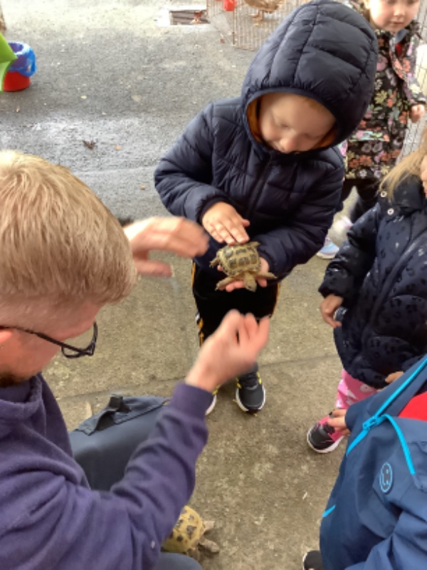 Today the children had so much fun experiencing all the noises,smells and touch of the animals. They all brushed the rabbits and Guinea pigs fur. We discussed how prickly the hedgehog was,how soft the duck was, how hard the tortoise was and how long the snake was. We practiced our best duck waddles around the playground after the ducks.