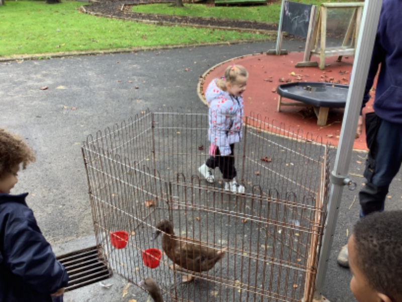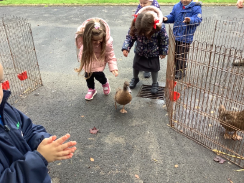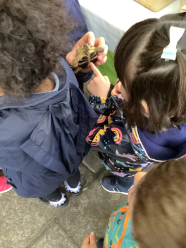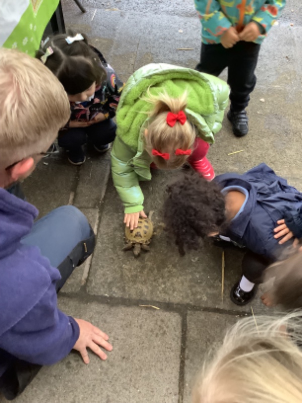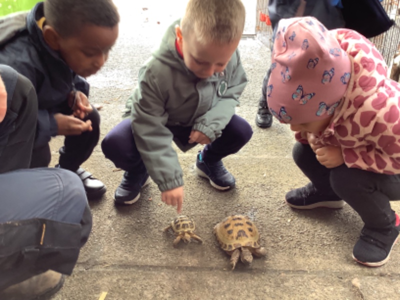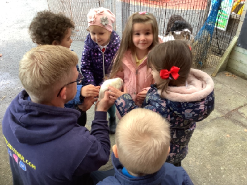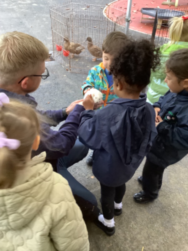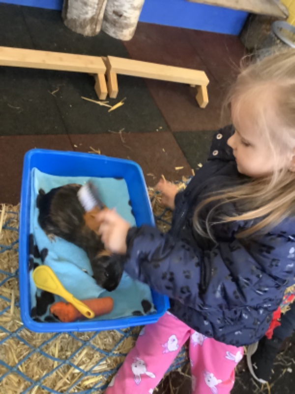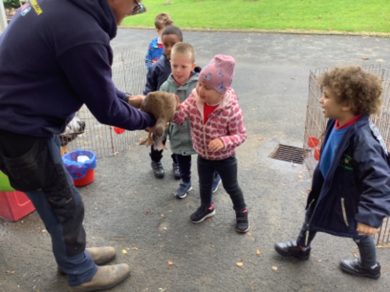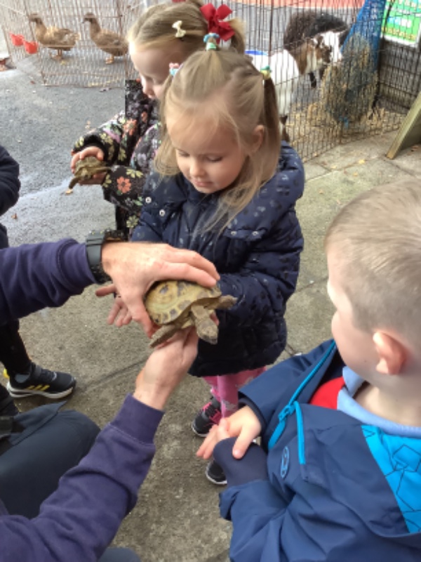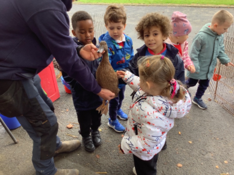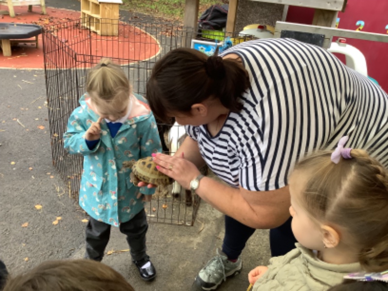 Today the children had so much fun experiencing all the noises,smells and touch of the animals. They all brushed the rabbits and Guinea pigs fur. We discussed how prickly the hedgehog was,how soft the duck was, how hard the tortoise was and how long the snake was. We practiced our best duck waddles around the playground after the ducks.
