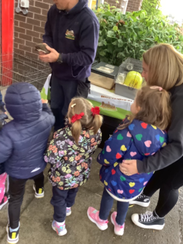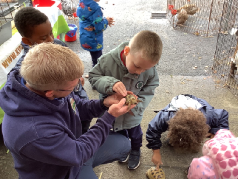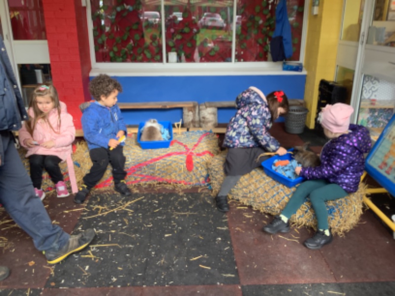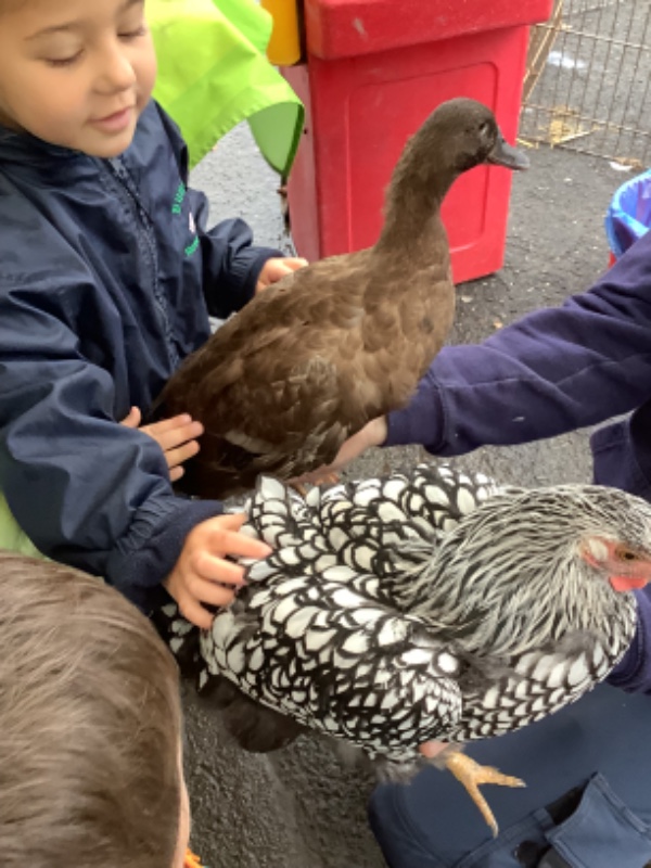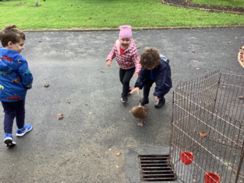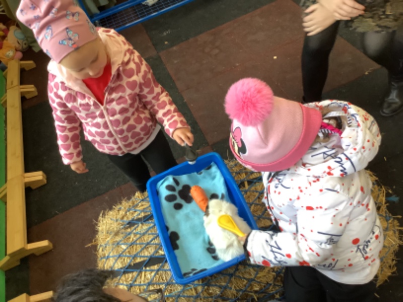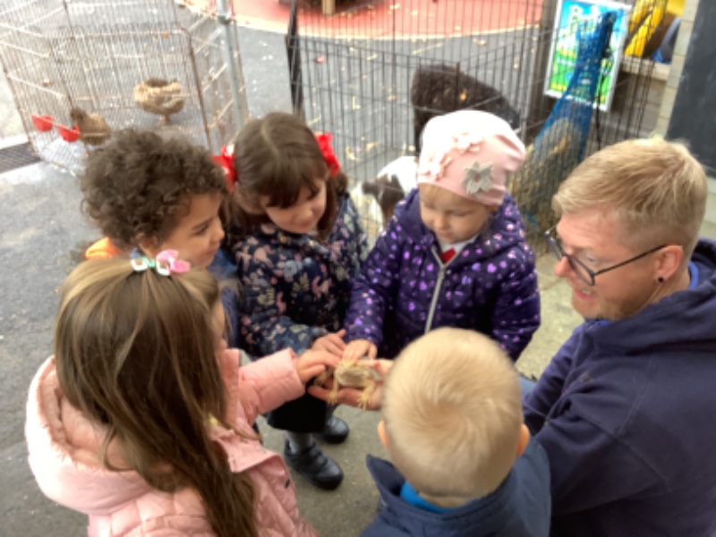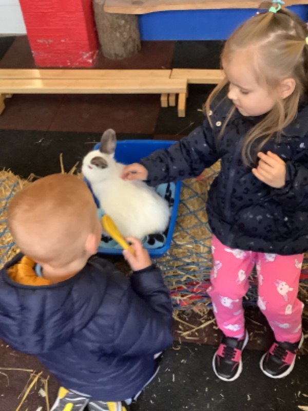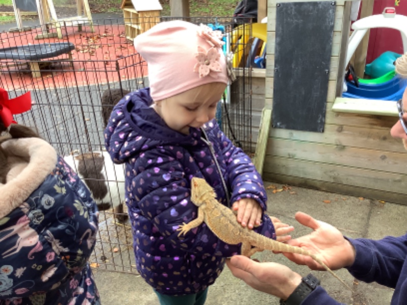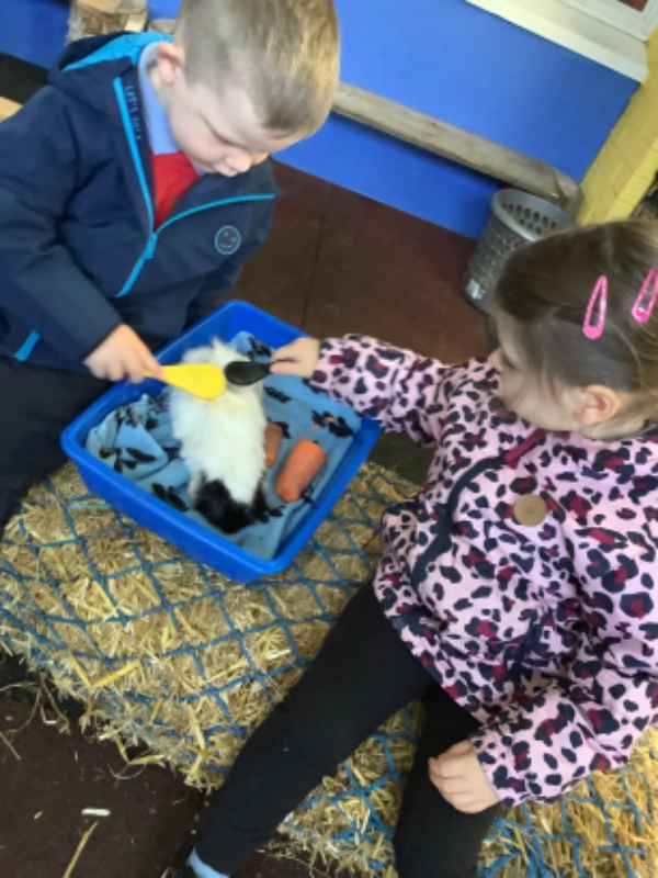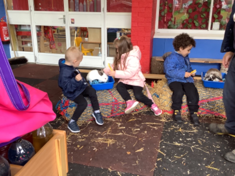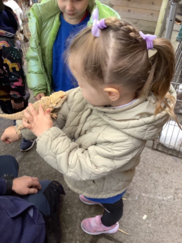 Today the children had so much fun experiencing all the noises,smells and touch of the animals. They all brushed the rabbits and Guinea pigs fur. We discussed how prickly the hedgehog was,how soft the duck was, how hard the tortoise was and how long the snake was. We practiced our best duck waddles around the playground after the ducks.