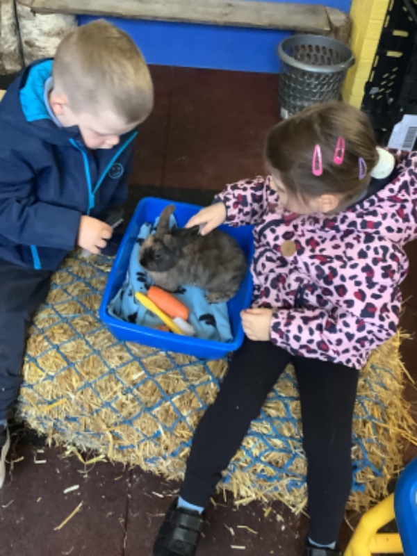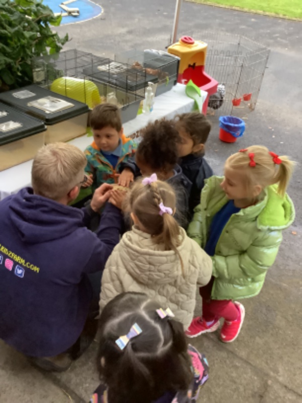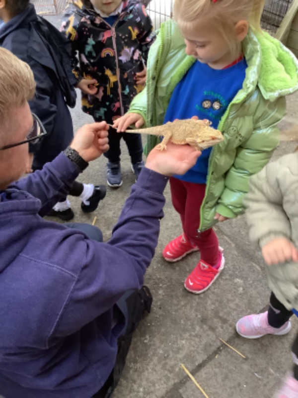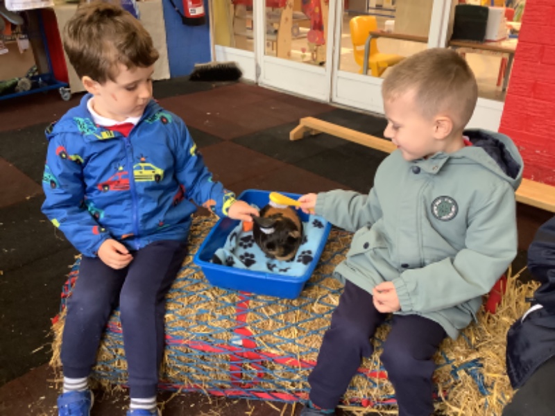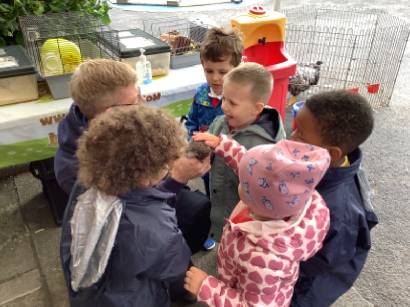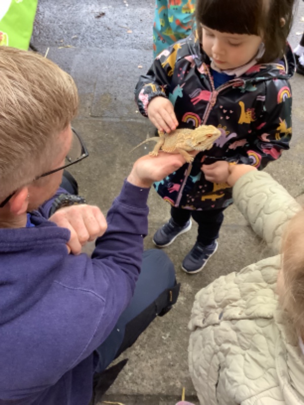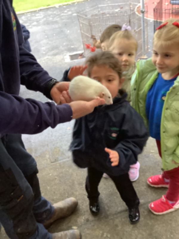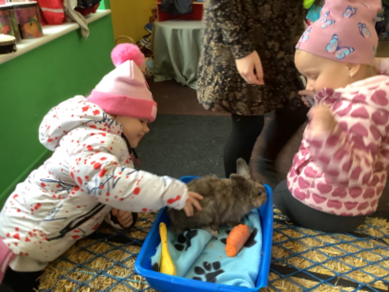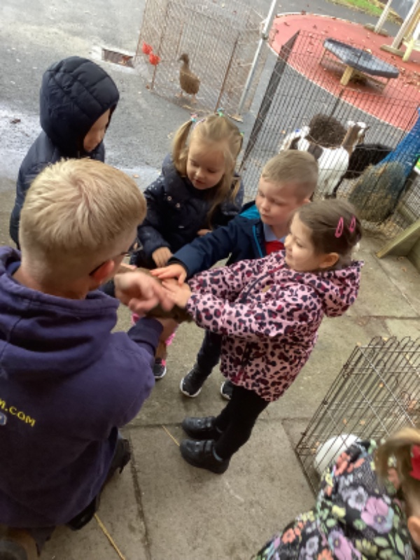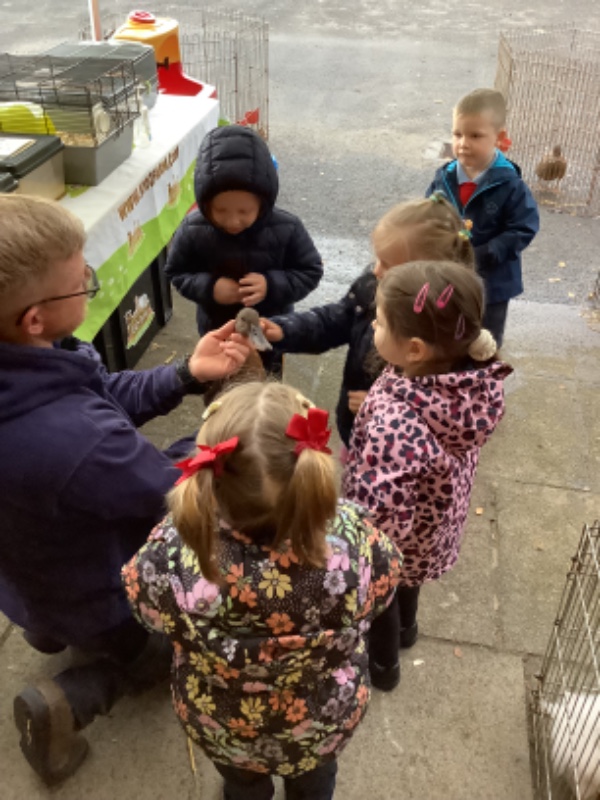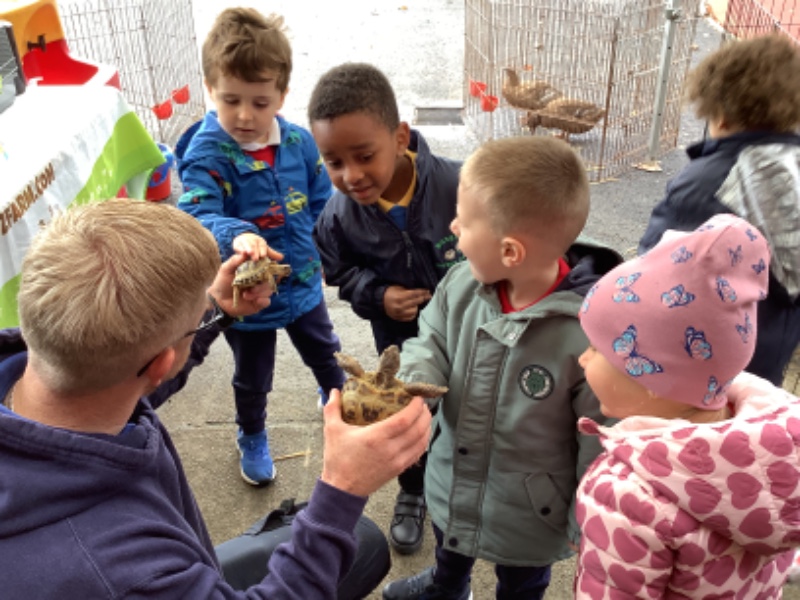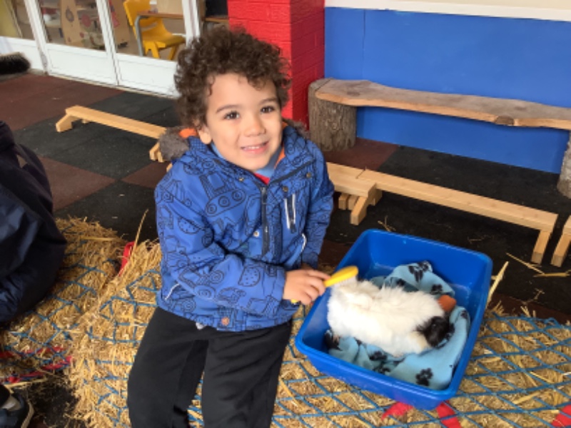 Today the children had so much fun experiencing all the noises,smells and touch of the animals. They all brushed the rabbits and Guinea pigs fur. We discussed how prickly the hedgehog was,how soft the duck was, how hard the tortoise was and how long the snake was. We practiced our best duck waddles around the playground after the ducks.