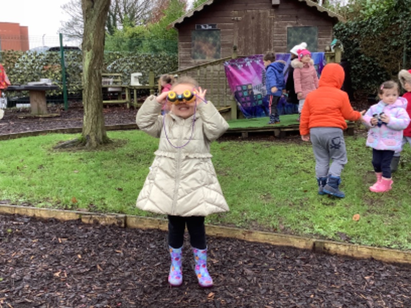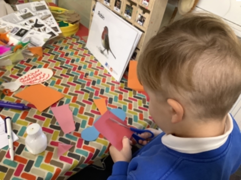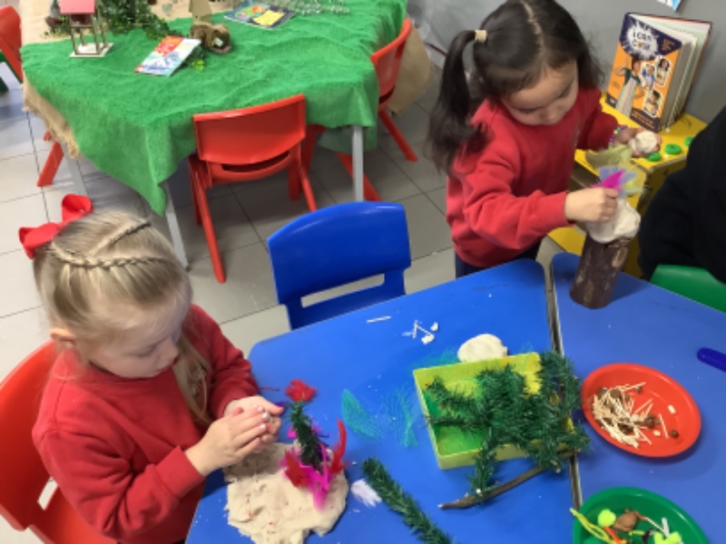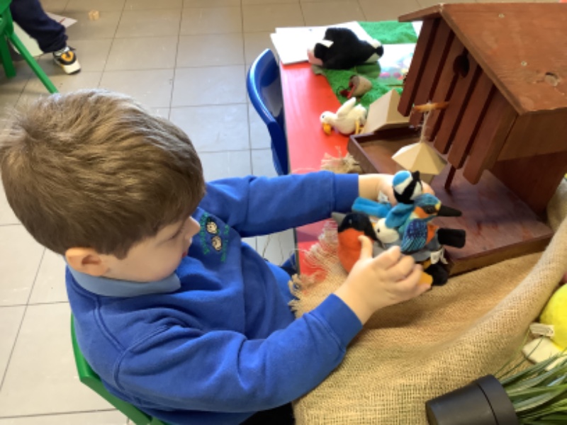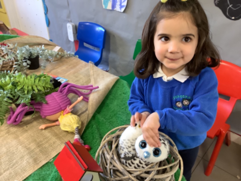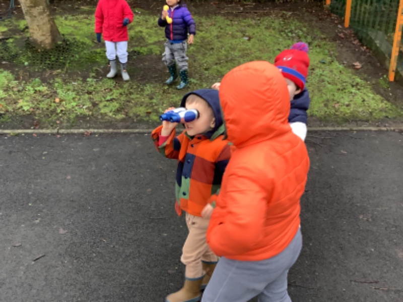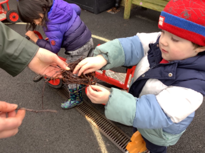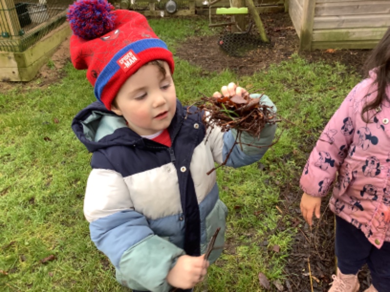 Nursery 2 made our very own binoculars in class and have been very busy using them to search for birds through the windows, in the playground and around our classroom. The children have enjoyed learning about various different types of birds we might find in our country with Mrs Allen. James and Nikita used twigs, leaves and moss from the playground to create a fantastic nest.