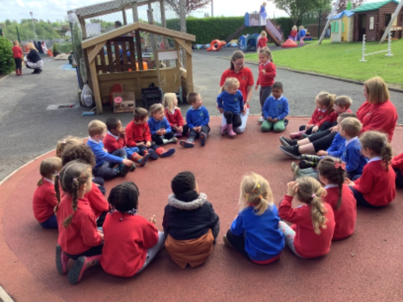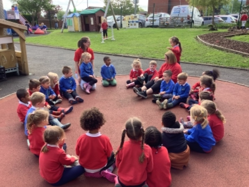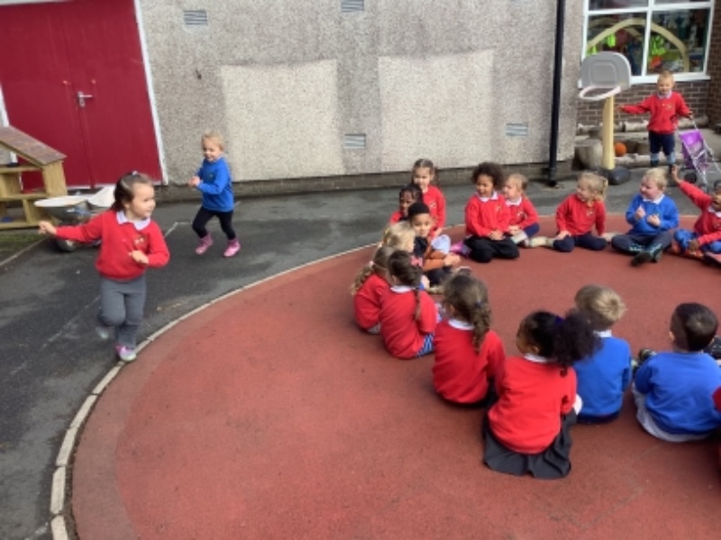 The children are enjoying snack outdoors, gardening and planting and playing organised games together.