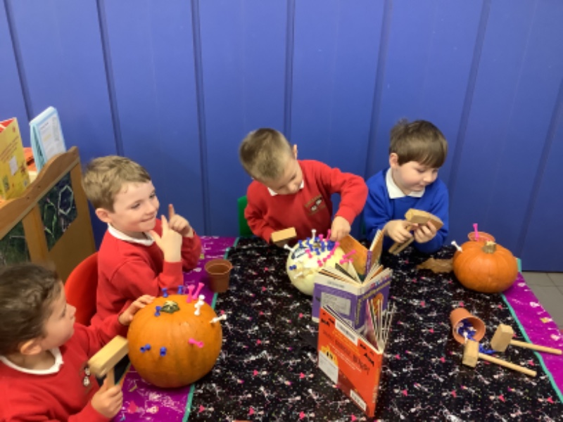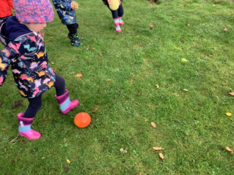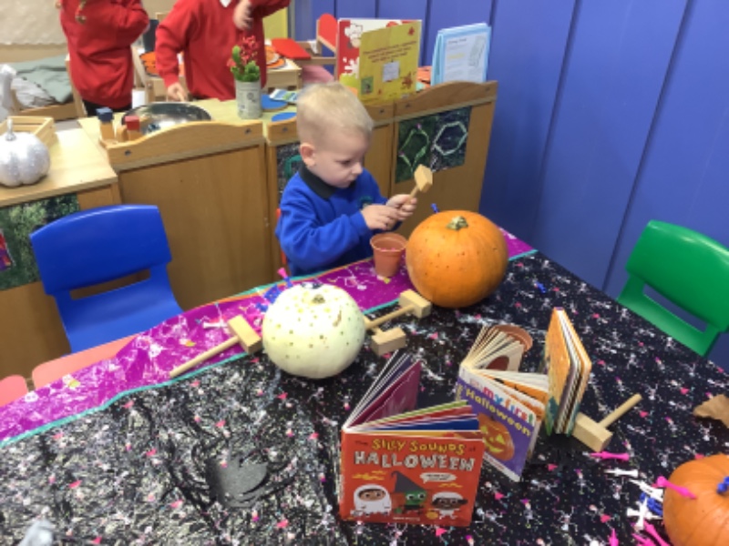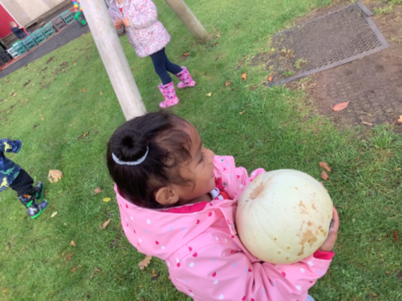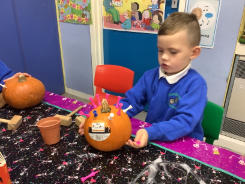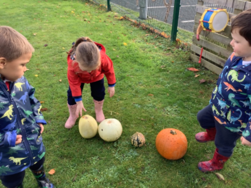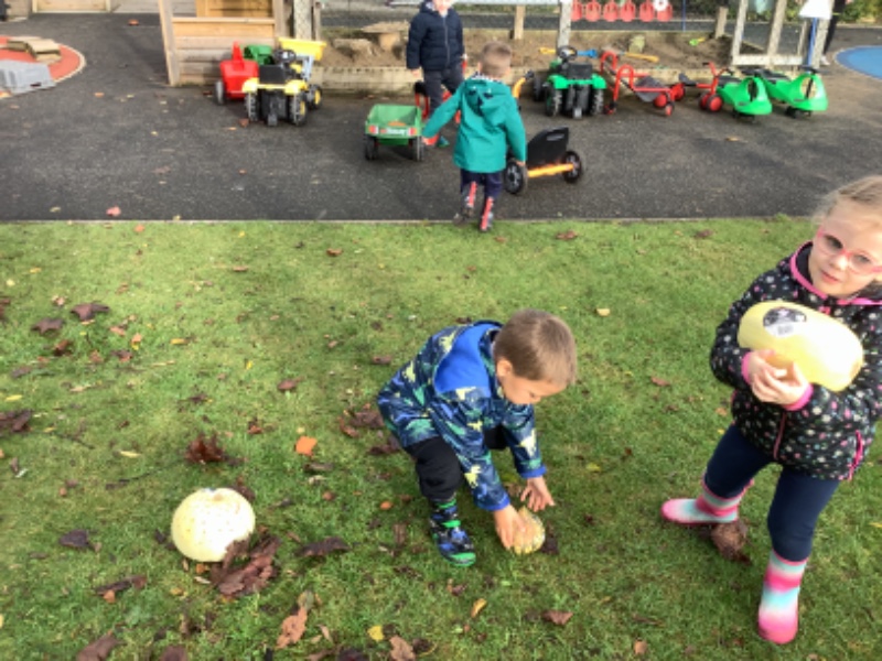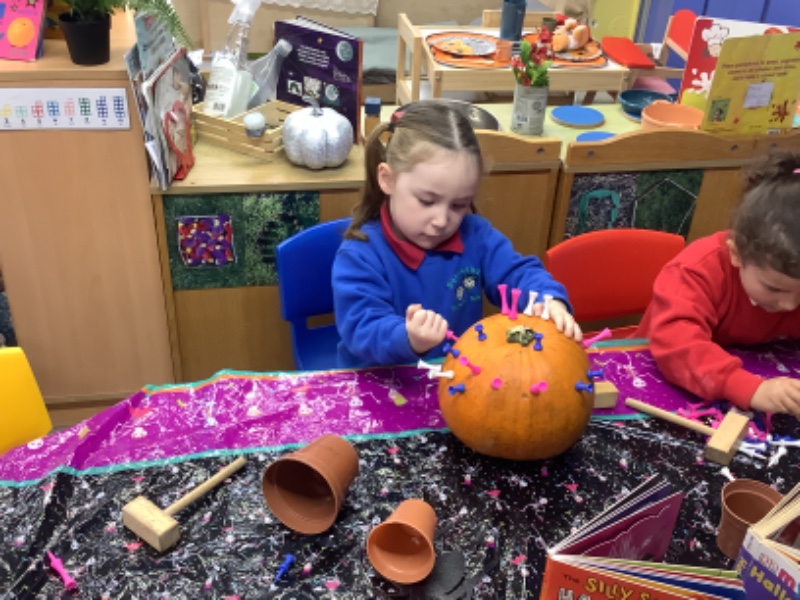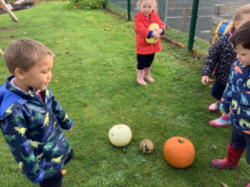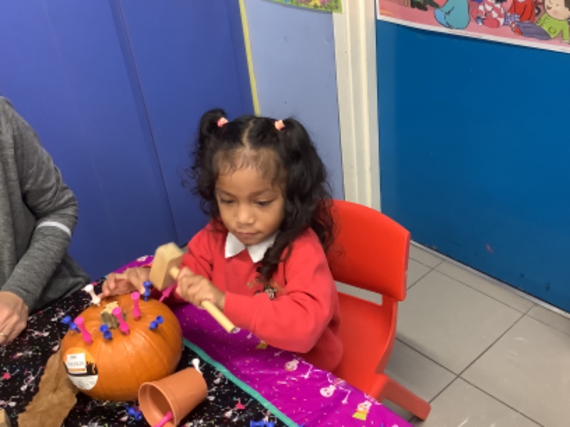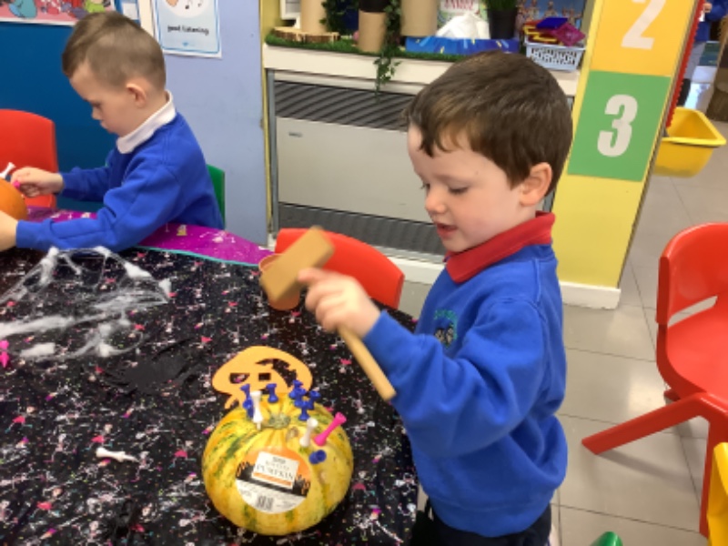 The children enjoyed lifting and moving the pumpkins around the nursery garden. We talked about the different shapes, sizes and colours. The children talked about how heavy the pumpkins were and also chased the pumpkins as they rolled down the hill! The children have developed their hand eye coordination as they hammer golf tees into the pumpkins and strengthen their hand muscles as they pull them out. Watch out for more pumpkin scooping and carving later this week!