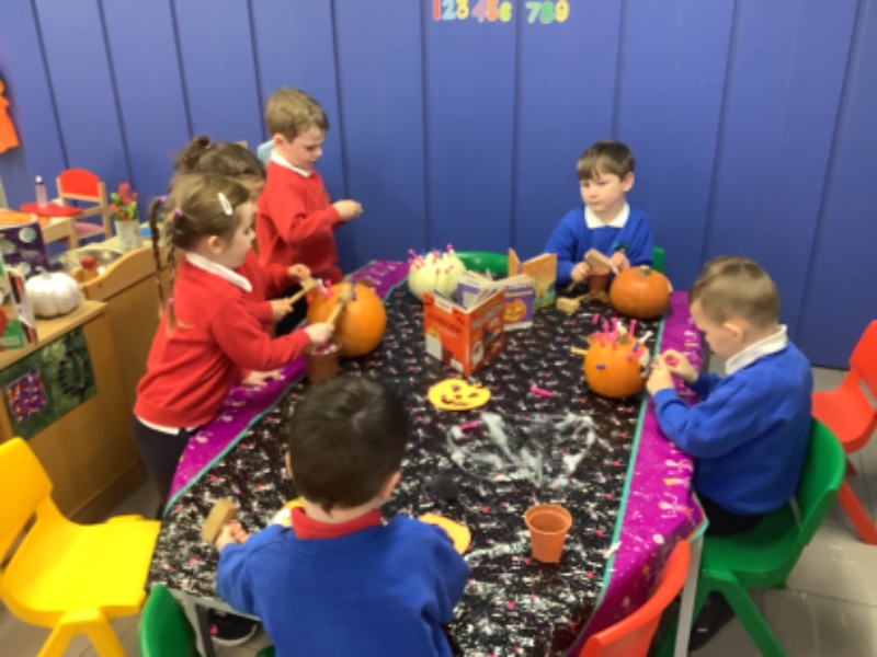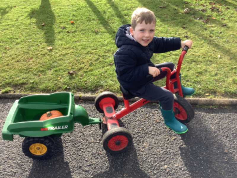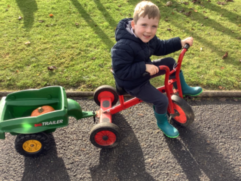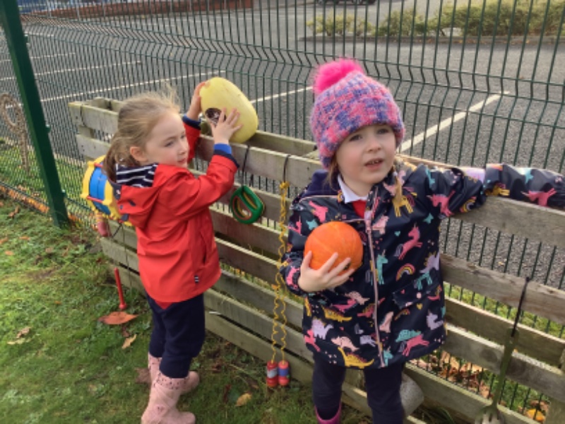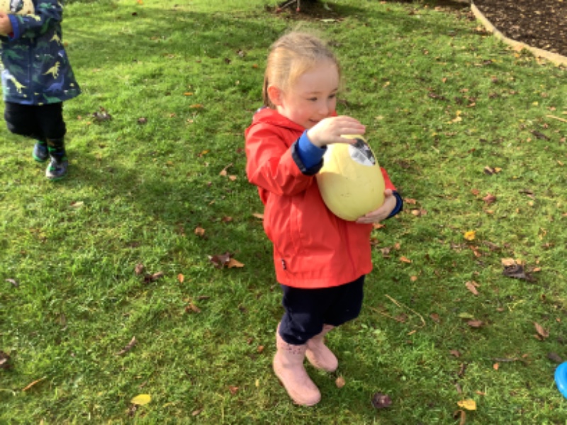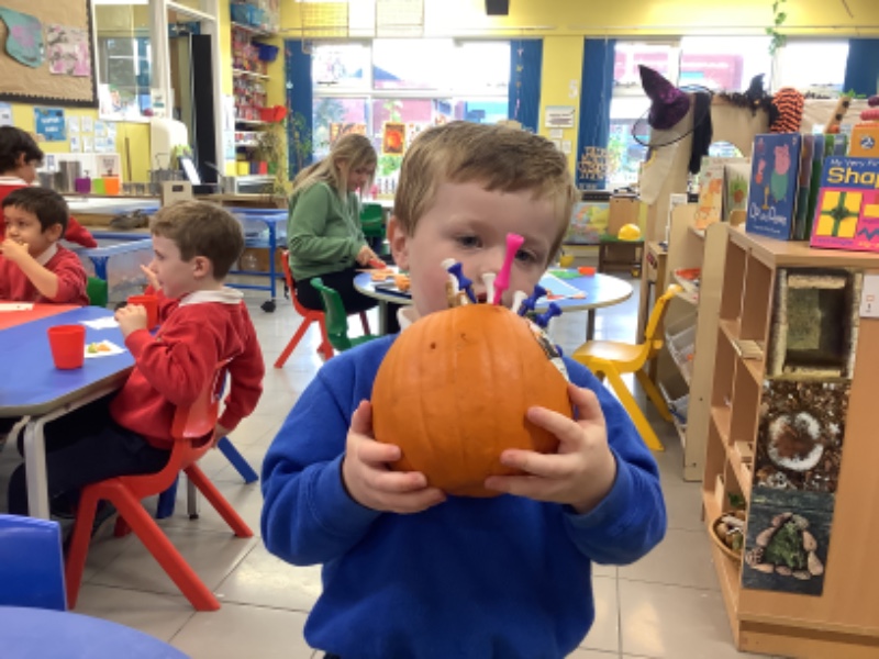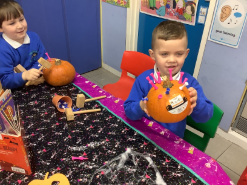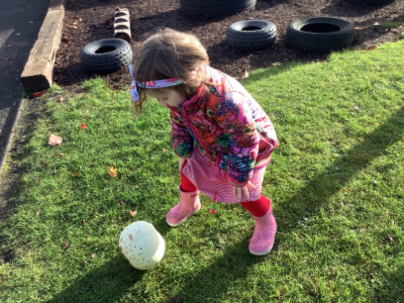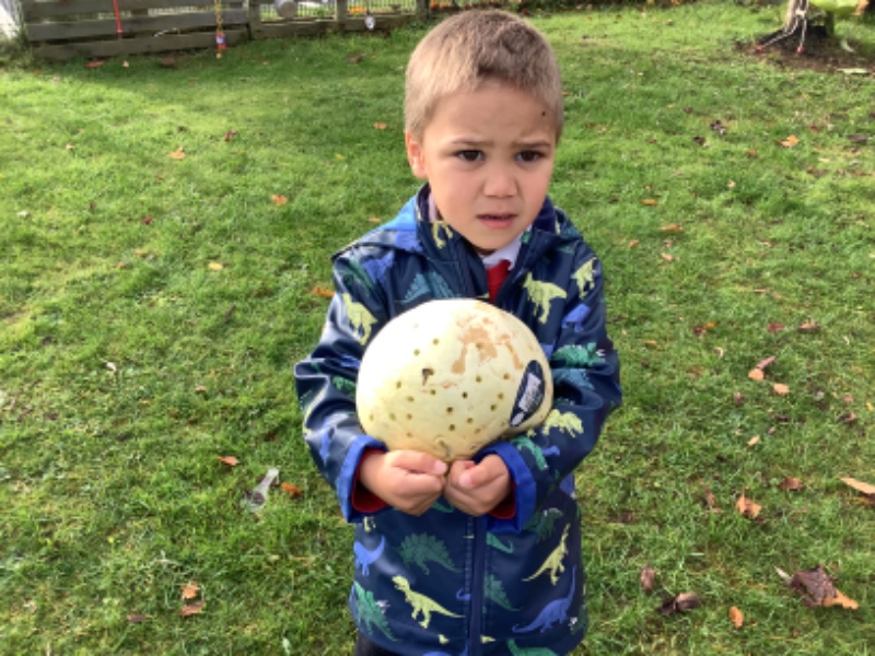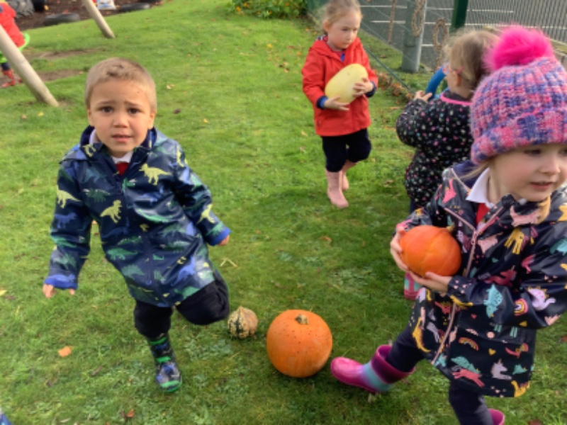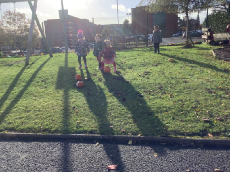 The children enjoyed lifting and moving the pumpkins around the nursery garden. We talked about the different shapes, sizes and colours. The children talked about how heavy the pumpkins were and also chased the pumpkins as they rolled down the hill! The children have developed their hand eye coordination as they hammer golf tees into the pumpkins and strengthen their hand muscles as they pull them out. Watch out for more pumpkin scooping and carving later this week!