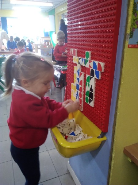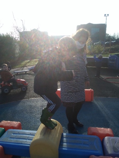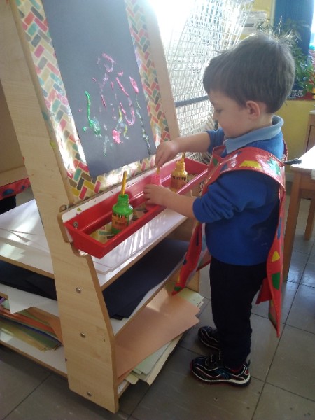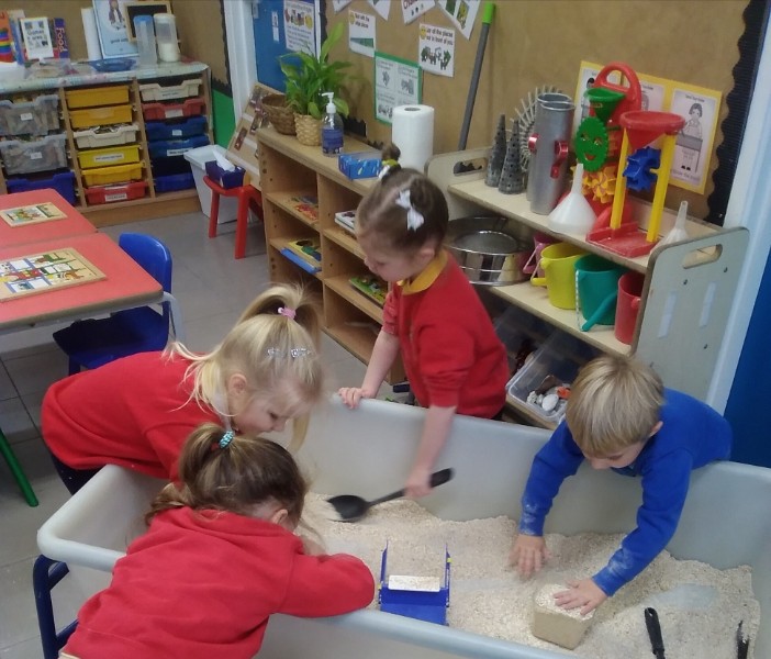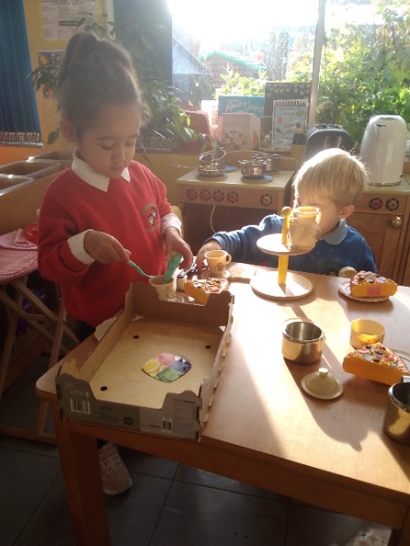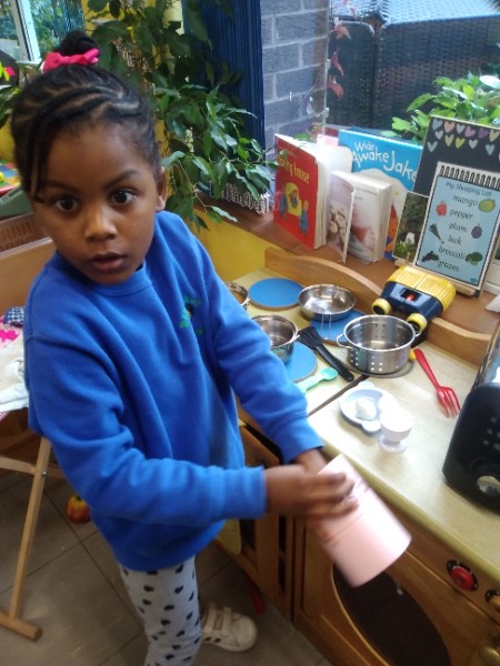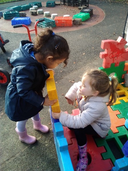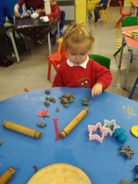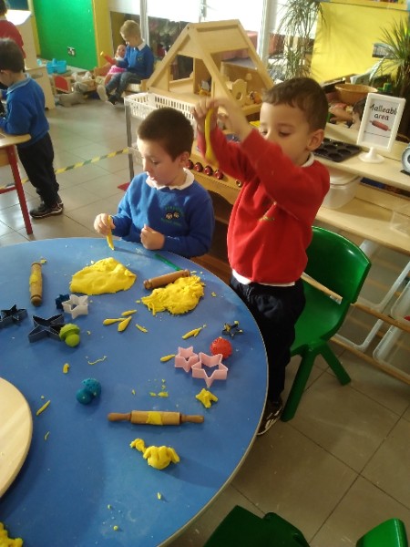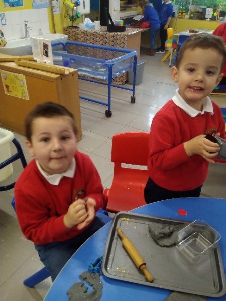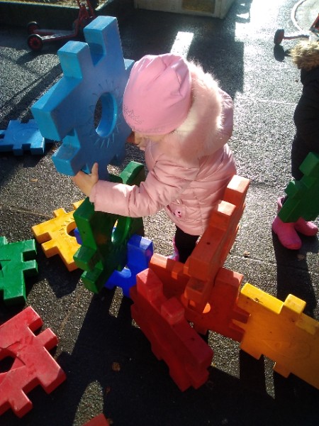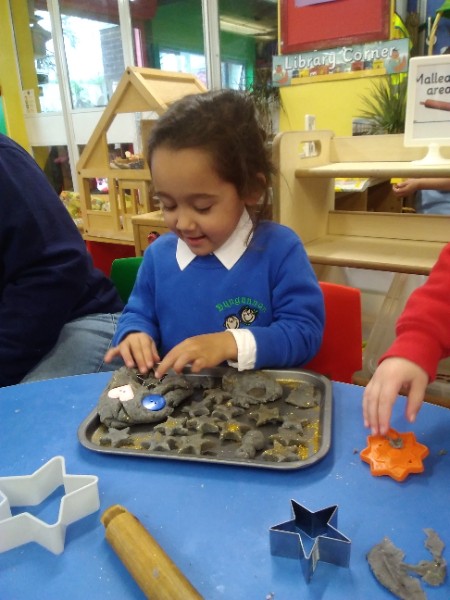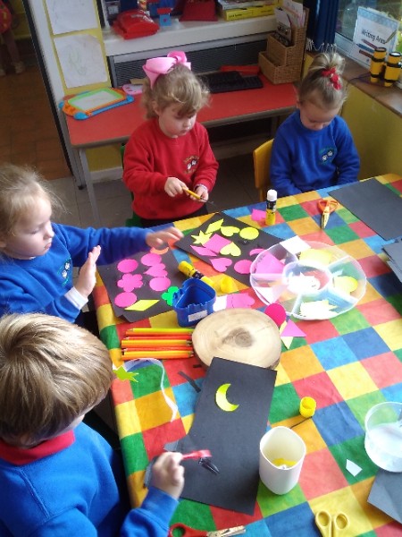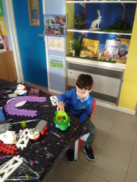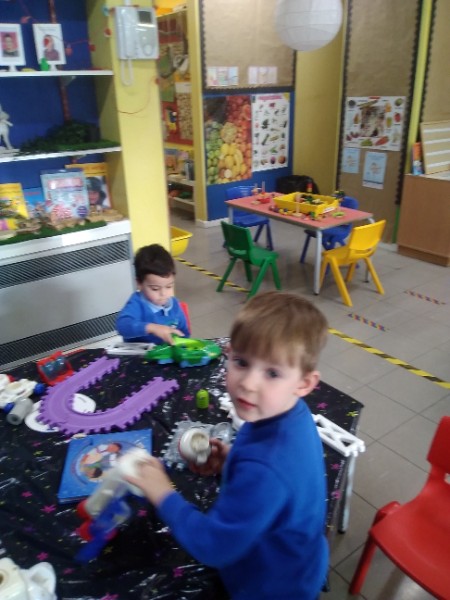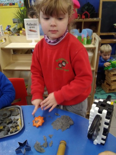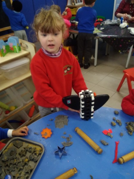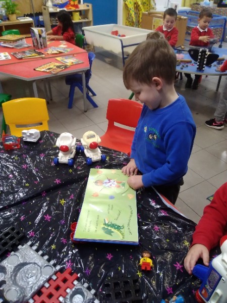 This week we have been learning skills of exploring and investigating and problem solving through the theme of Space! We have been using large plastic and wooden construction blocks to build rockets during inside and outside play. We made black sparkly playdough moon rock and yellow star playdough. We have enjoyed learning to wait our turn, share and take turns when playing with Space small world toys too. We have used our climbing frames and trikes to go on Space adventures during outside play. We have been counting down and blasting off as we sing our space songs as well.