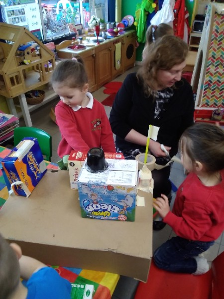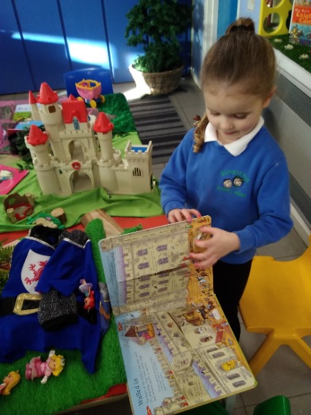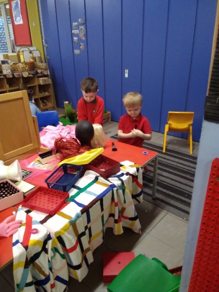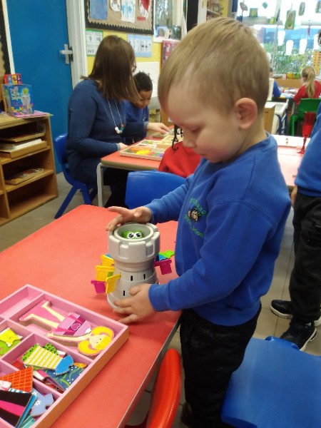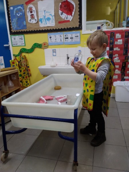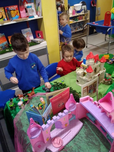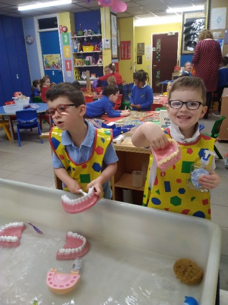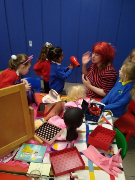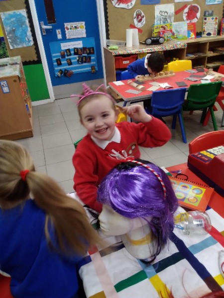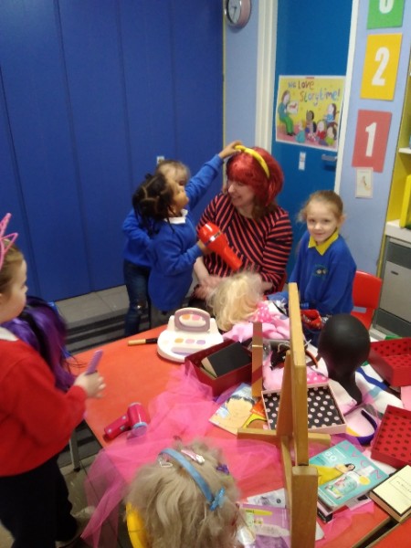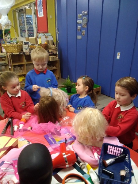 During the month of February we are exploring the theme of 'Ourselves'. We are reading fairy stories and learning Nursery Rhymes. We have made our own castle for imaginative play. We are learning how to look after ourselves. We are enjoying brushing the giant teeth. The Hairdressers and Beauty Parlour is really busy too. Mrs. Hudson is getting a makeover!!