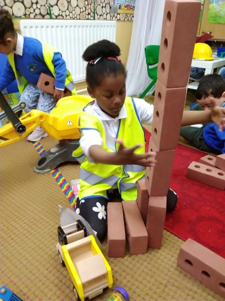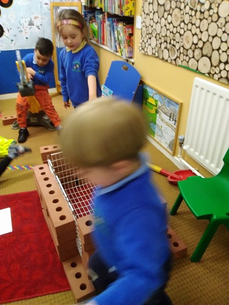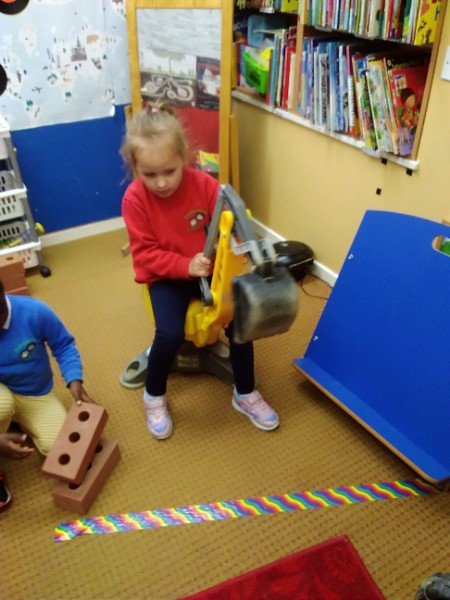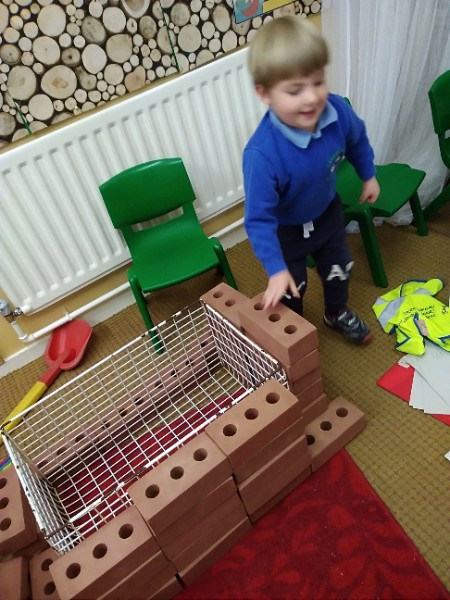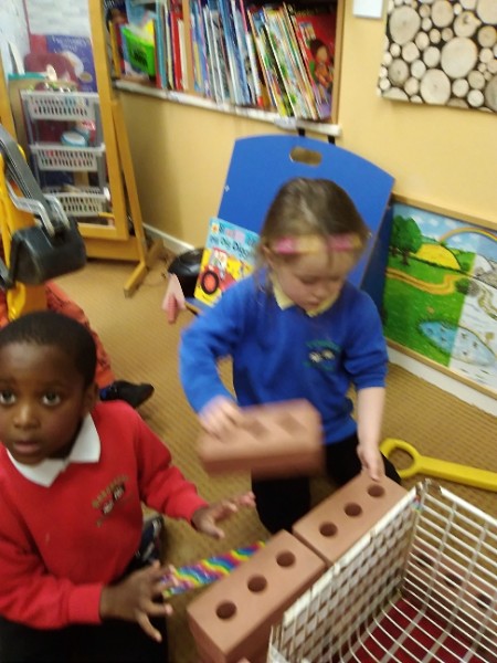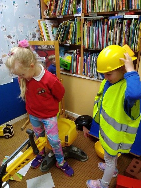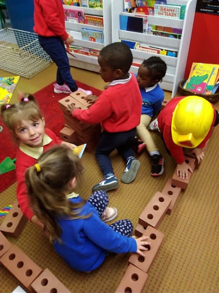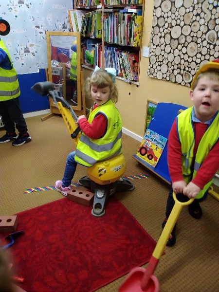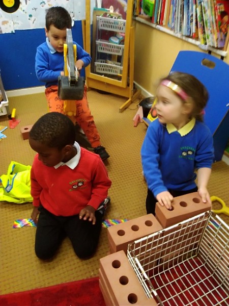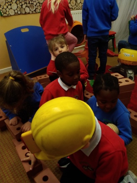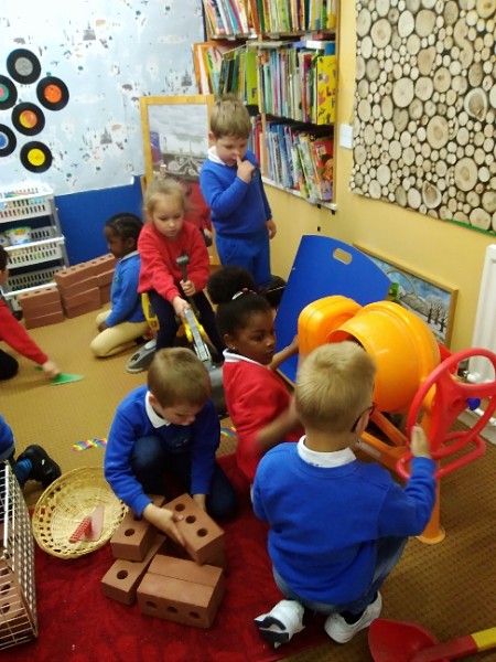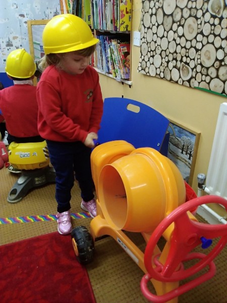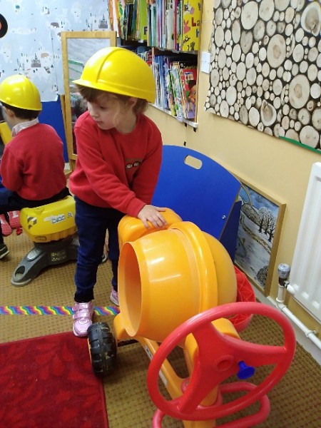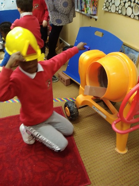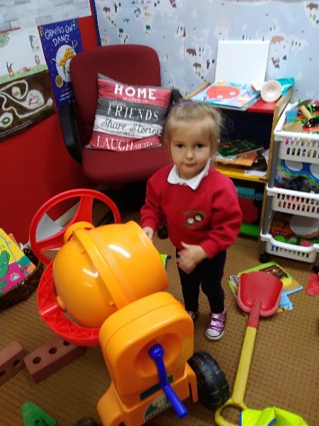 This week the children in Mrs. Hudson's Class have been thinking about how construction workers help us in out community. The children have been using large bricks, cement diggers and JCBs in out role play area as they pretend to be construction workers and develop their gross motor skills. At the small world area the children have used small figure and vehicles to create and play together, sharing and taking turns and communicating with one another.