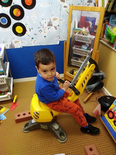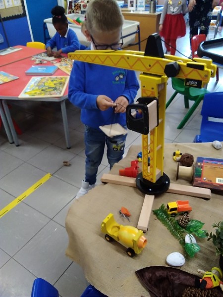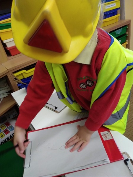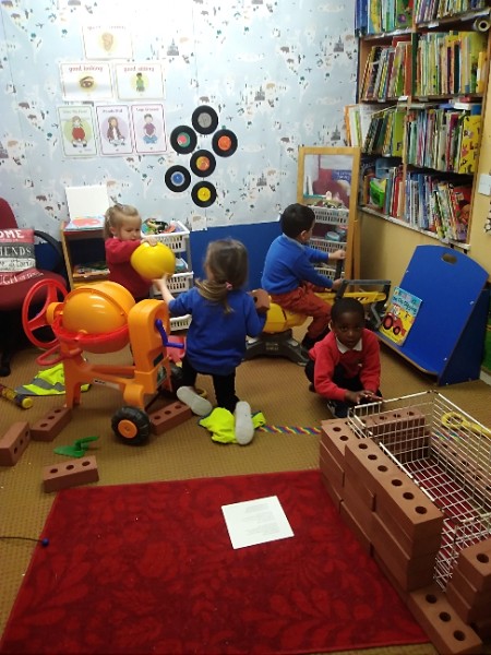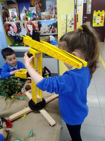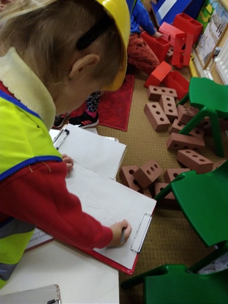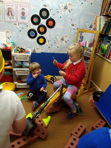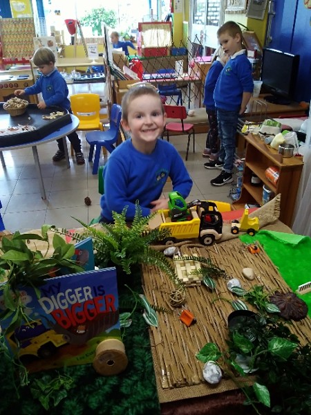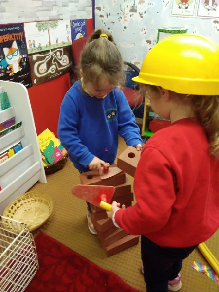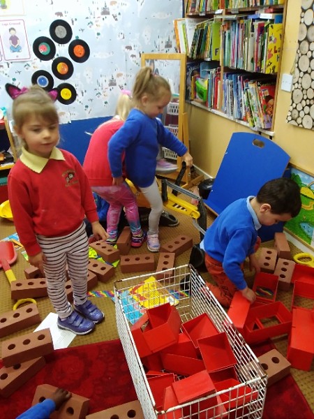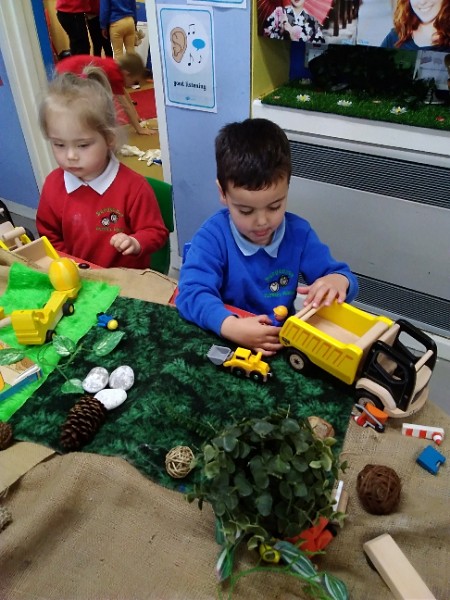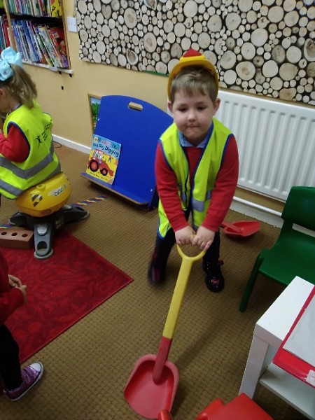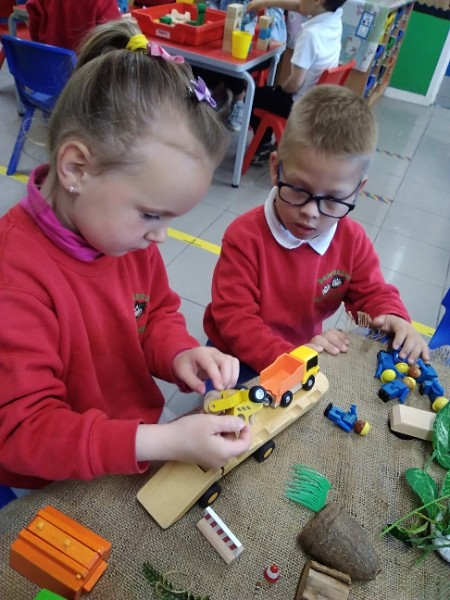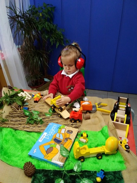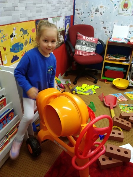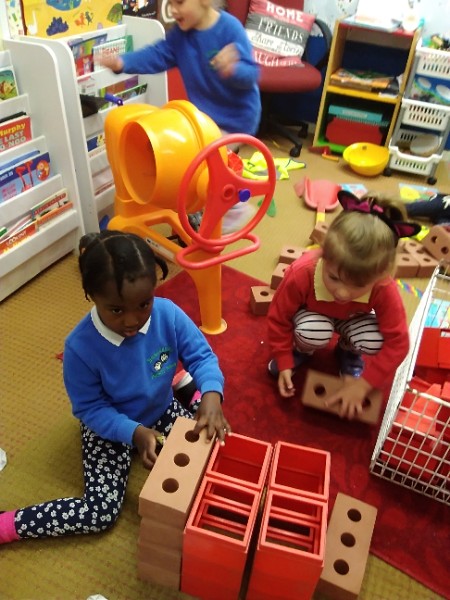 This week the children in Mrs. Hudson's Class have been thinking about how construction workers help us in out community. The children have been using large bricks, cement diggers and JCBs in out role play area as they pretend to be construction workers and develop their gross motor skills. At the small world area the children have used small figure and vehicles to create and play together, sharing and taking turns and communicating with one another.
