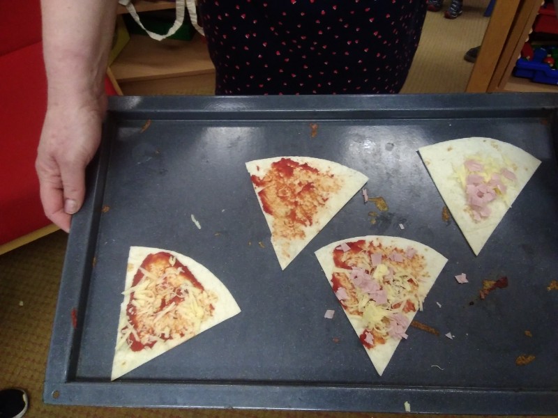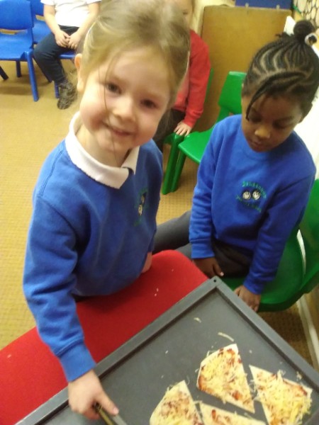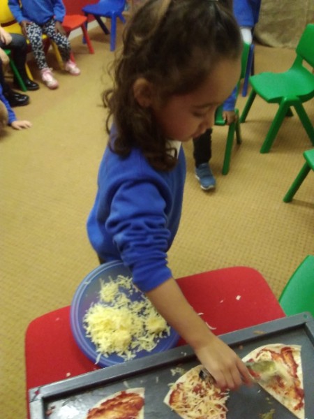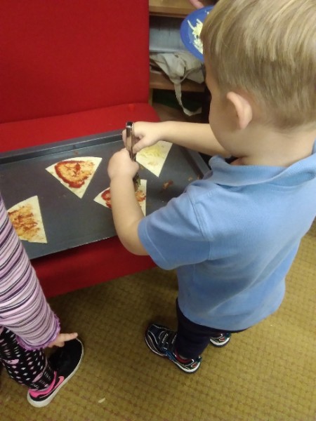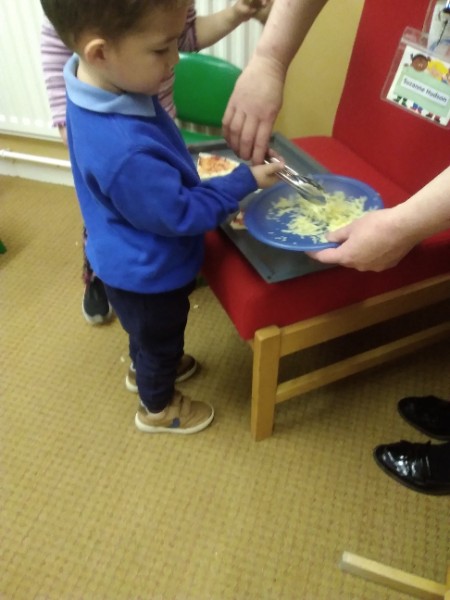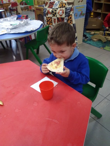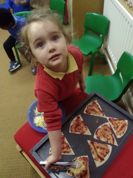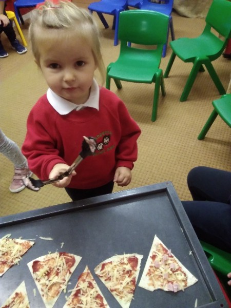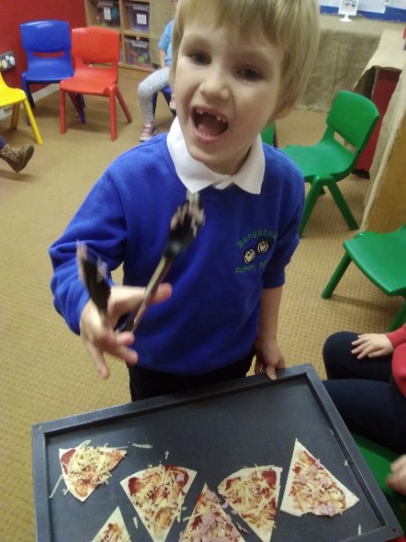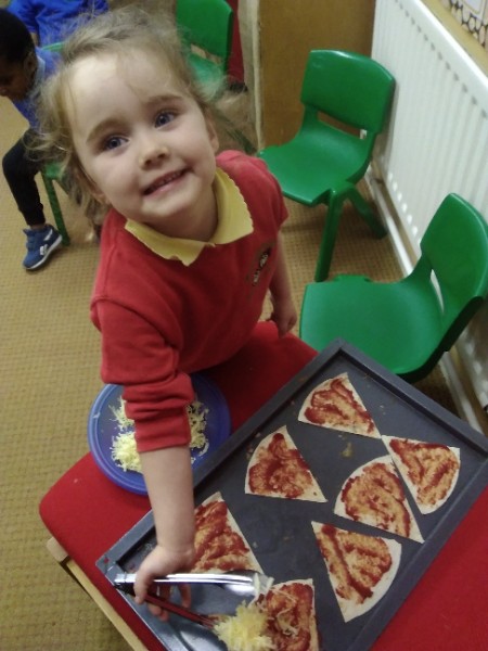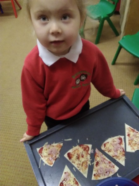 The Nursery children in Mrs. Hudson's Class have been playing in the home corner this week with lots of different pretend and real foods. They've like the pizza best of all. So the children have made their own real pizza for snack. We squeezed out some tomato sauce and spread it with a spoon on to a triangle of wrap. Then we added our toppings of cheese and ham. We pretended we were at the restaurant! Thank you to Allison for cooking our pizza in her oven.