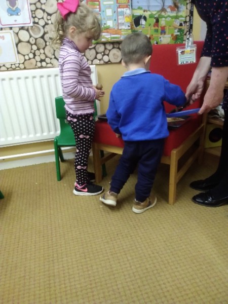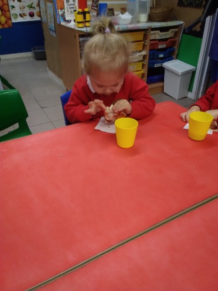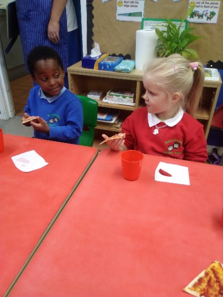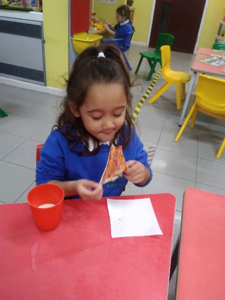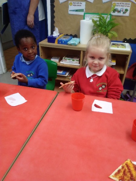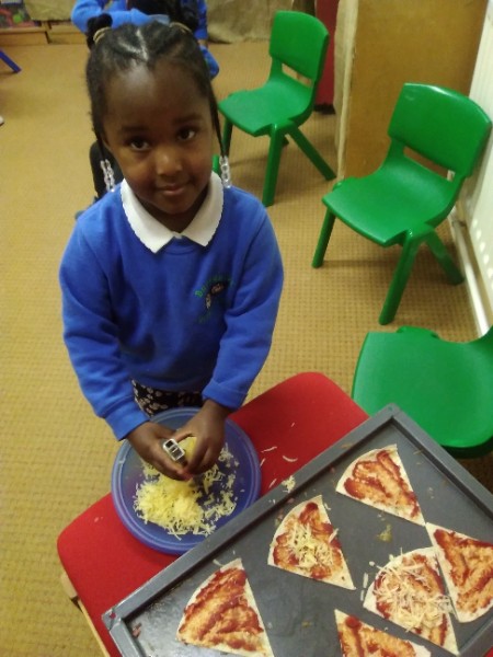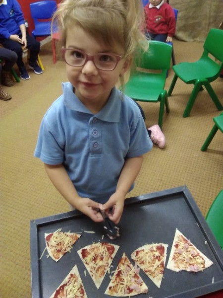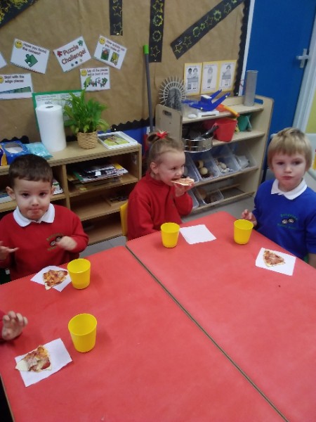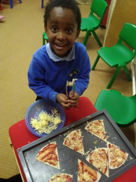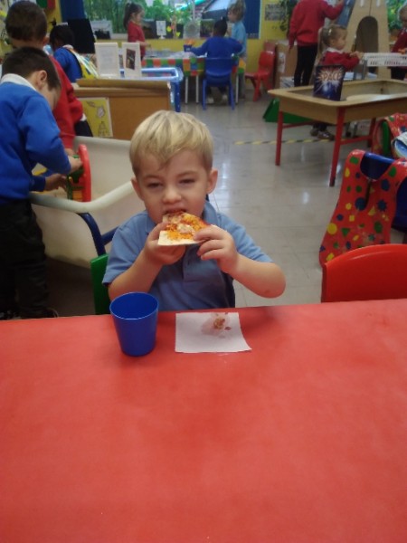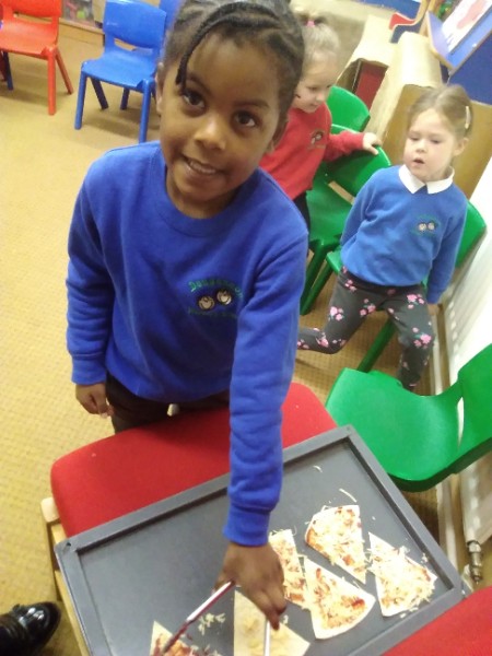 The Nursery children in Mrs. Hudson's Class have been playing in the home corner this week with lots of different pretend and real foods. They've like the pizza best of all. So the children have made their own real pizza for snack. We squeezed out some tomato sauce and spread it with a spoon on to a triangle of wrap. Then we added our toppings of cheese and ham. We pretended we were at the restaurant! Thank you to Allison for cooking our pizza in her oven.