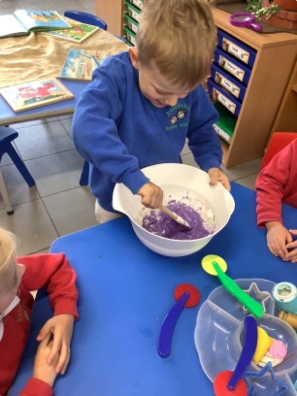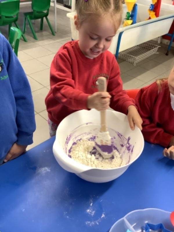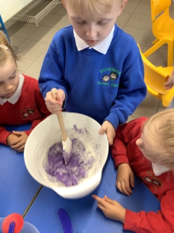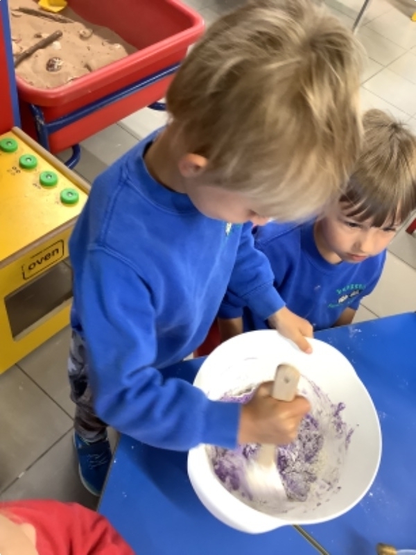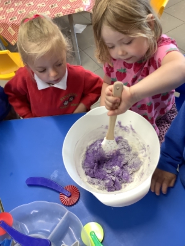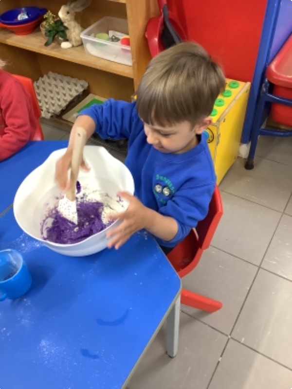Making purple dough for our ice cream parlour. We measure out all our ingredients and use our muscles to mix it altogether 💪ðŸ»