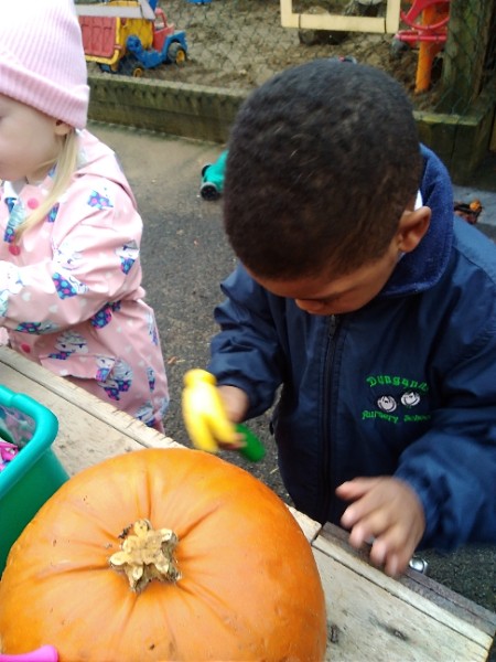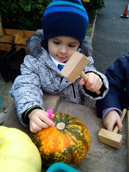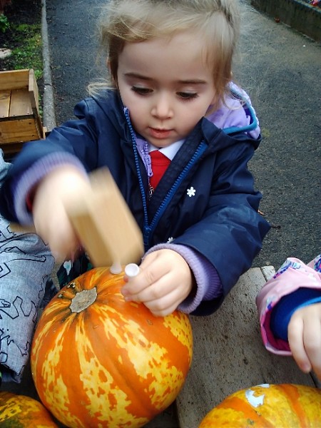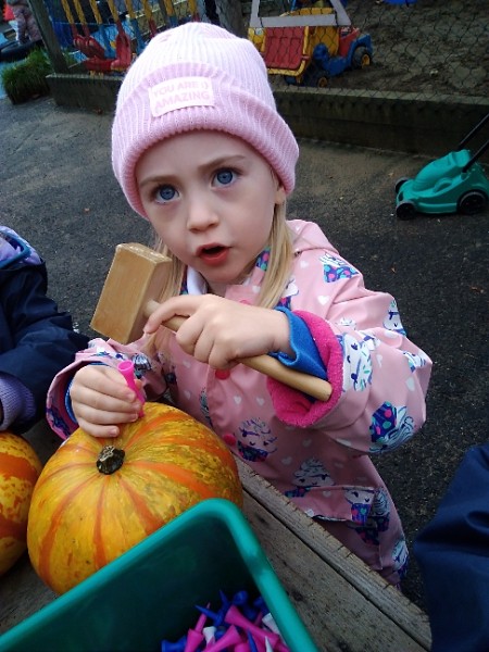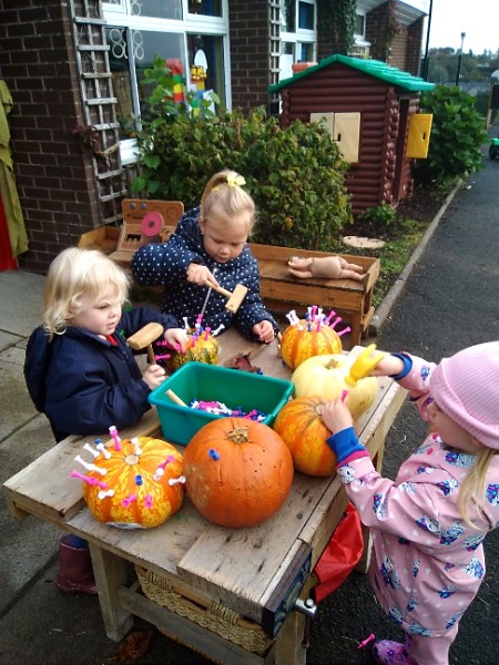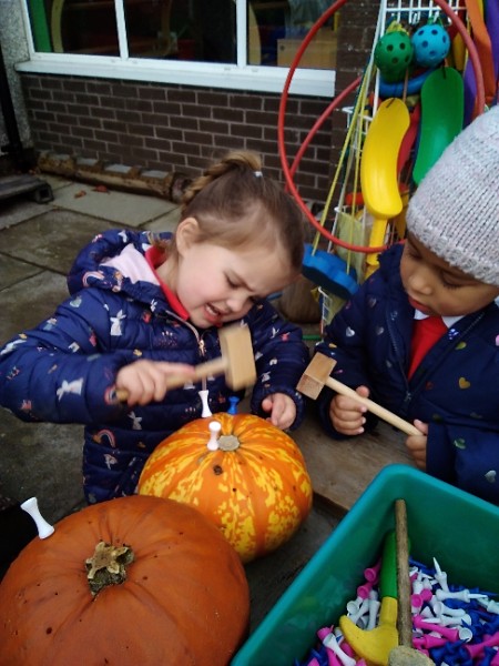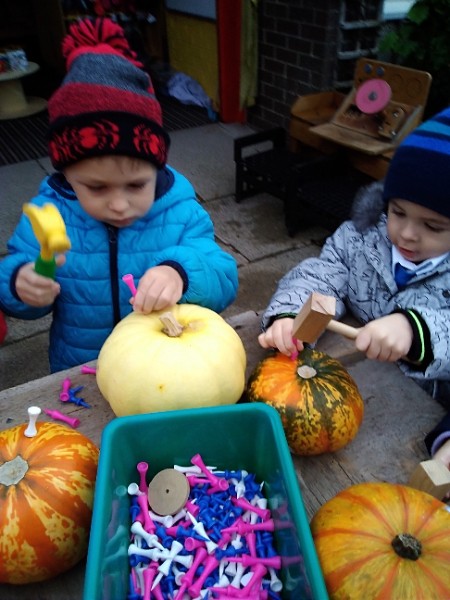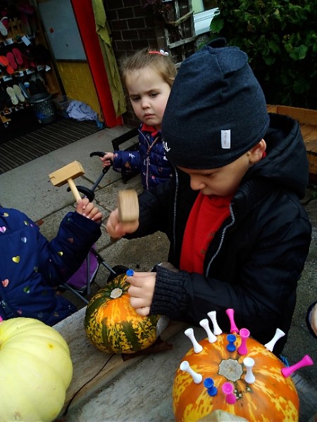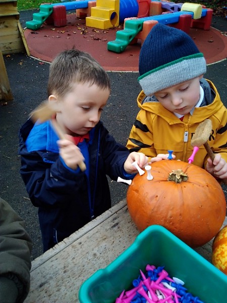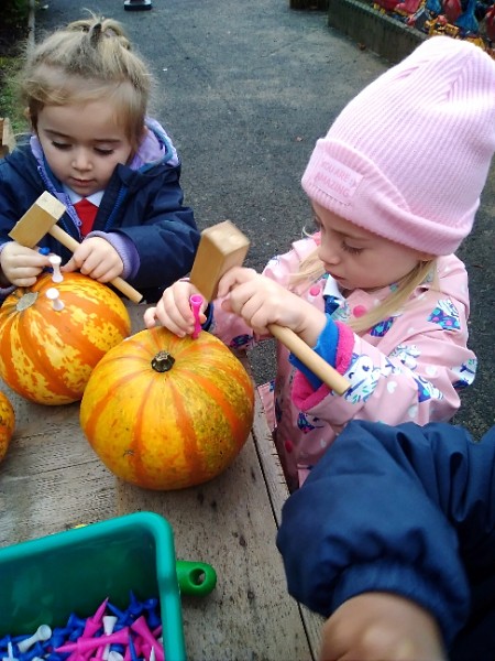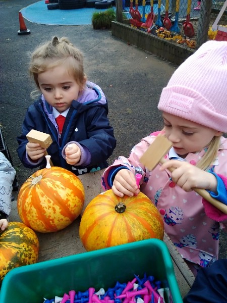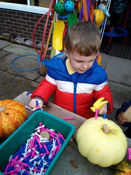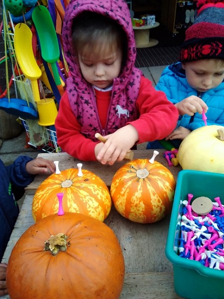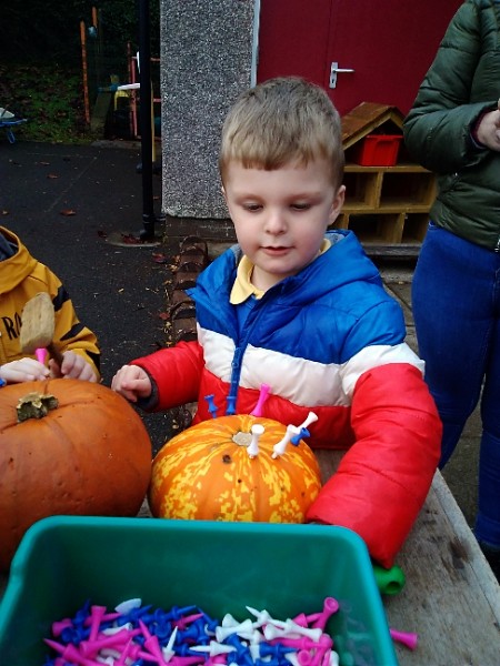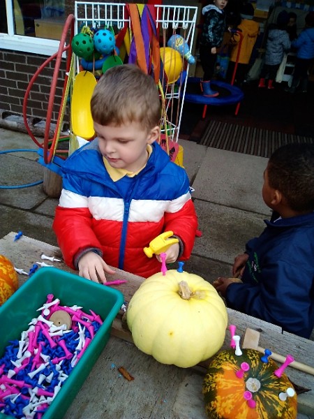 Mrs. Hudson's Class used golf tees and Halloween pumpkins to develop and control their fingers and hands.