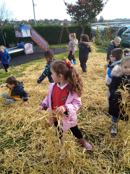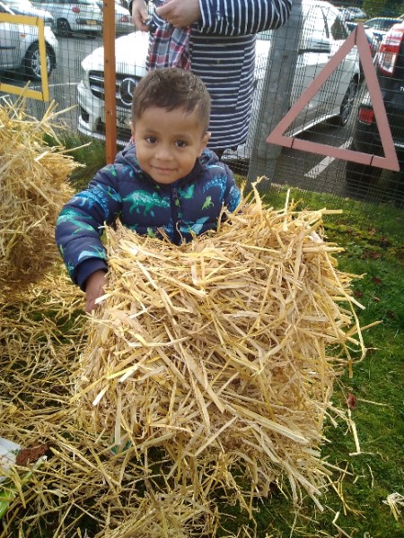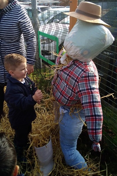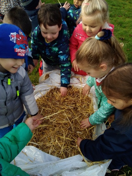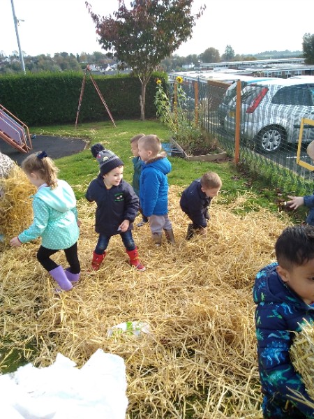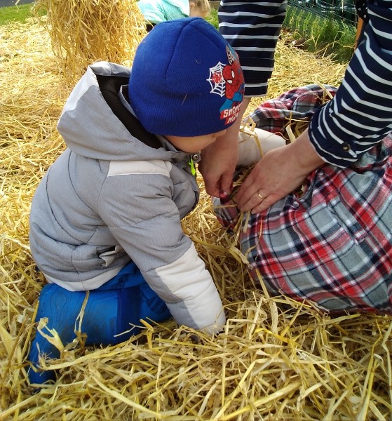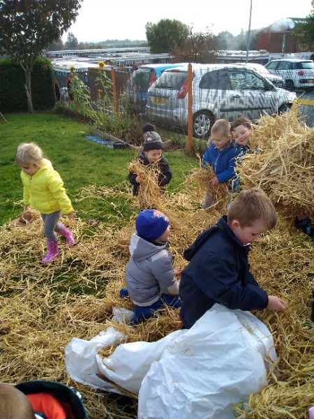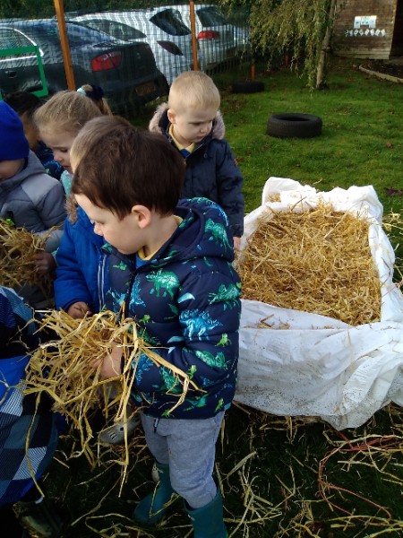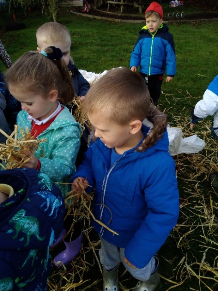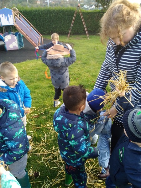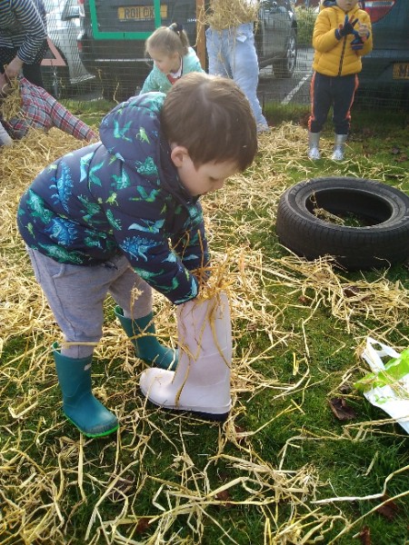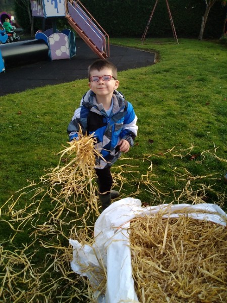 Thank you to Miss Park and her Dad for sending in the bale of straw. It was all wrapped up. We didn't know what it was! The children used their muscles to scoop up the straw and stuff it into the scarecrow's clothes.