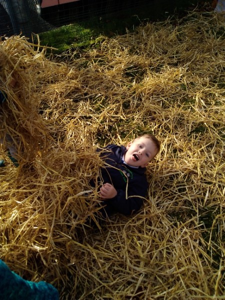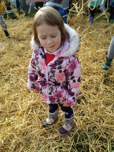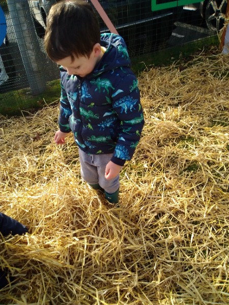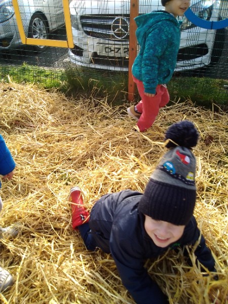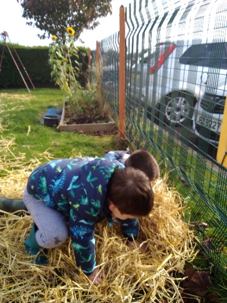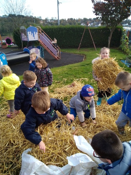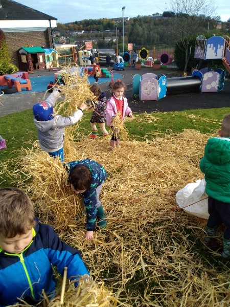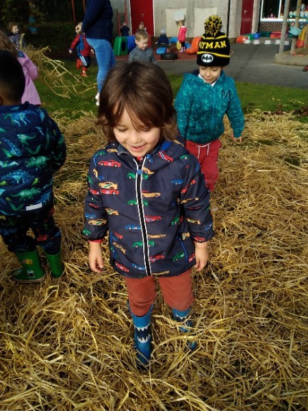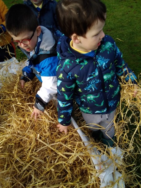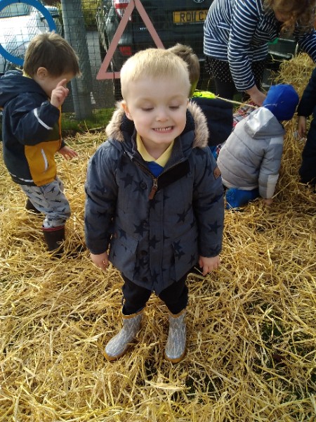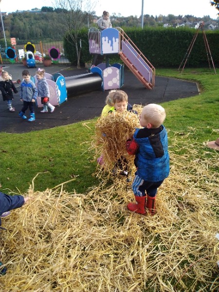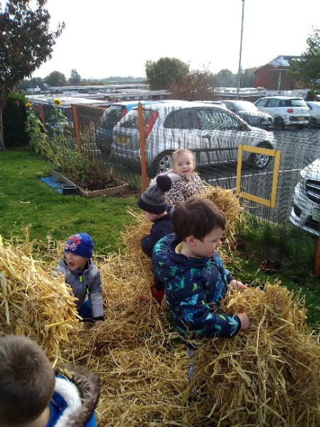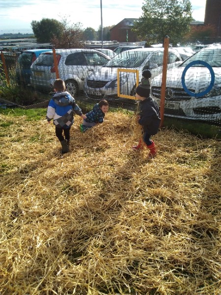 Thank you to Miss Park and her Dad for sending in the bale of straw. It was all wrapped up. We didn't know what it was! The children used their muscles to scoop up the straw and stuff it into the scarecrow's clothes.