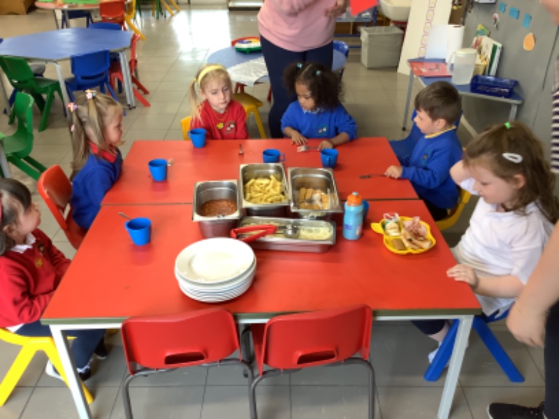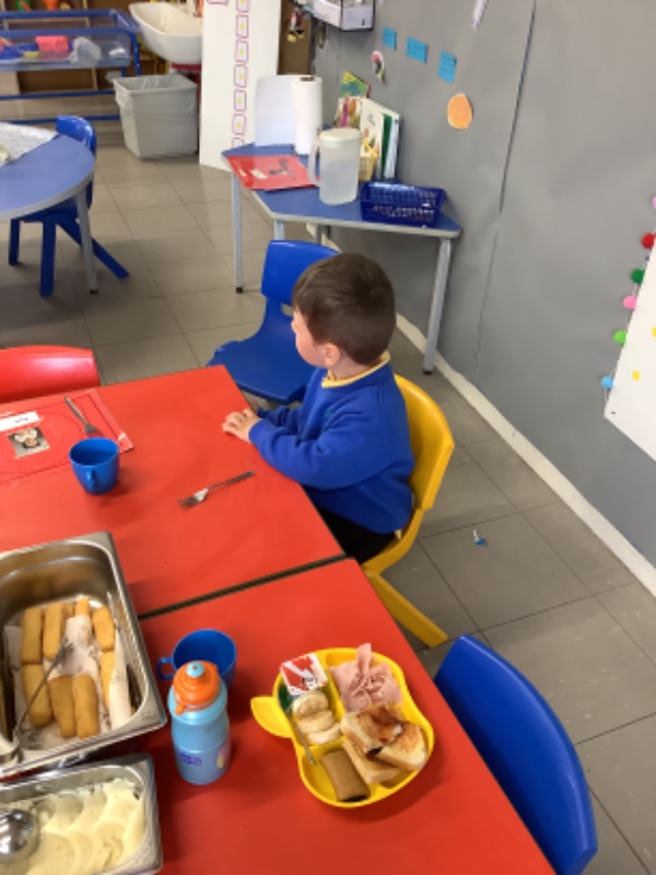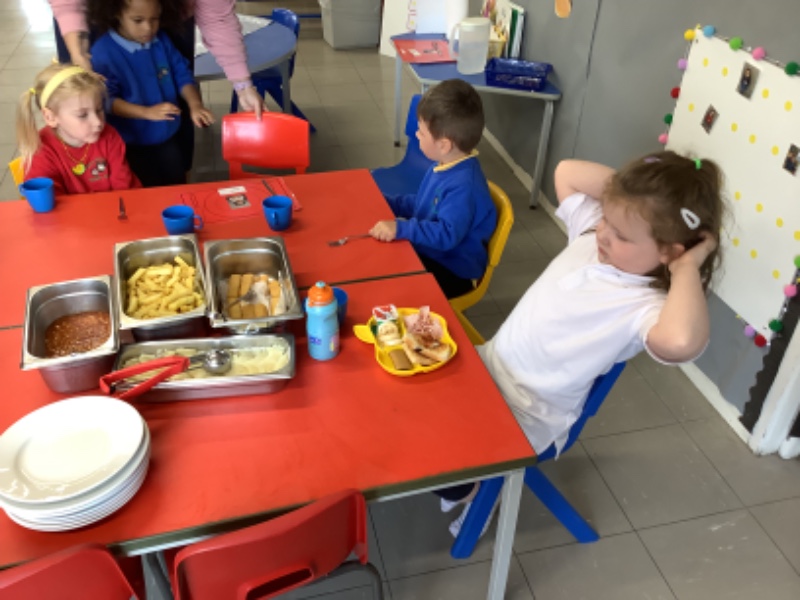 Today group 1 enjoyed their first taste of school dinner. A great way to develop not only our tastebuds with new foods but also our fine motor skills/ hand-eye coordination when using our cutlery.