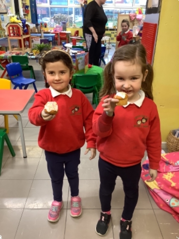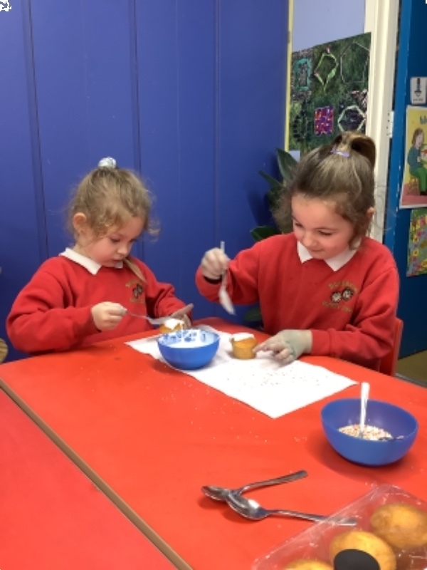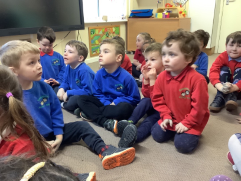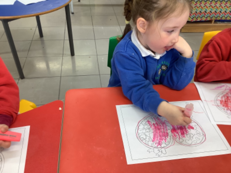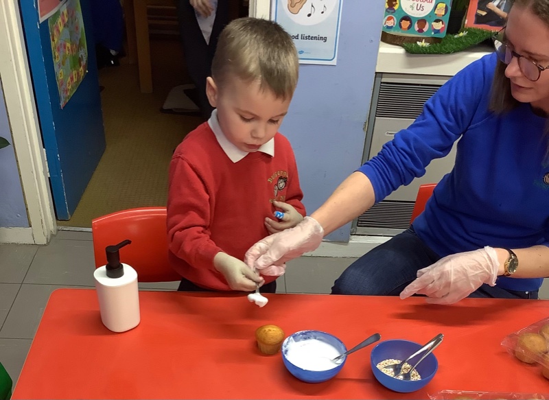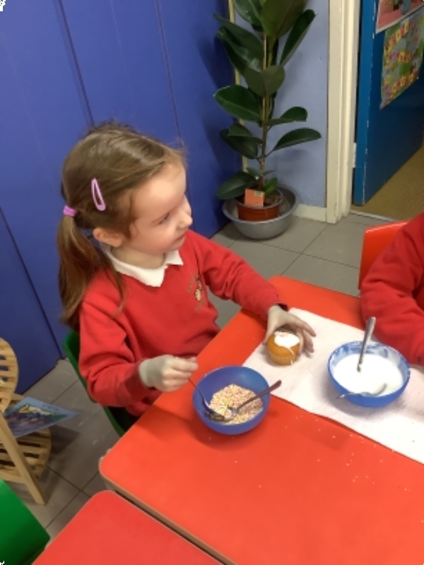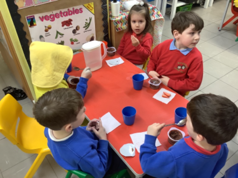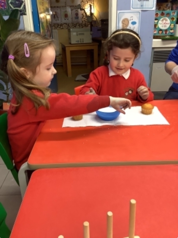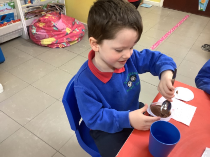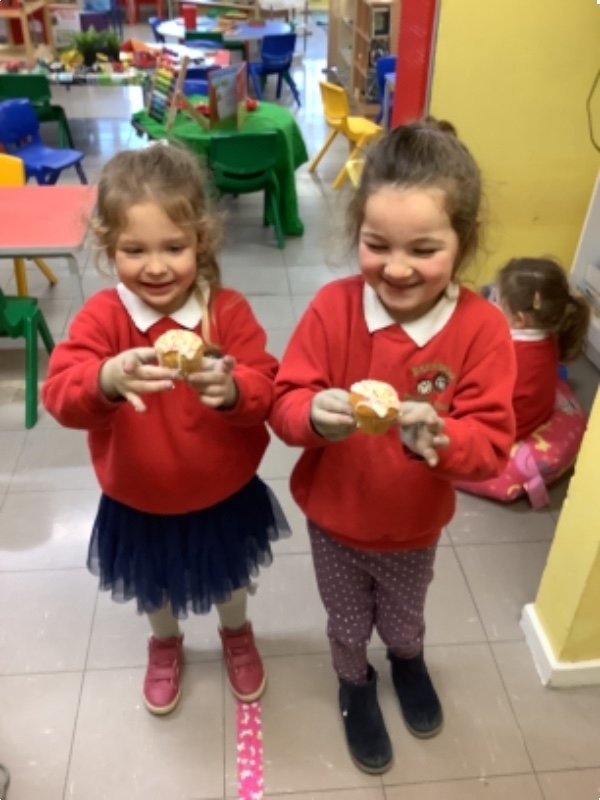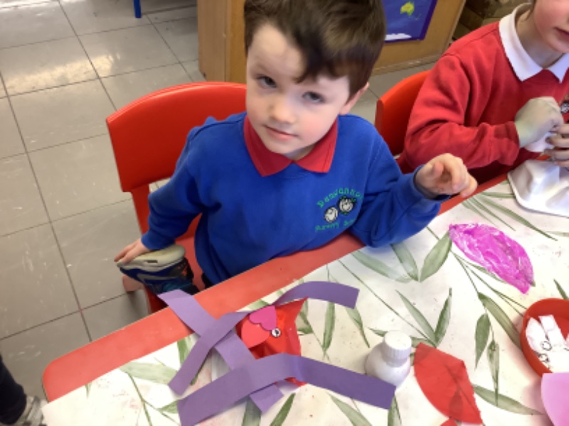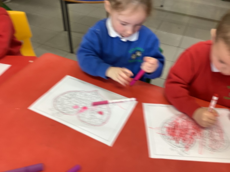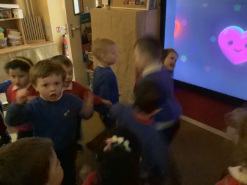 Lots of fun on St. Valentine's Day. We had chocolate mousse and strawberries for snack. We read the story of Love Monster and made some puppets of the Love Monster. We made St. Valentine's cupcakes. Rev. Topley from Drumglass came to tell us all about being loved by our family. And to finish the day we had a St. Valentines Day disco!