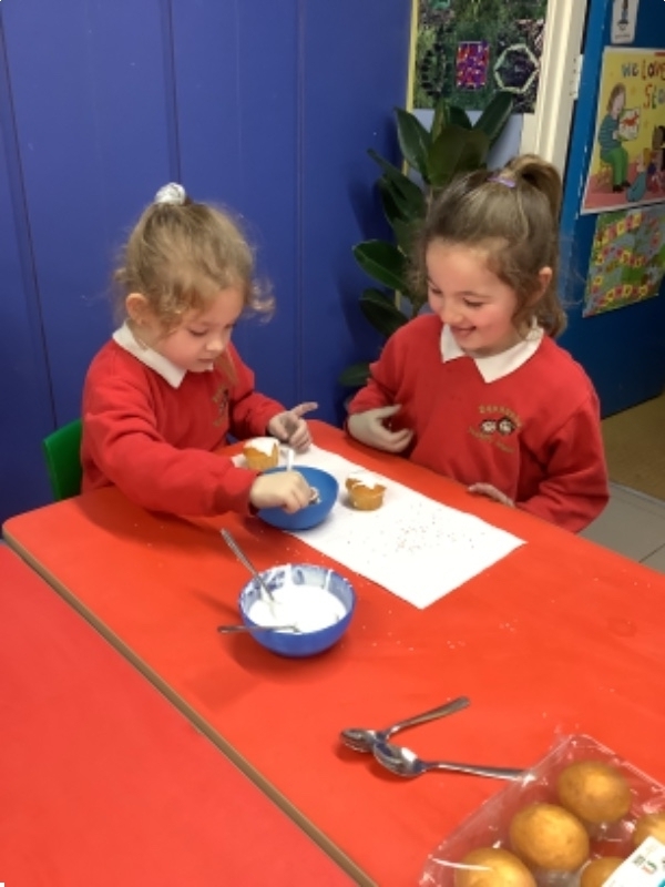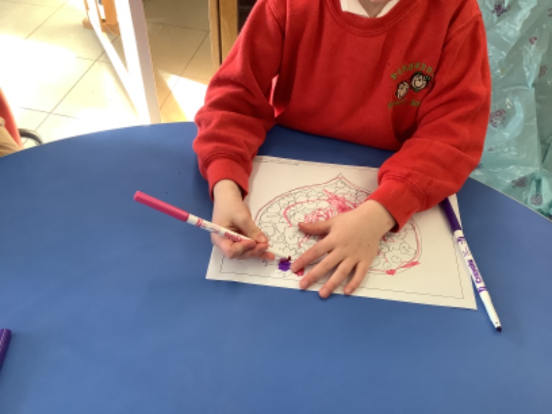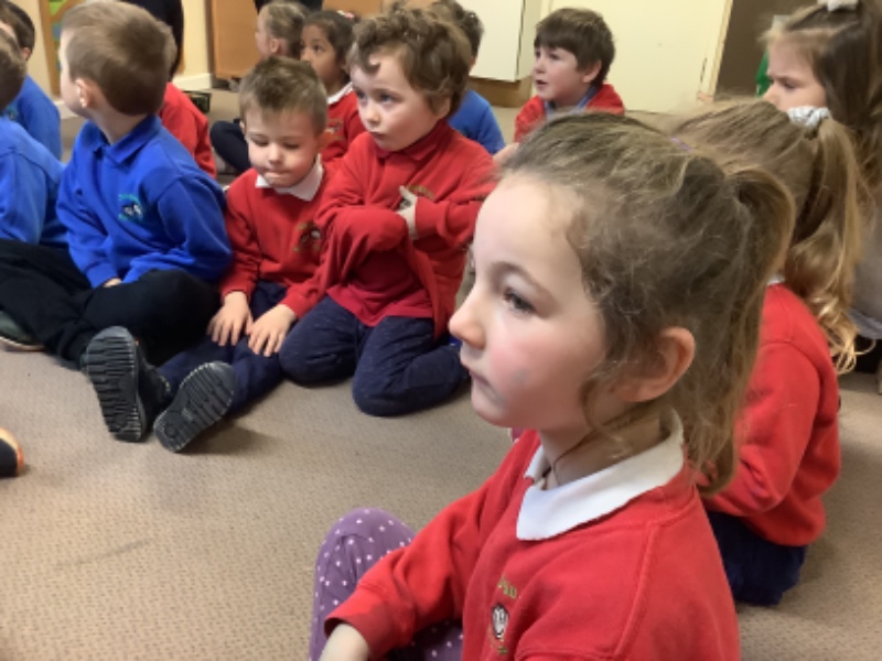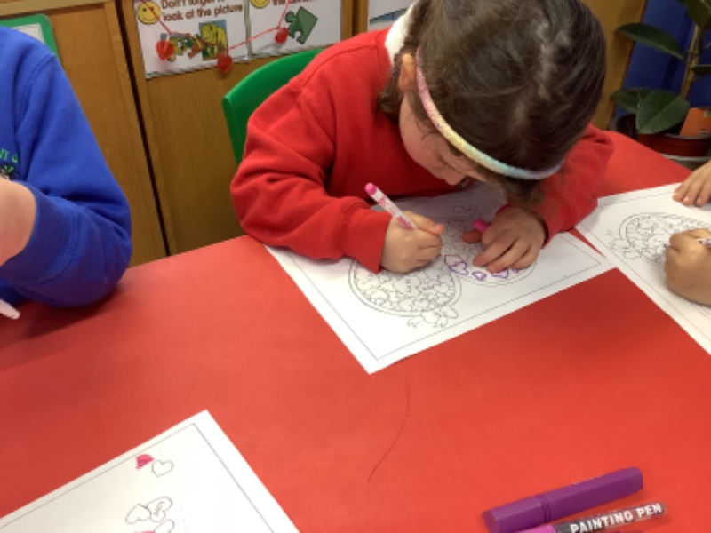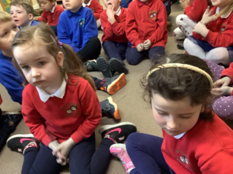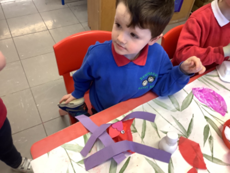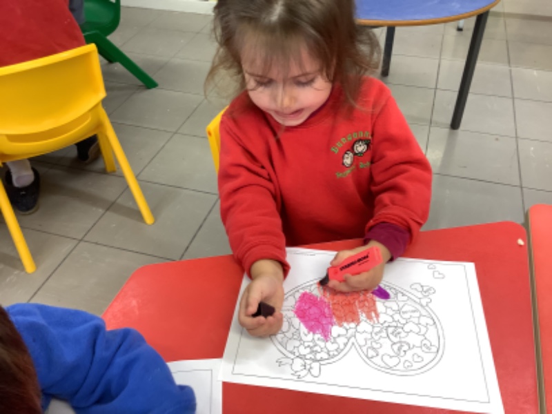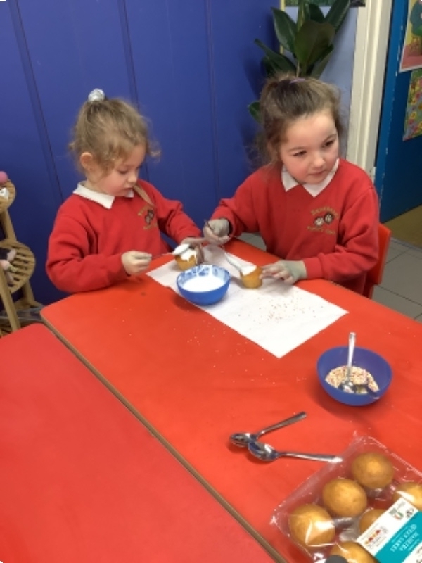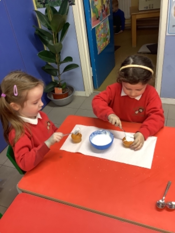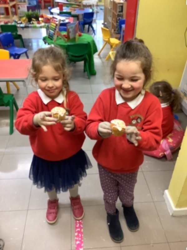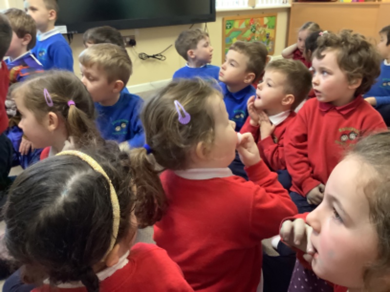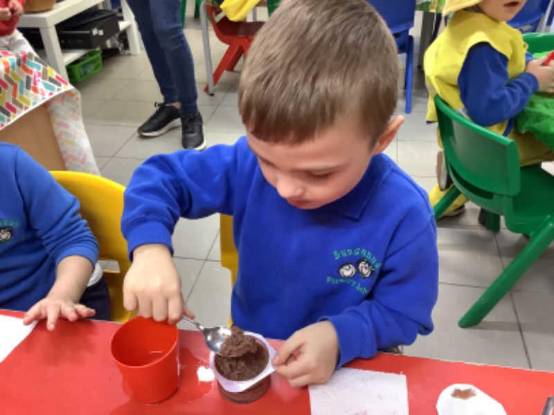 Lots of fun on St. Valentine's Day. We had chocolate mousse and strawberries for snack. We read the story of Love Monster and made some puppets of the Love Monster. We made St. Valentine's cupcakes. Rev. Topley from Drumglass came to tell us all about being loved by our family. And to finish the day we had a St. Valentines Day disco!