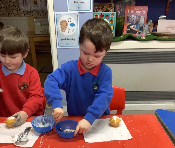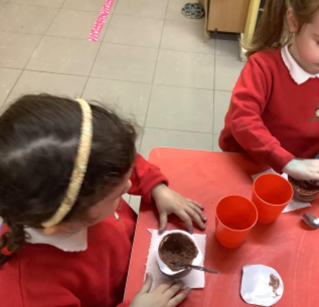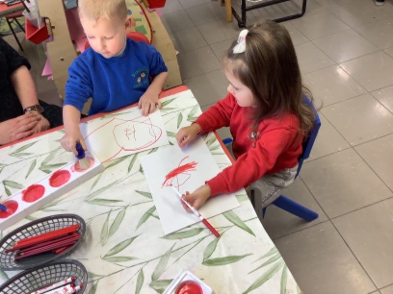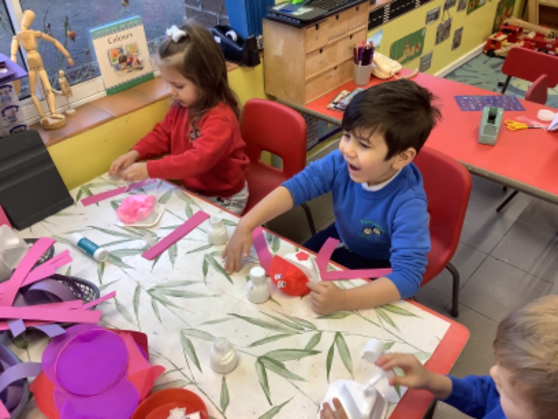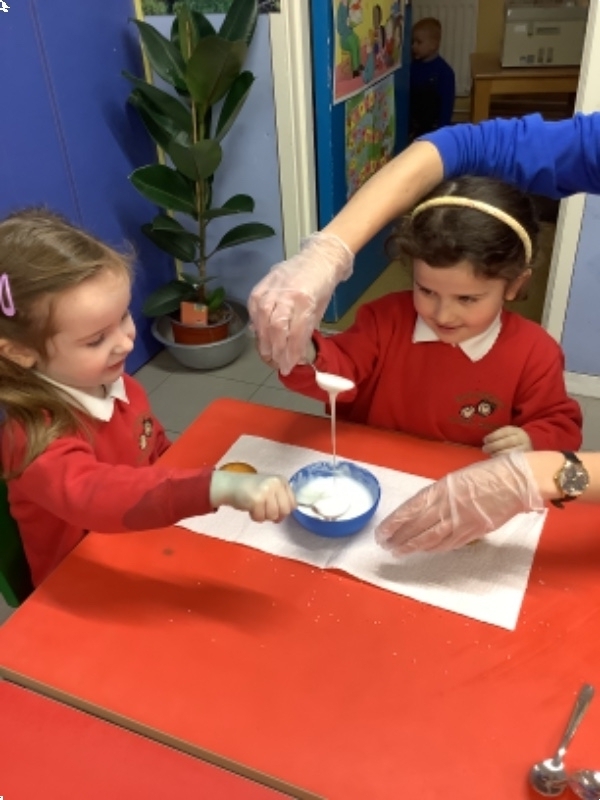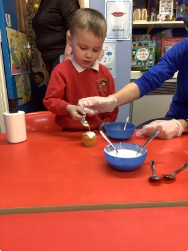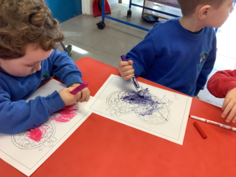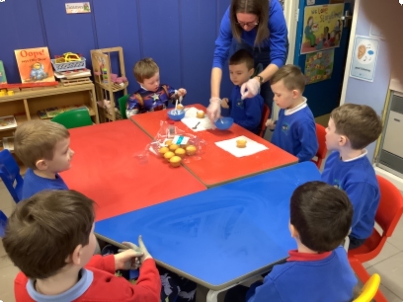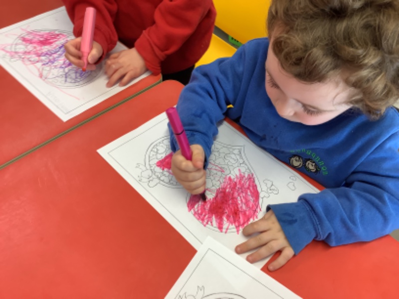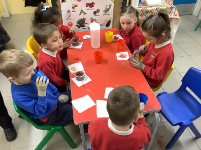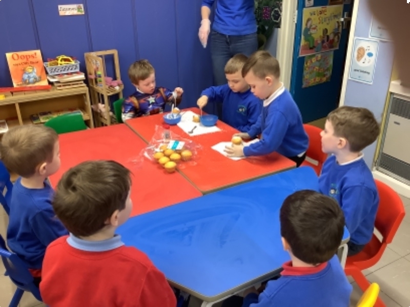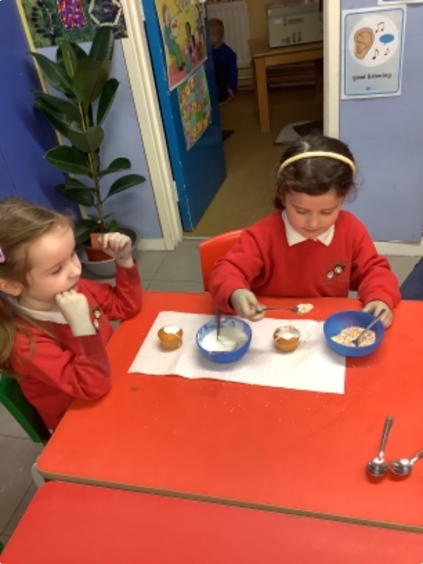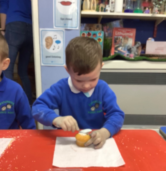 Lots of fun on St. Valentine's Day. We had chocolate mousse and strawberries for snack. We read the story of Love Monster and made some puppets of the Love Monster. We made St. Valentine's cupcakes. Rev. Topley from Drumglass came to tell us all about being loved by our family. And to finish the day we had a St. Valentines Day disco!