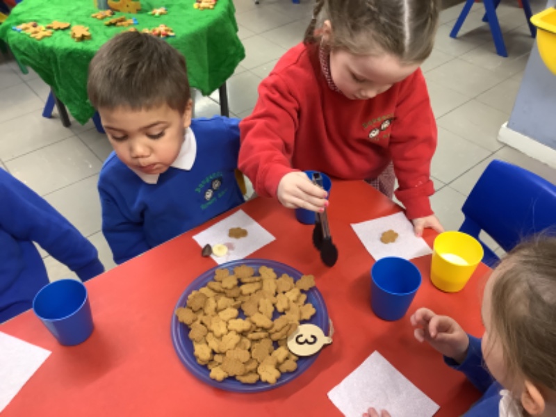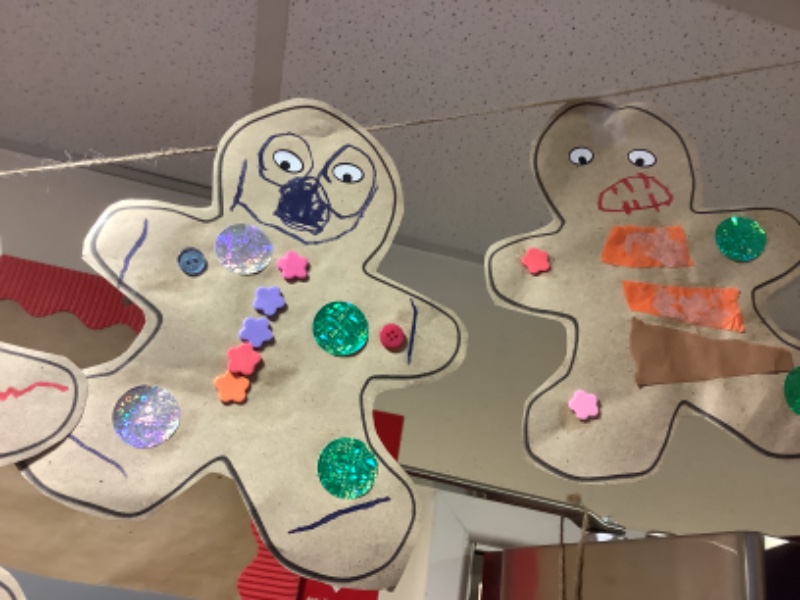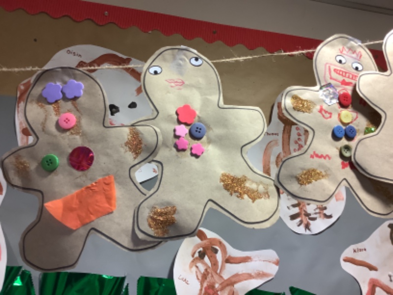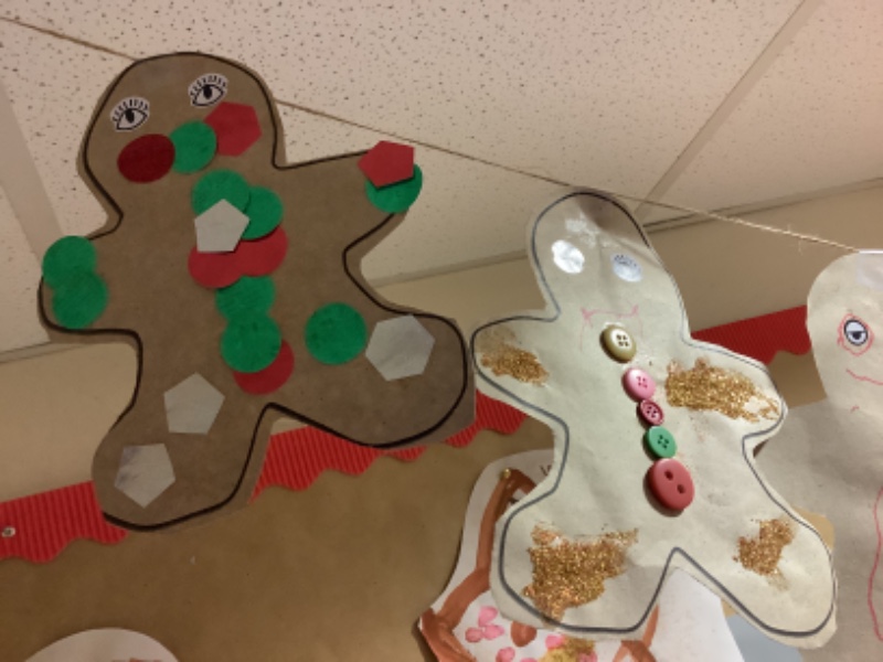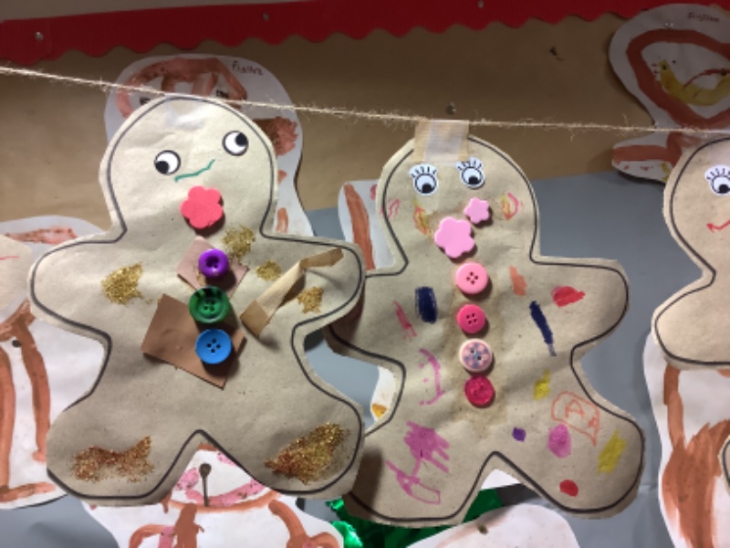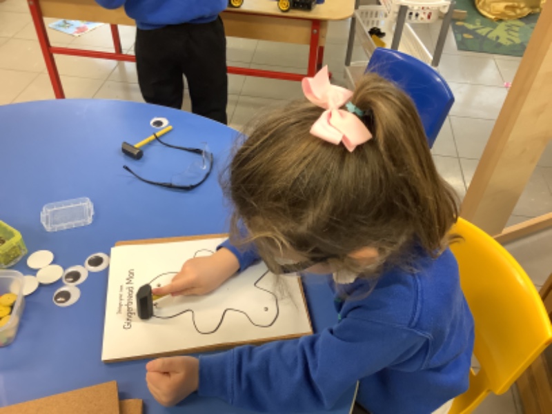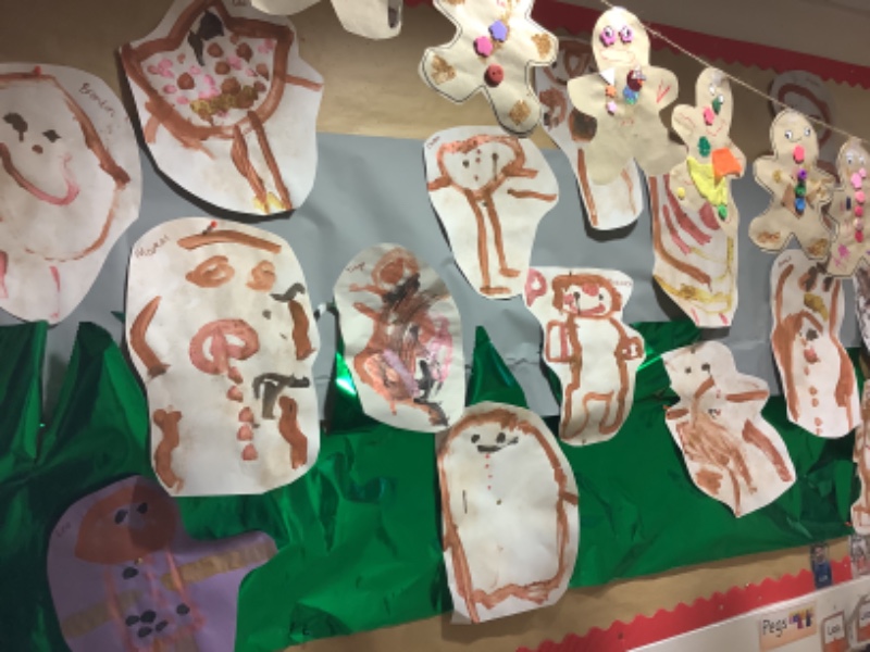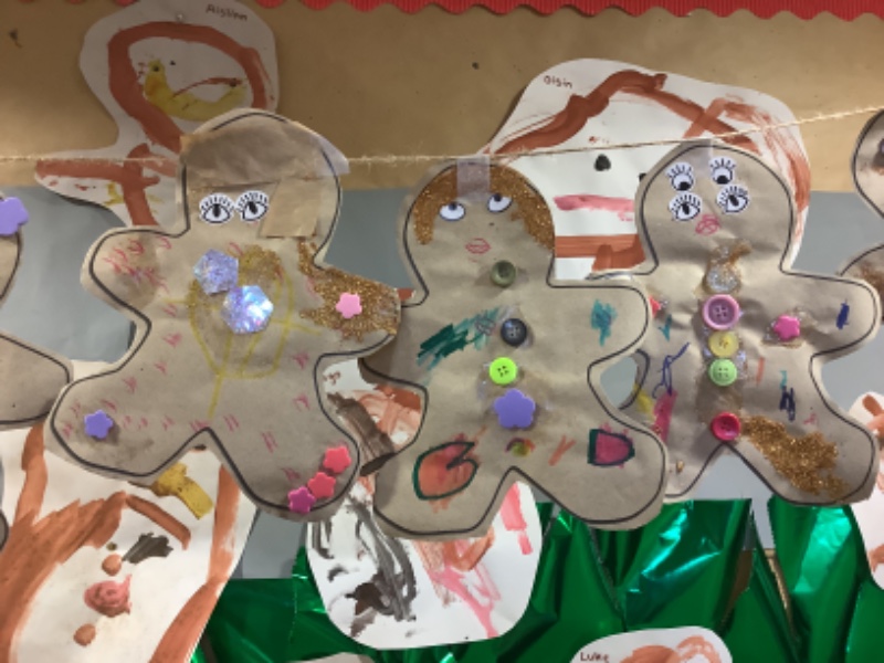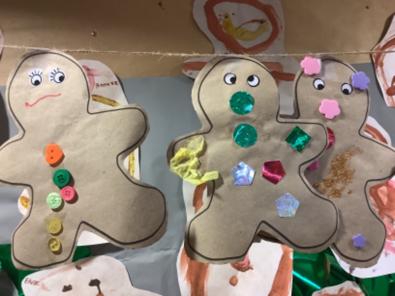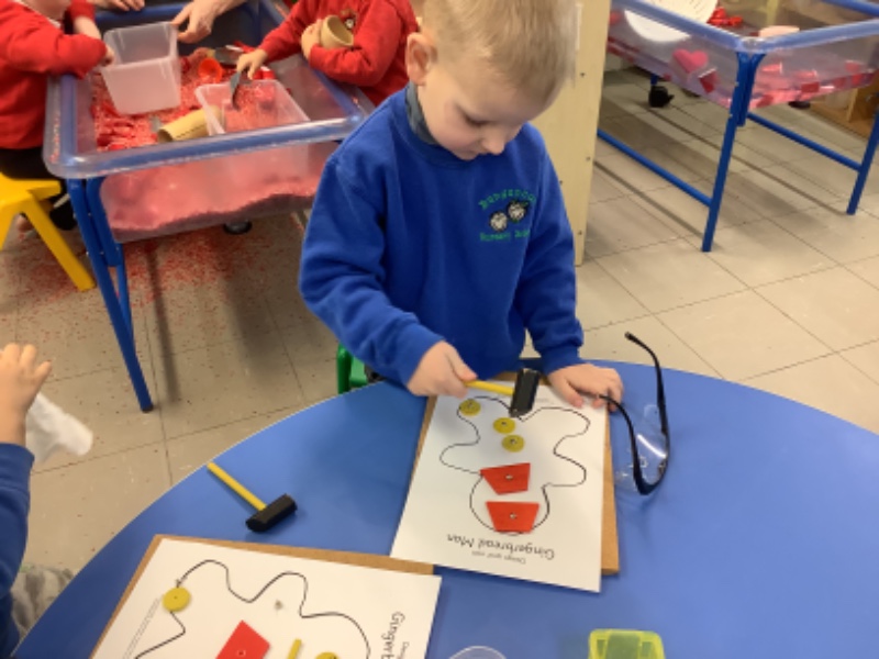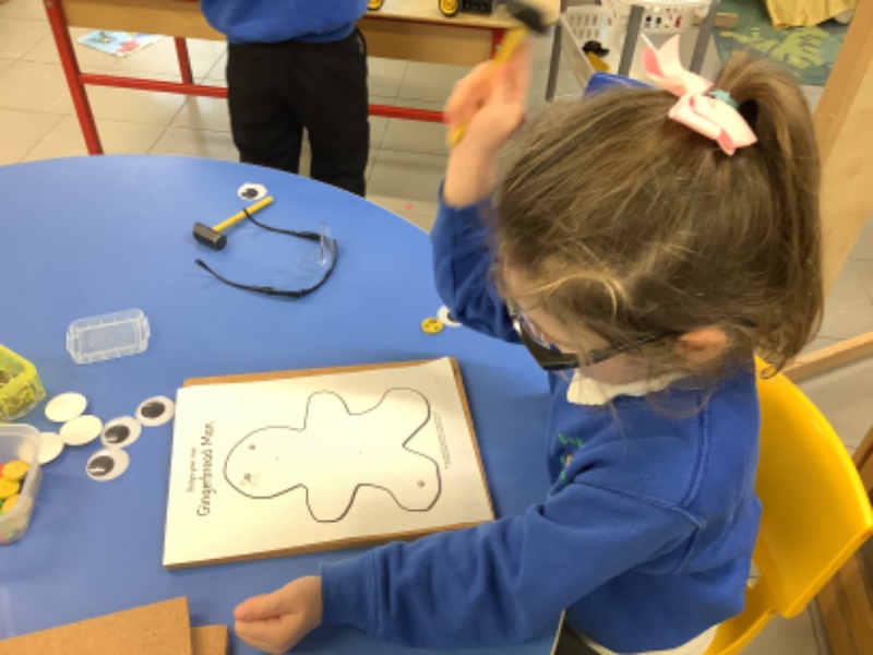 We enjoyed a snack of gingerbread men biscuits. We used hammers and nails to decorate gingerbread men shapes. We painted gingerbread men with cinnamon and ginger scented paint. We decorated gingerbread men shapes.