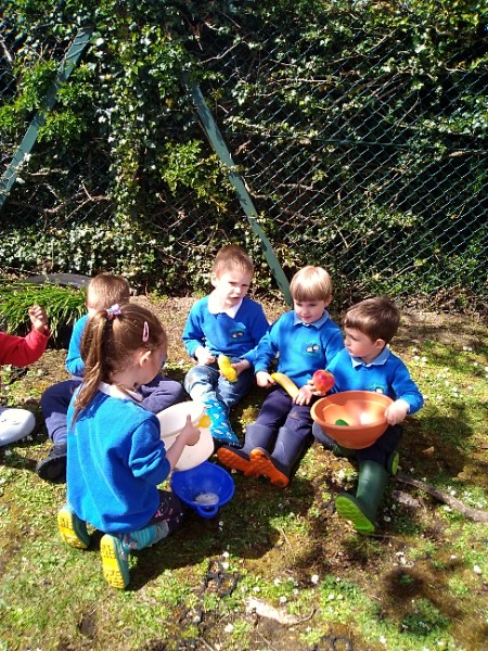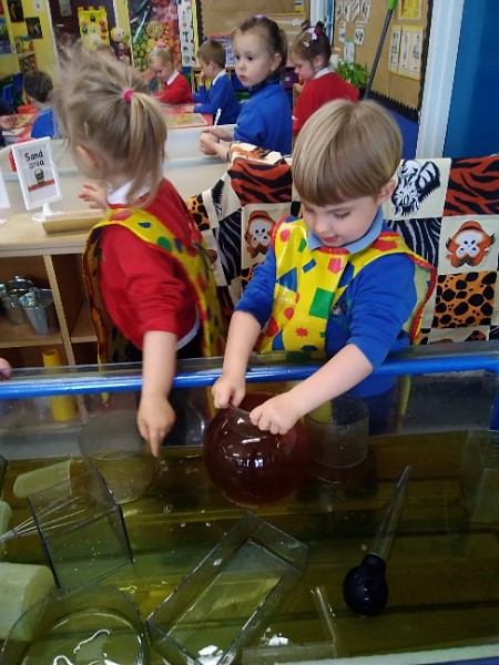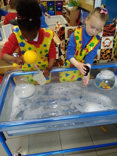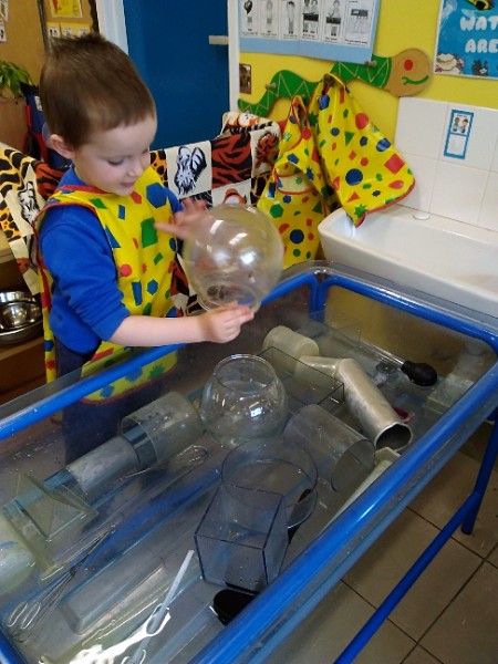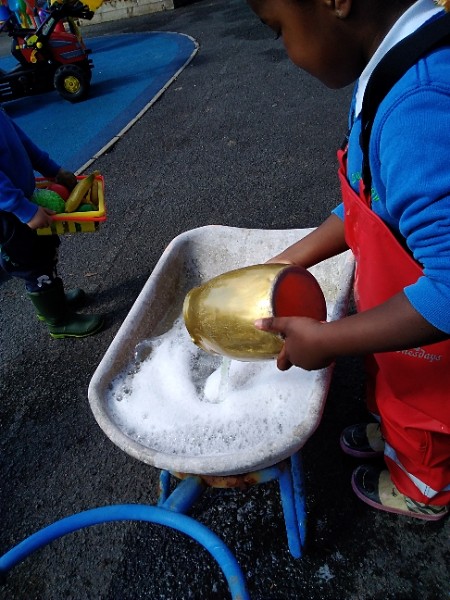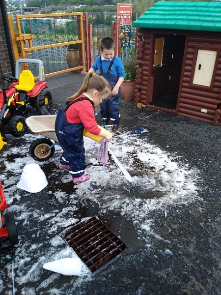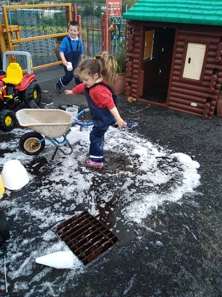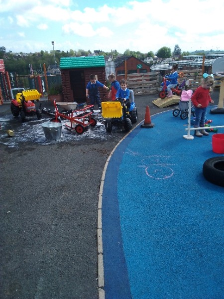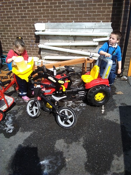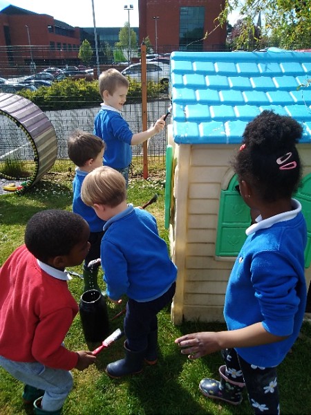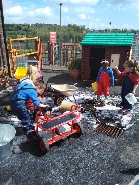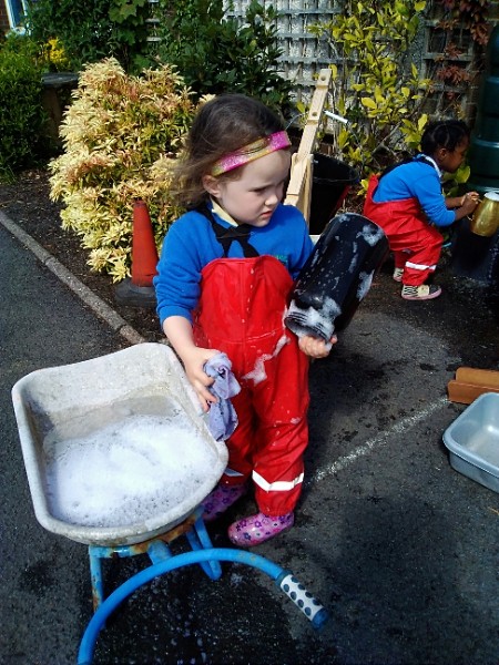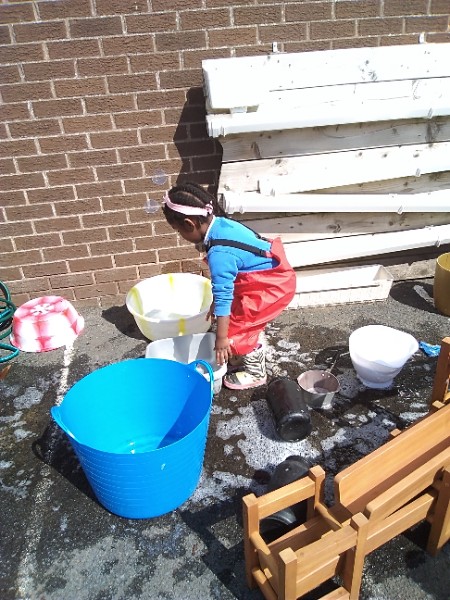 The children love nothing more than playing in water outdoors and indoors too. The children learn to pour, balance and hold heavy containers, move their bodies, share and take turns and work together to solve problems. As well as getting just a bit wet! The children have opened a car wash and have been 'painting' the summer house too.
