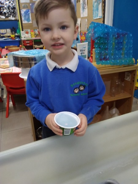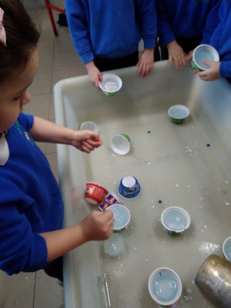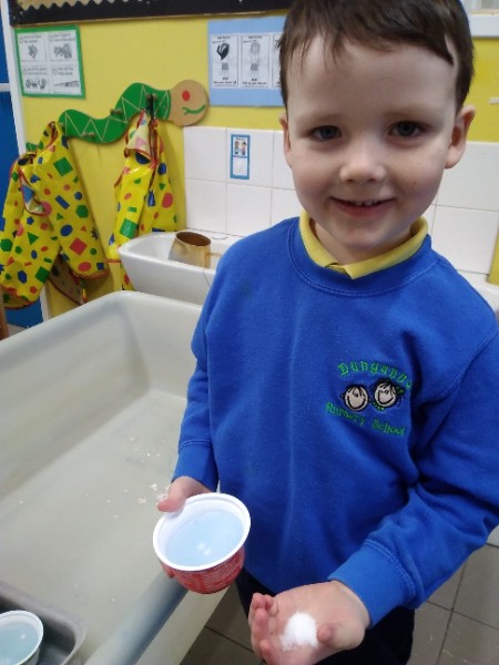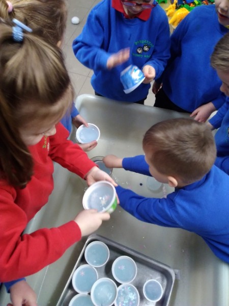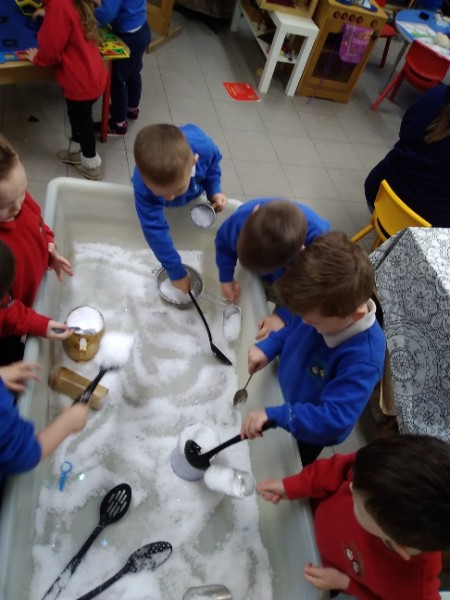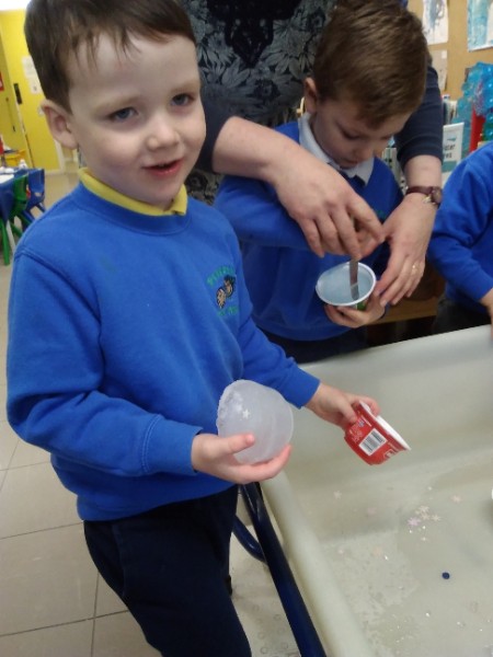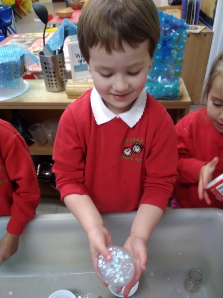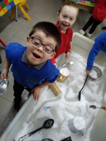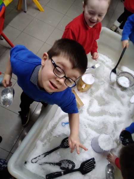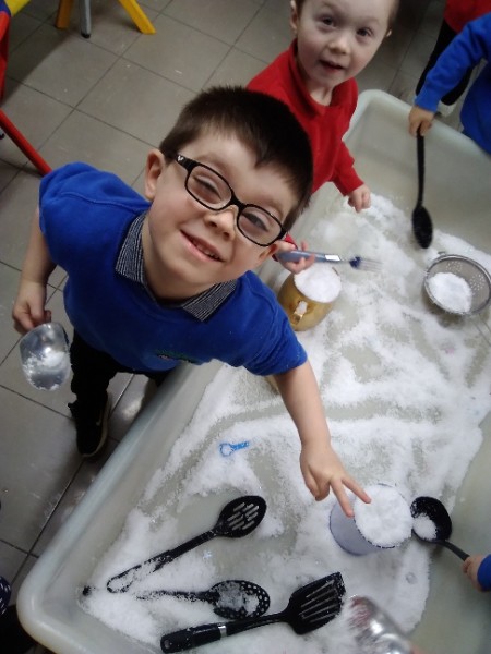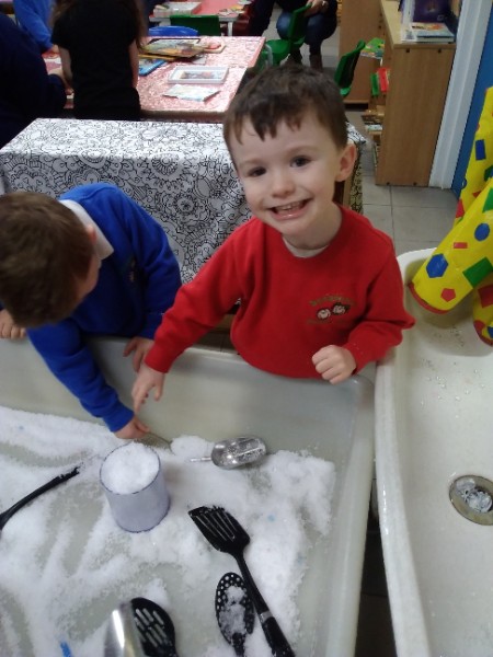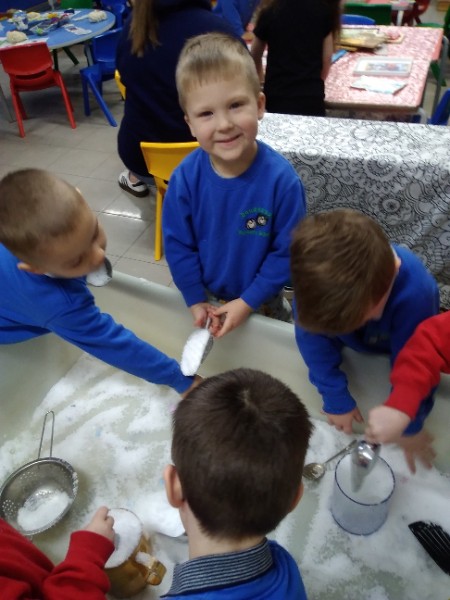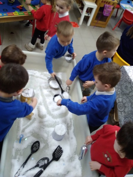 The children have noticed the frosty mornings we have had recently and how cold it feels when playing outdoors. So we thought we'd bring the cold indoors. The children helped make some magic snow to explore in the water tray. They also explored and investigated the icebergs they made last week. It was great fun popping them out of their pots but a bit sad when they melted away. Some of the children squeezed their pots to release their icebergs. James said, "we need some salt" and Ben said, "let's use a knife".
