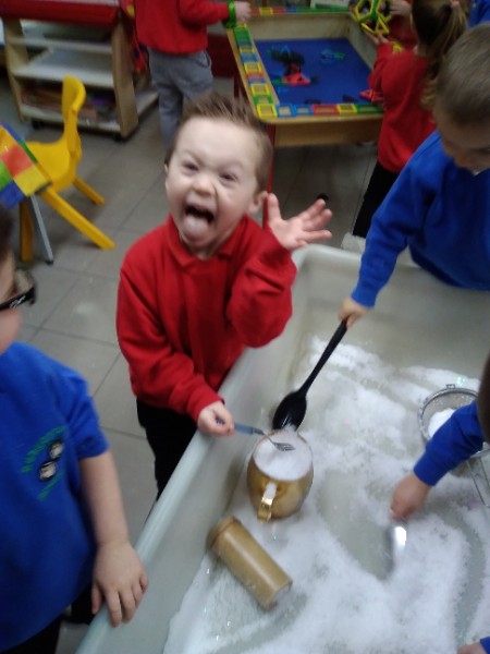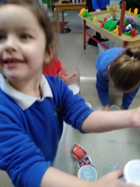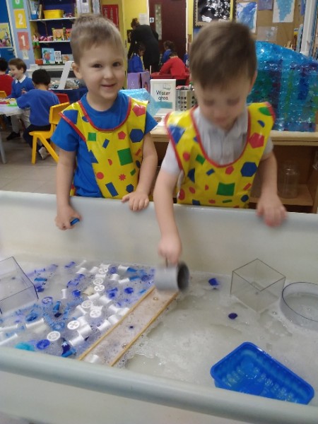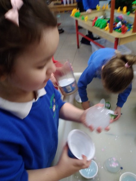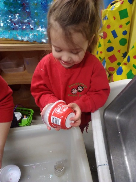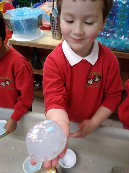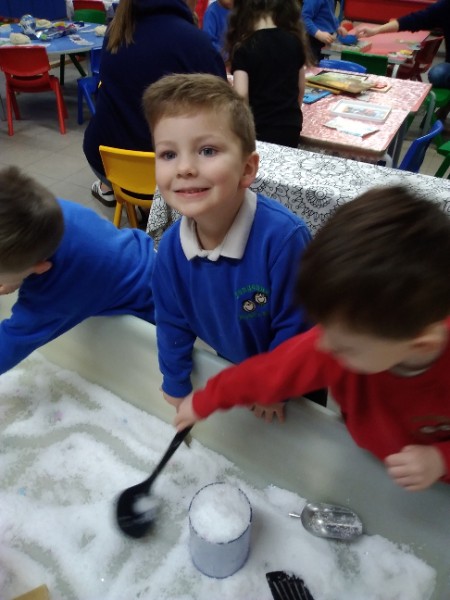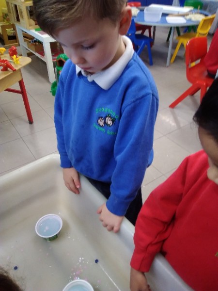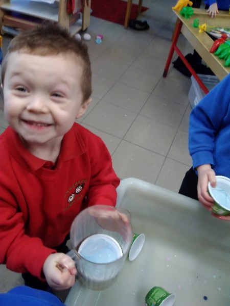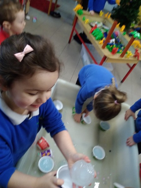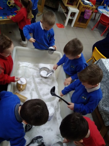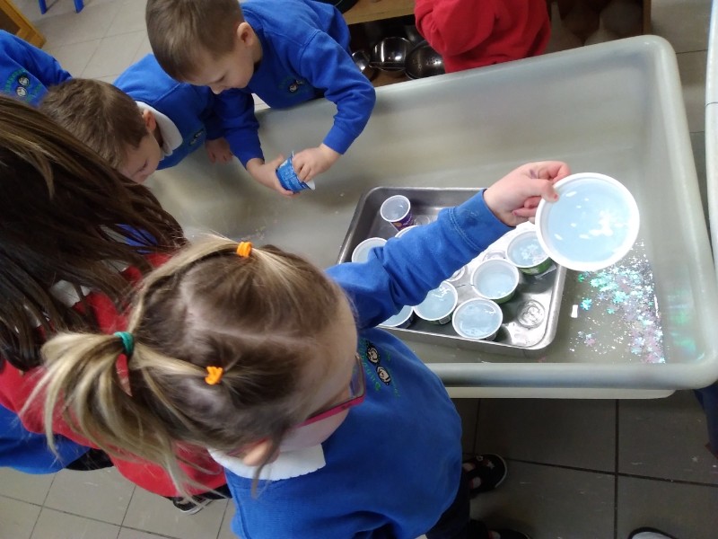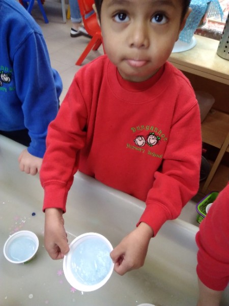 The children have noticed the frosty mornings we have had recently and how cold it feels when playing outdoors. So we thought we'd bring the cold indoors. The children helped make some magic snow to explore in the water tray. They also explored and investigated the icebergs they made last week. It was great fun popping them out of their pots but a bit sad when they melted away. Some of the children squeezed their pots to release their icebergs. James said, "we need some salt" and Ben said, "let's use a knife".